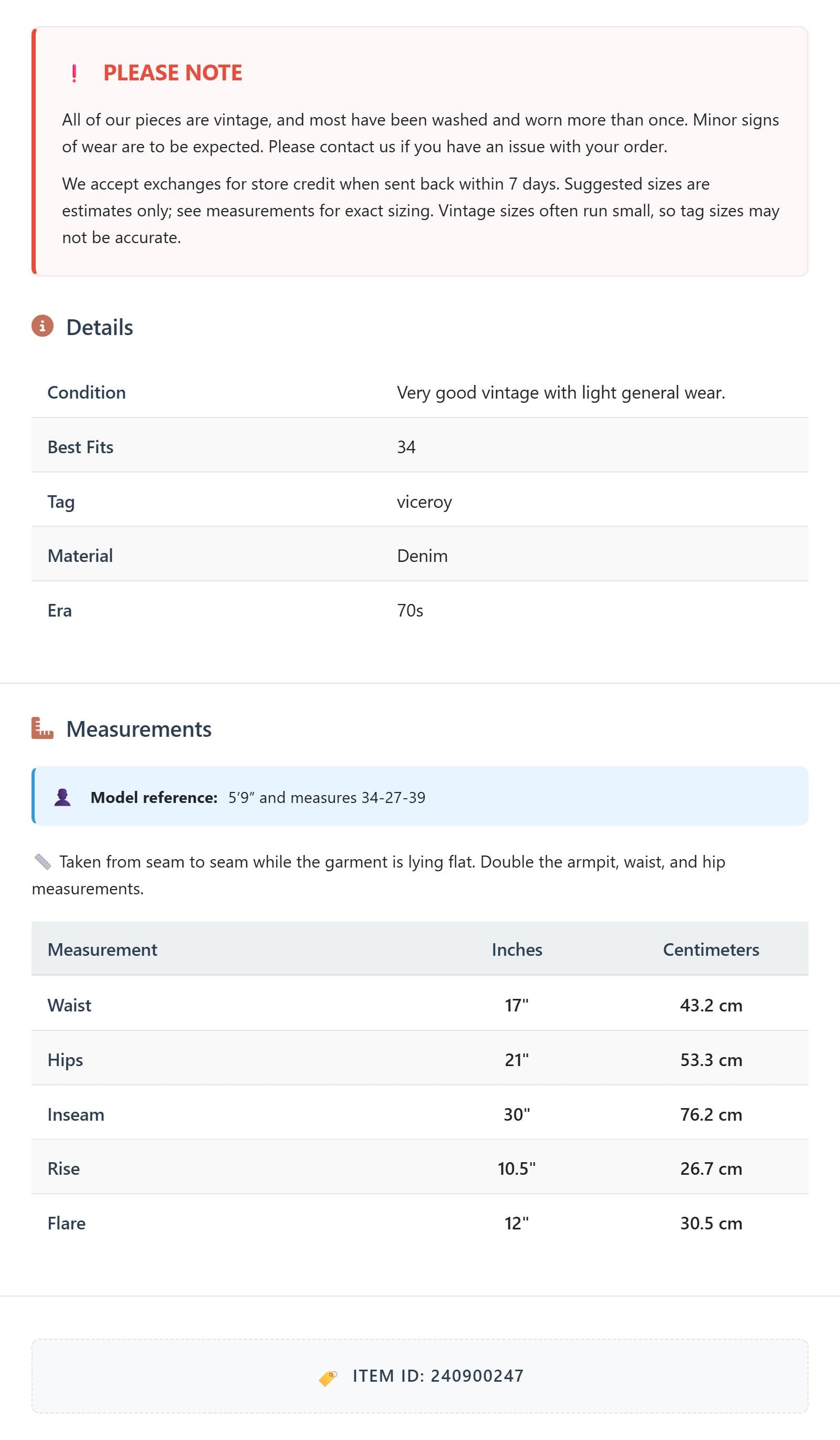 Vintage denim was usually made without any stretch, unlike modern jeans. Check the measurements to ensure proper fit, and remember to give yourself a little wiggle room in the waist and hips, depending on your preferred fit.