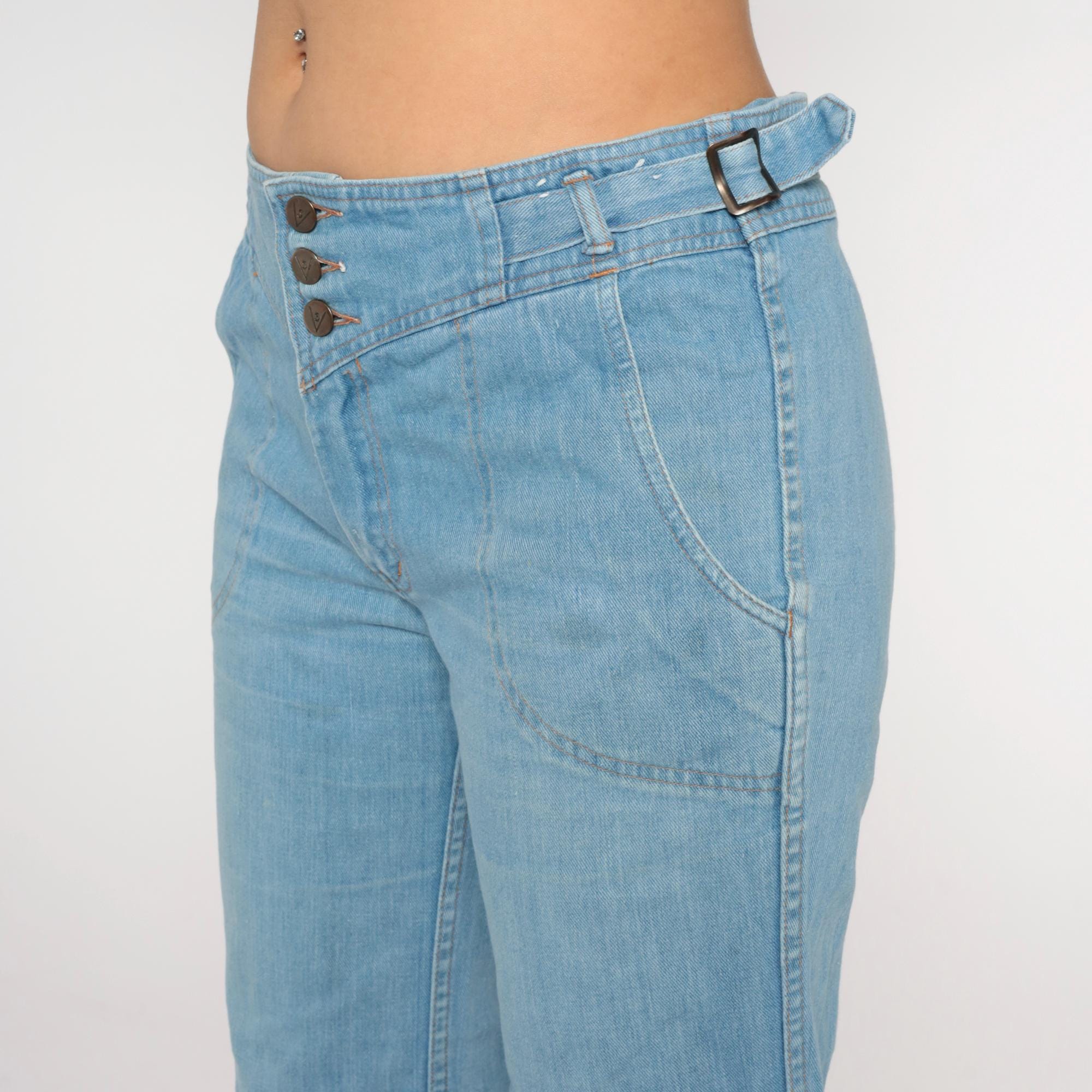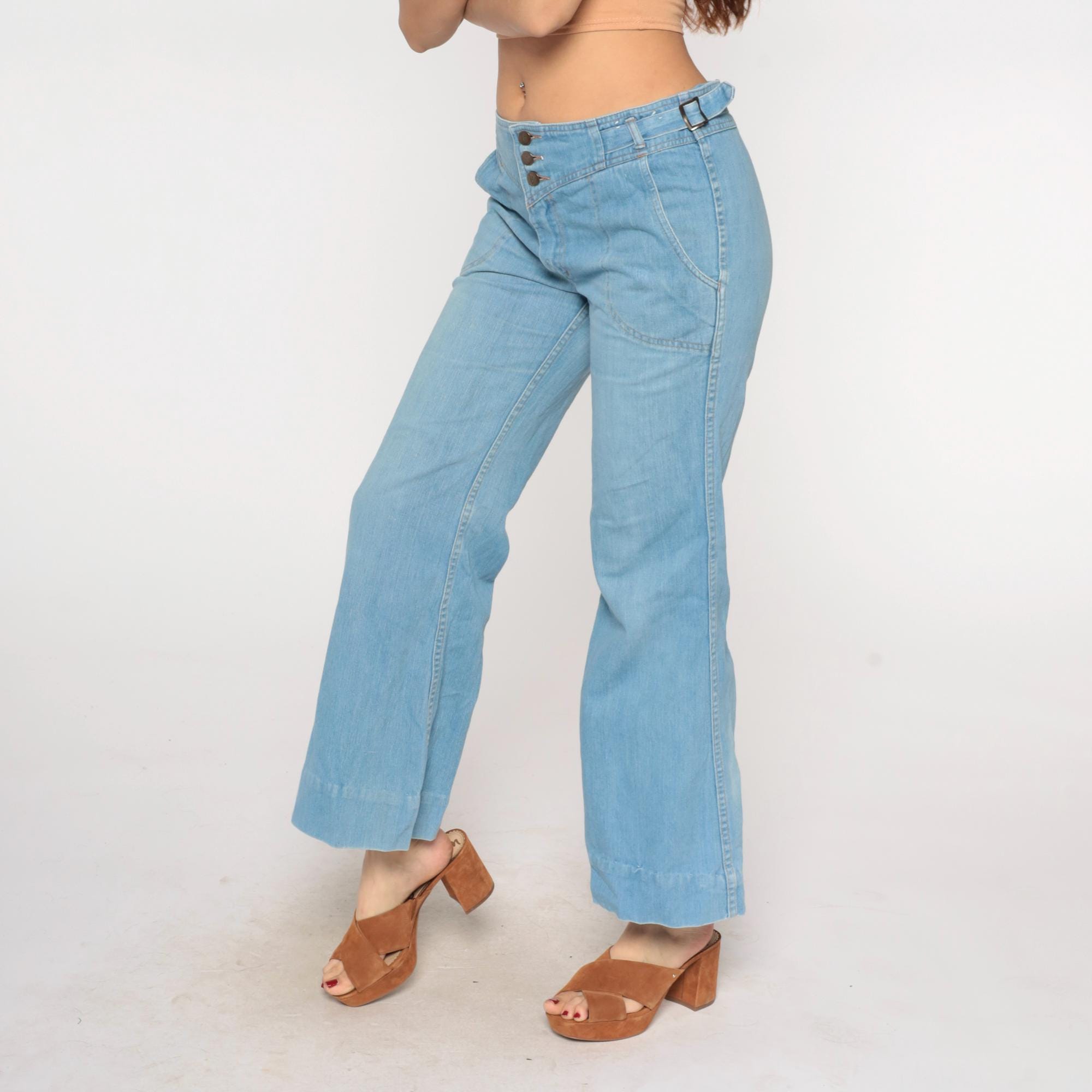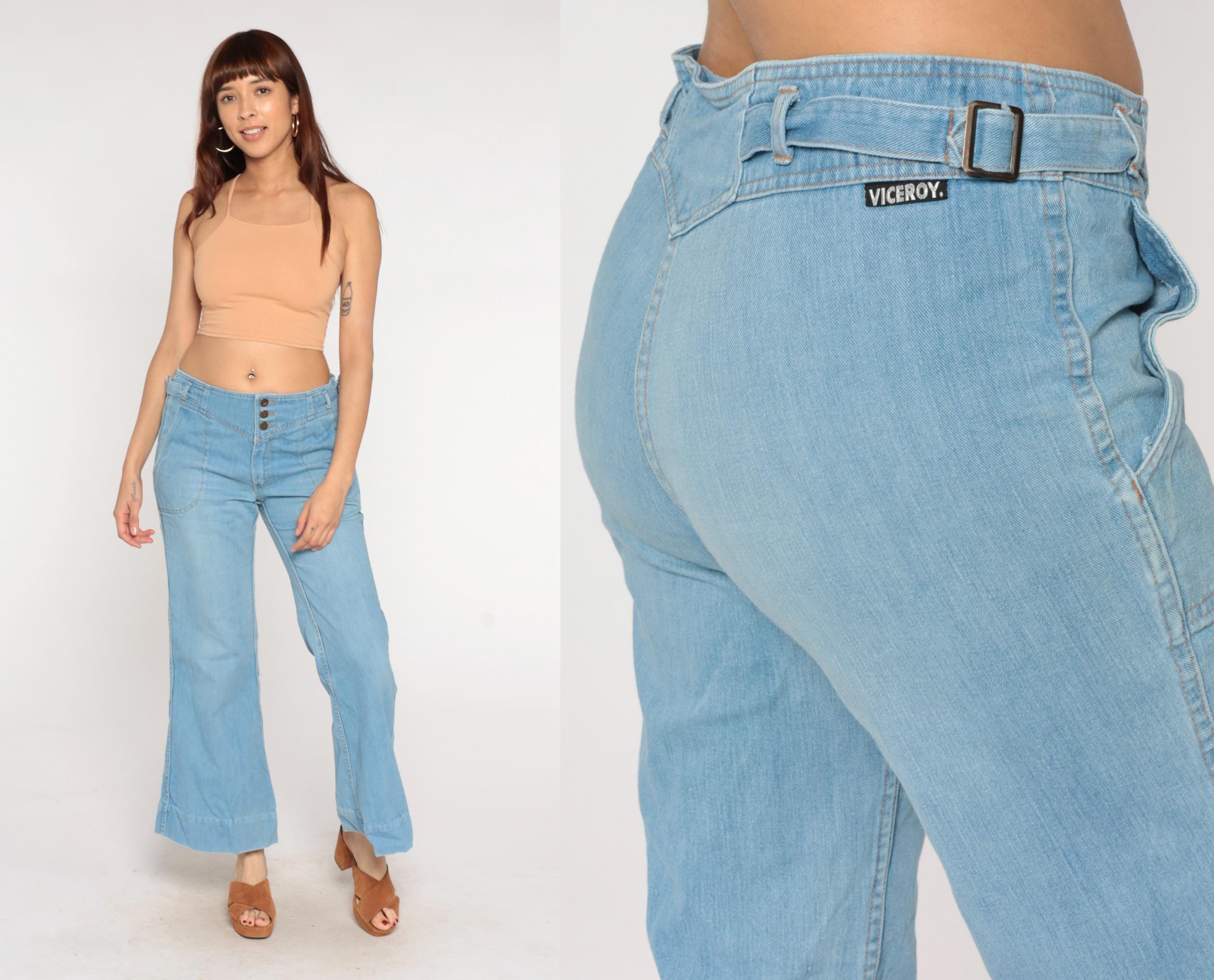 1970s Viceroy jeans feature light blue denim with a flattering high-waisted fit. Triple button fly front closure. Curved hip pockets with topstitching detail. Side belt loops with matching denim belt and metal buckle closure. Wide leg flare from knee to hem creating the classic bell bottom silhouette.
