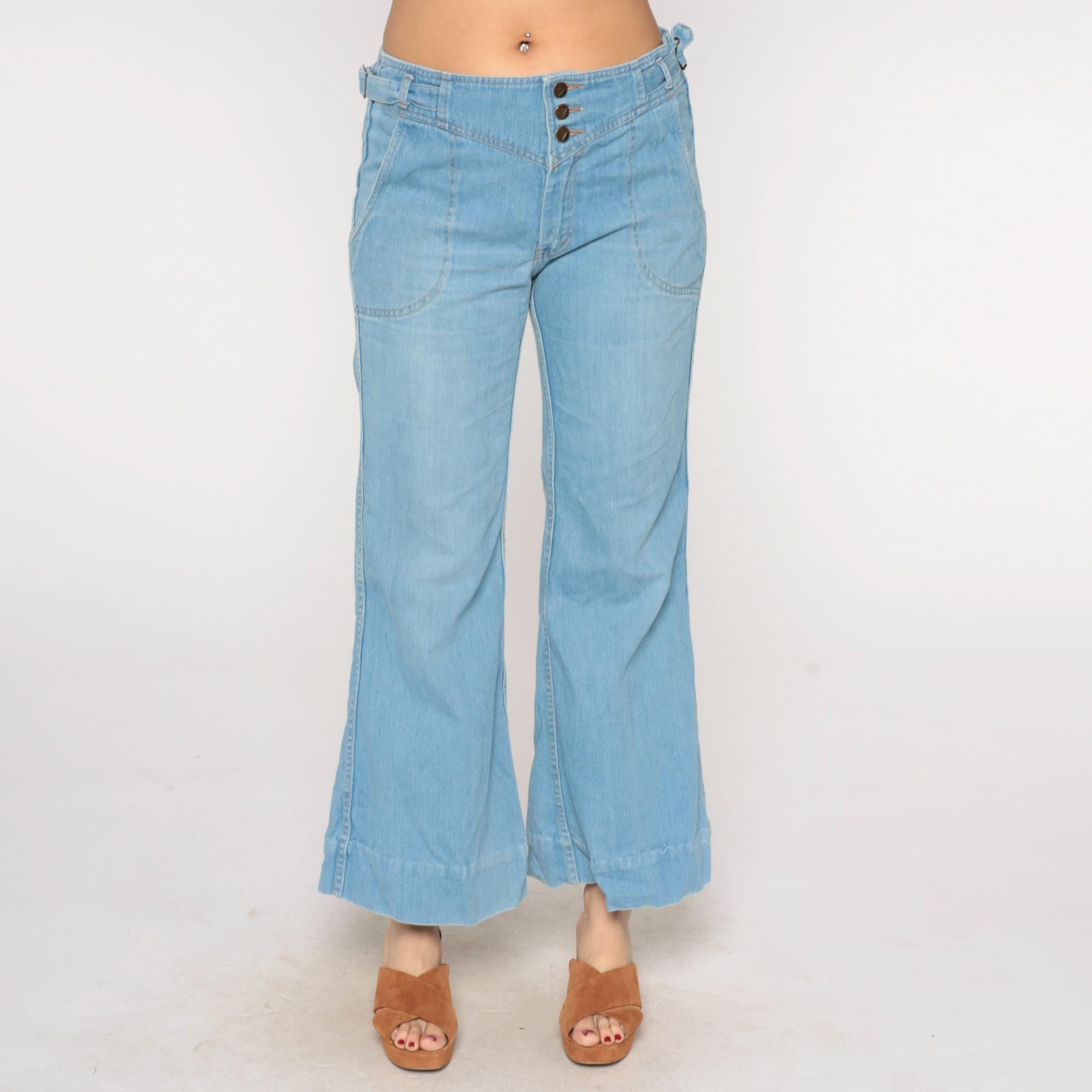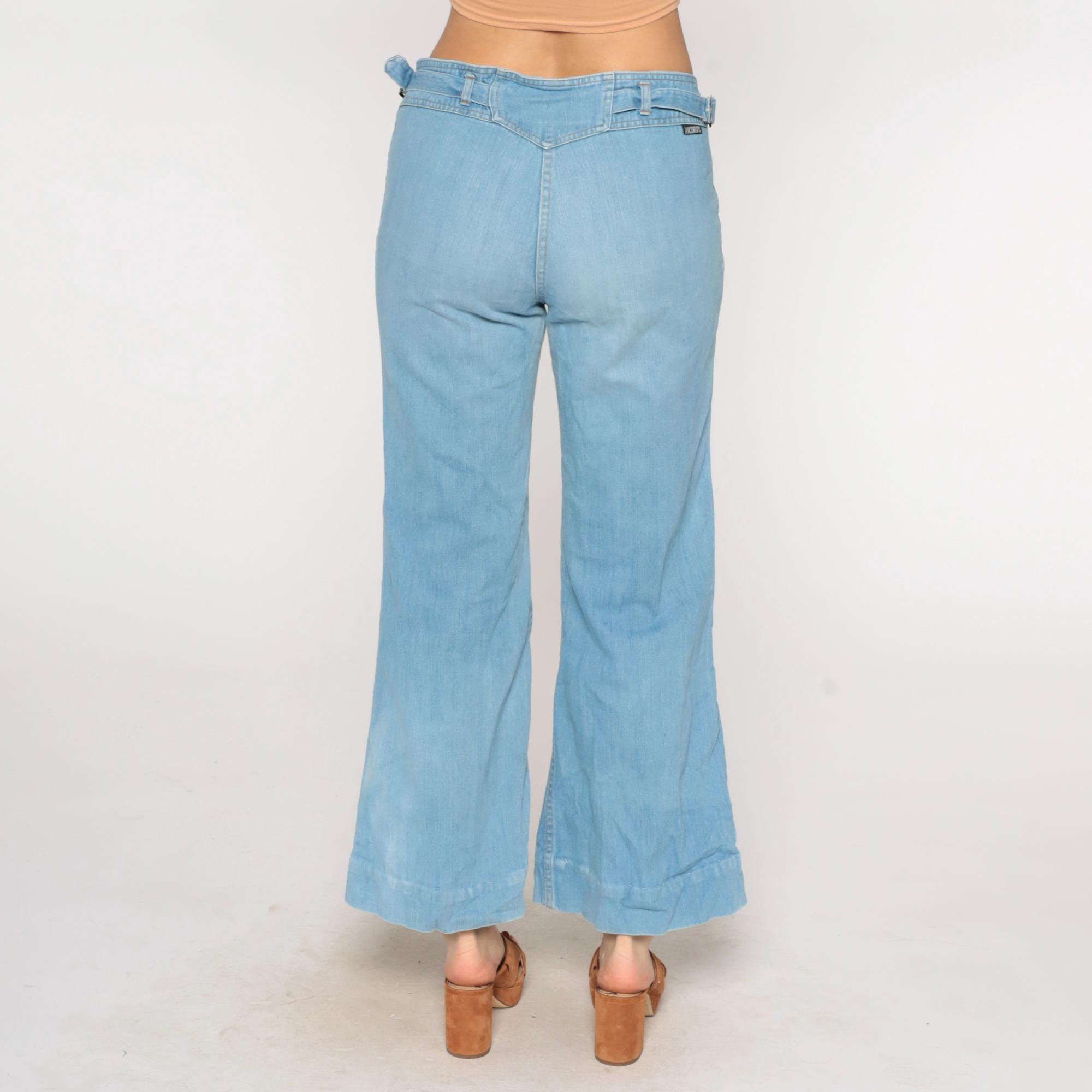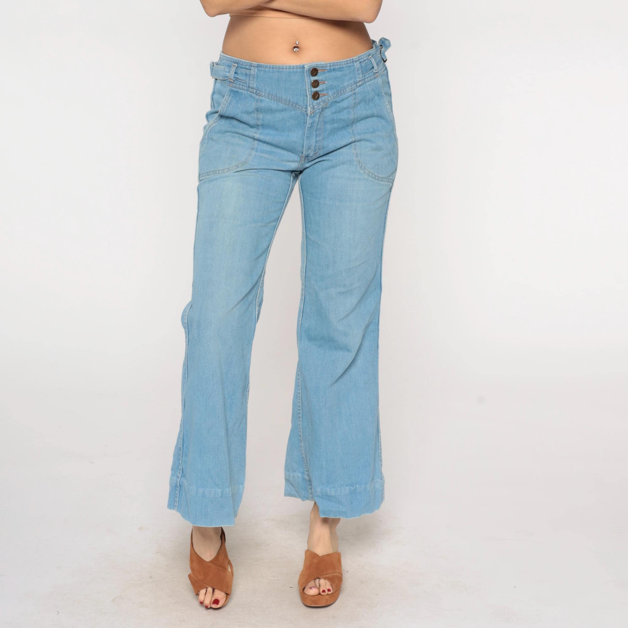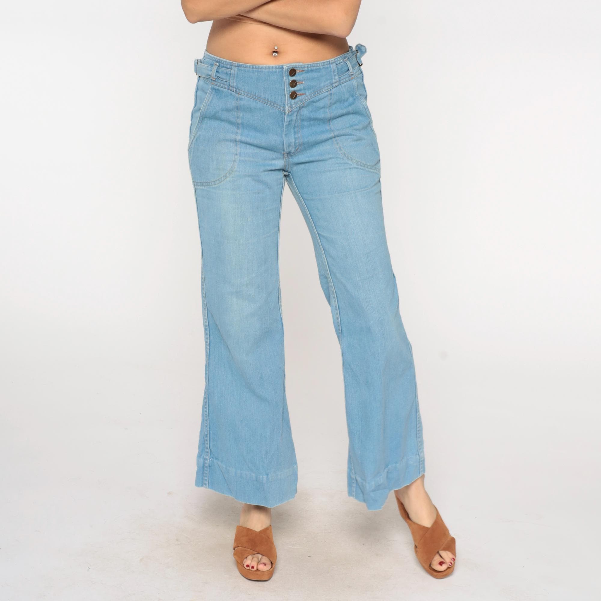 1970s Viceroy jeans feature light blue denim with a flattering high-waisted fit. Triple button fly front closure. Curved hip pockets with topstitching detail. Side belt loops with matching denim belt and metal buckle closure. Wide leg flare from knee to hem creating the classic bell bottom silhouette.