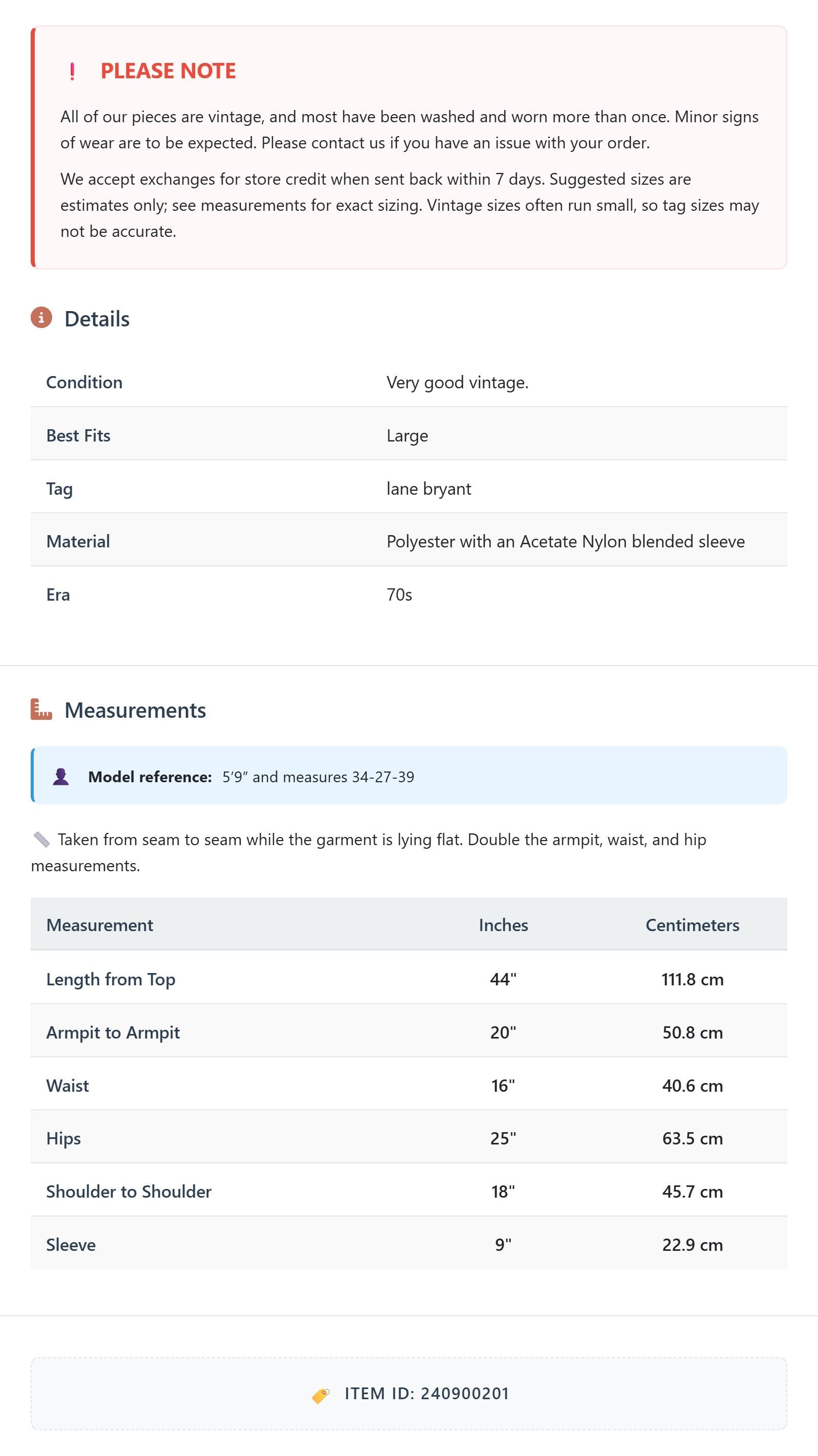 All of our pieces are vintage, and most have been washed and worn more than once. Minor signs of wear are to be expected. Please contact us if you have an issue with your order. We accept exchanges for store credit when sent back within 7 days.
