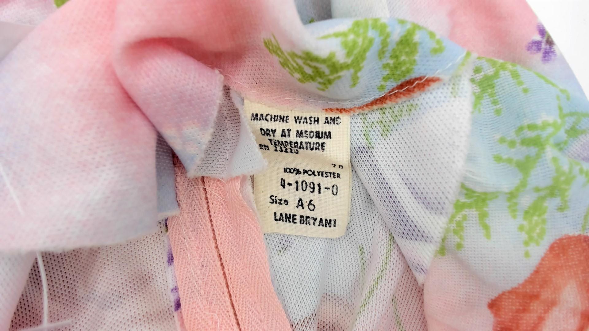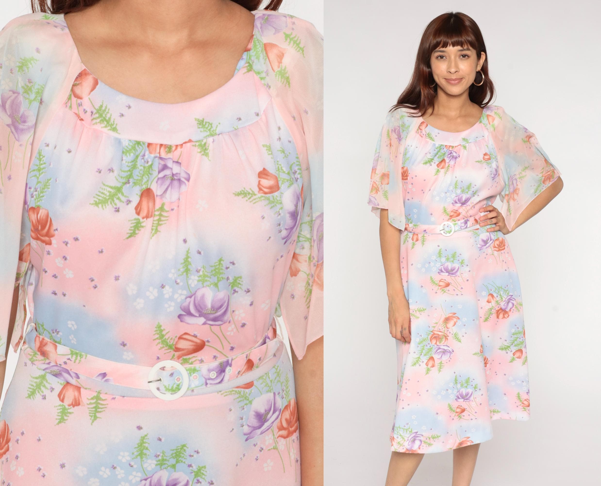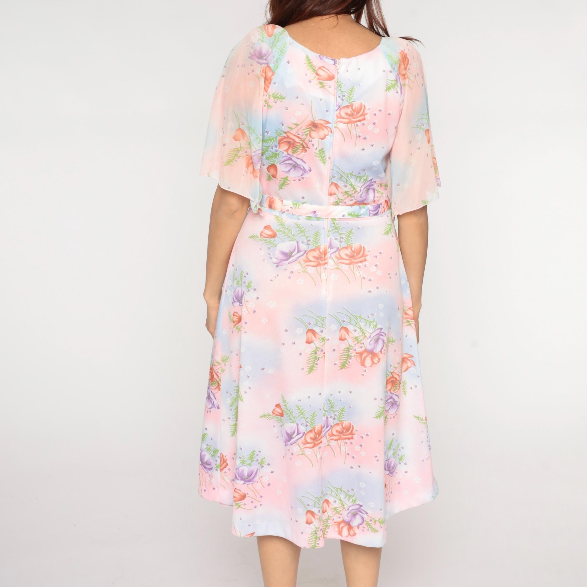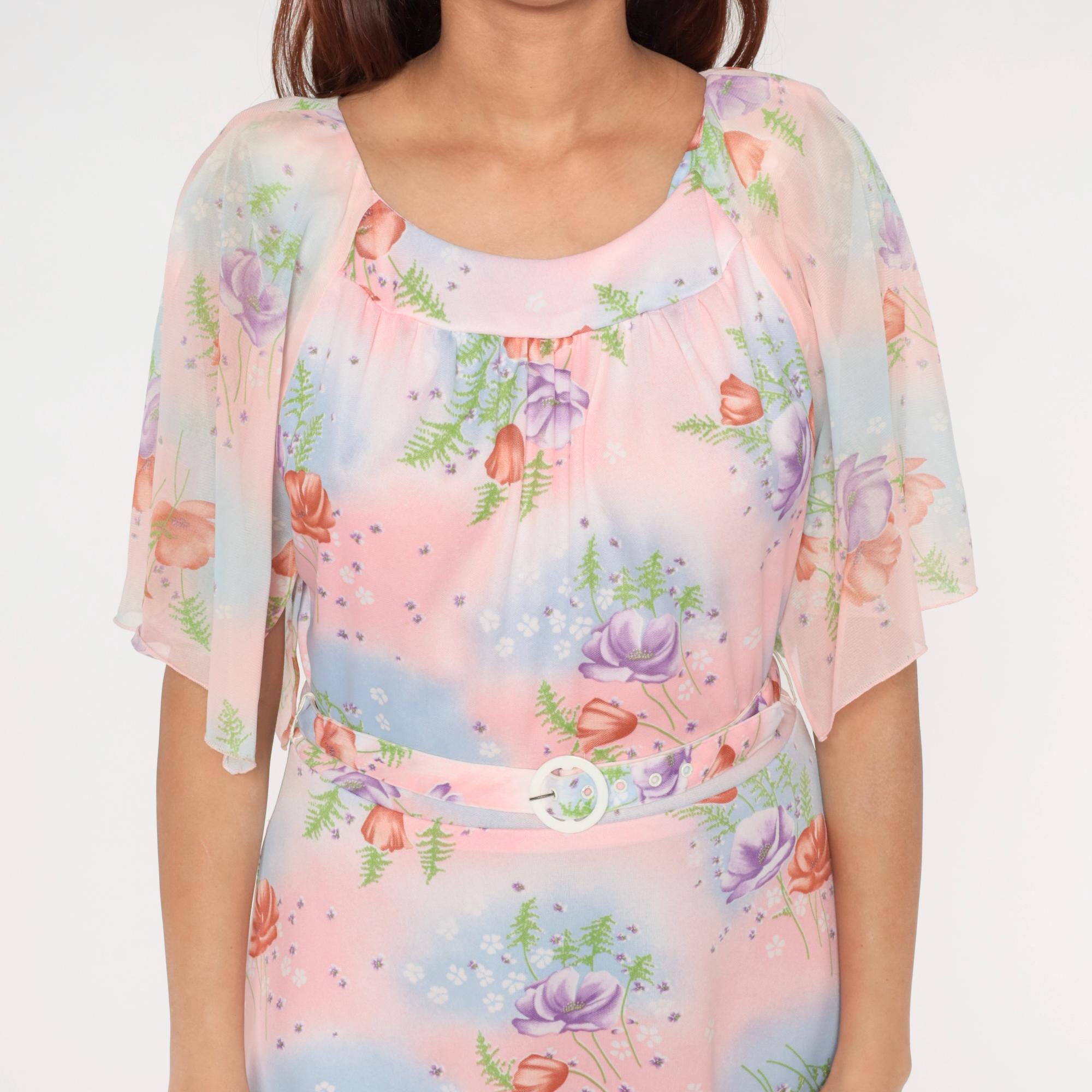 1970s Lane Bryant dress features a soft pastel watercolor print with pink, blue, and peach roses scattered across a dreamy gradient background with delicate fern details. The dress has a Peter Pan collar and flutter sleeves in sheer fabric. Gathered detail below the collar creates a romantic neckline. Belted waist with white buckle closure.