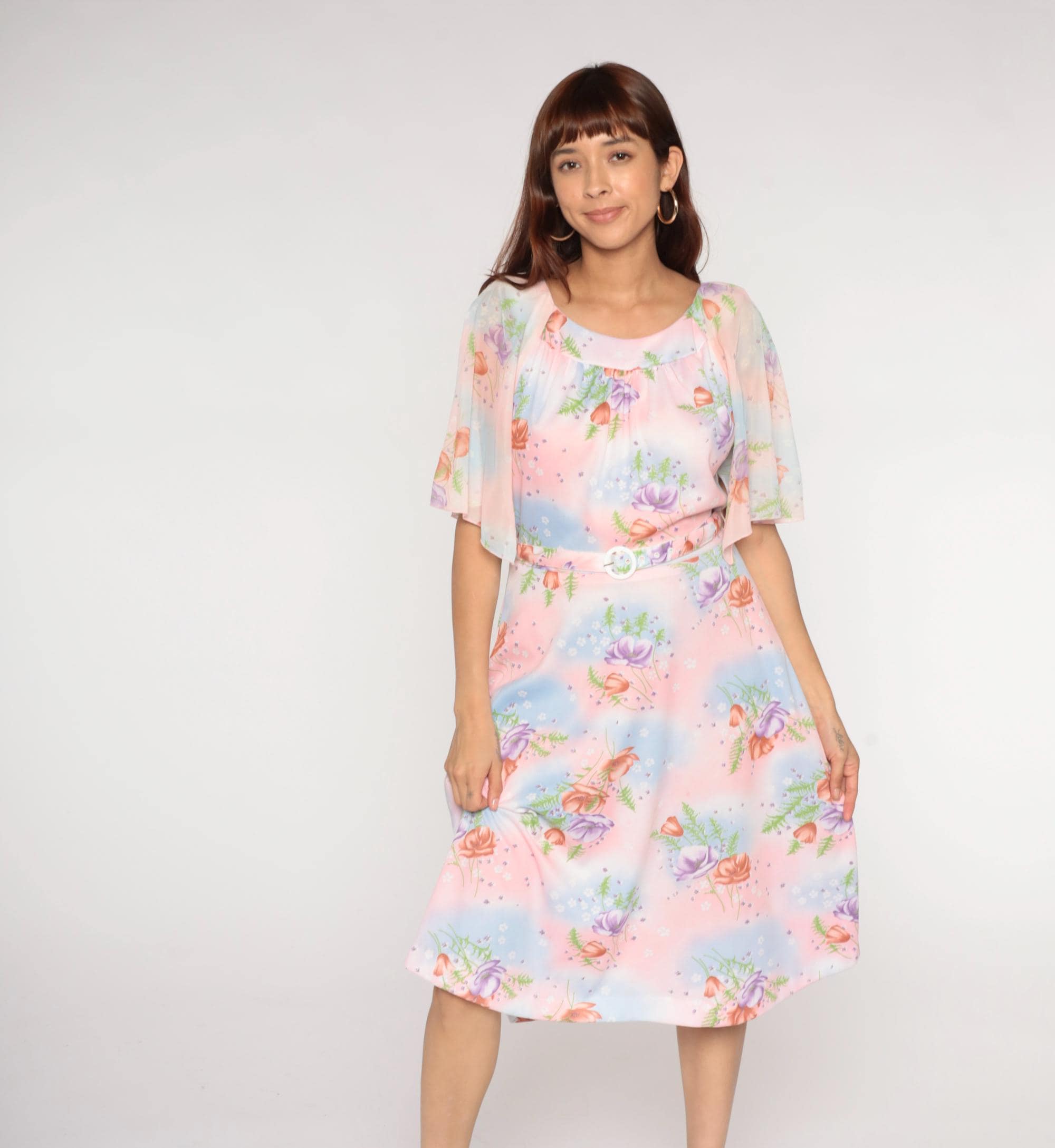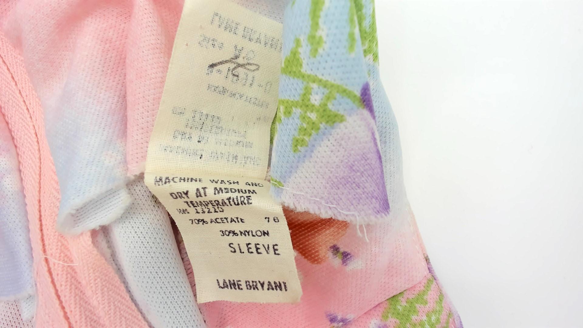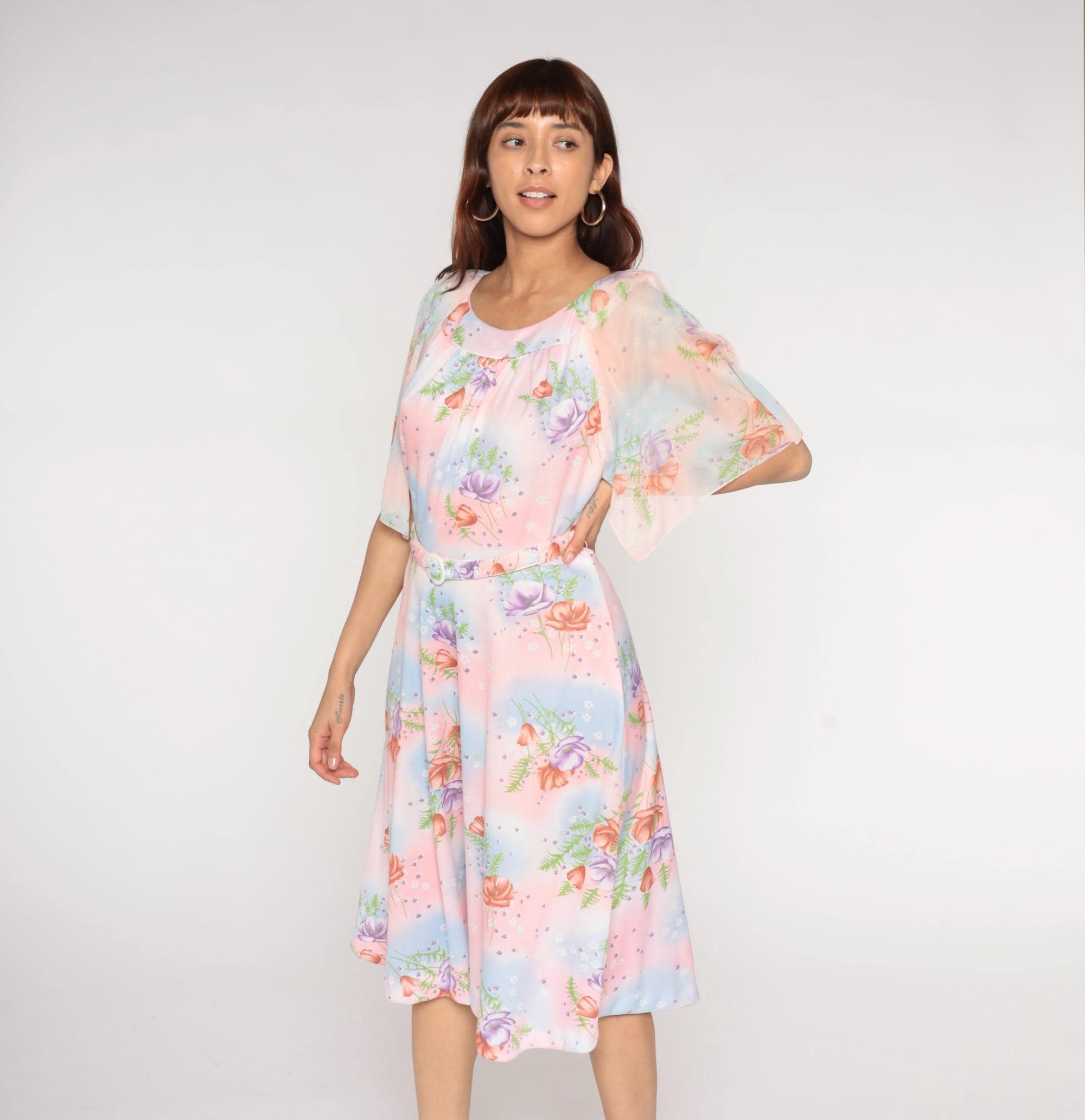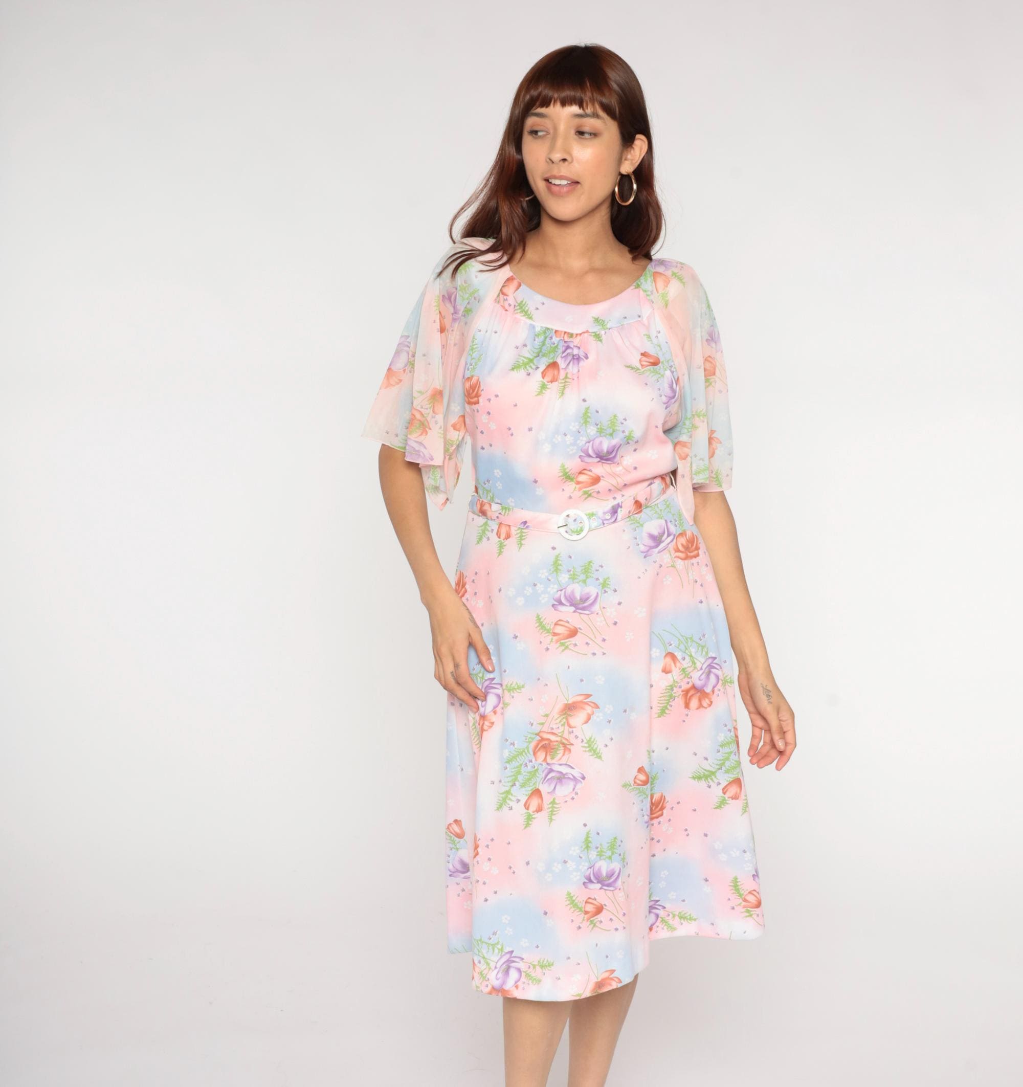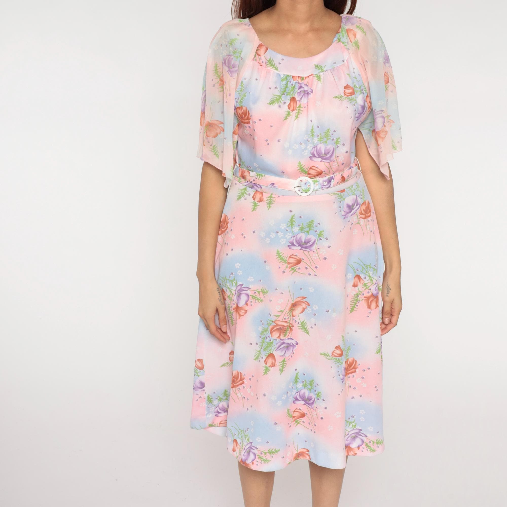 1970s Lane Bryant dress features a soft pastel watercolor print with pink, blue, and peach roses scattered across a dreamy gradient background with delicate fern details. The dress has a Peter Pan collar and flutter sleeves in sheer fabric. Gathered detail below the collar creates a romantic neckline. Belted waist with white buckle closure.