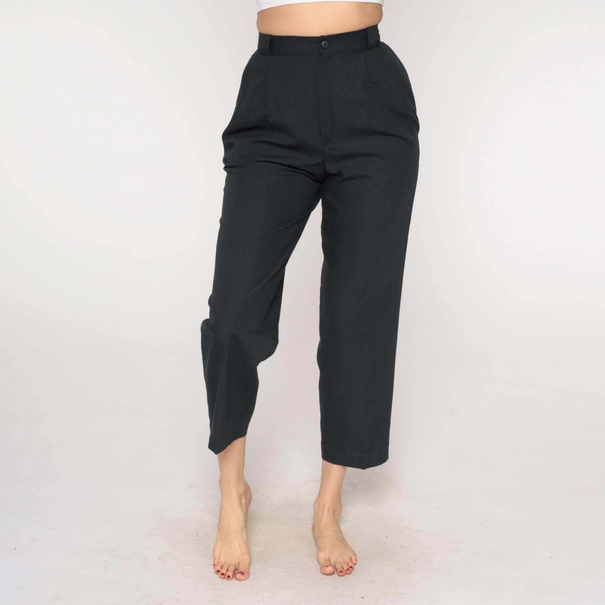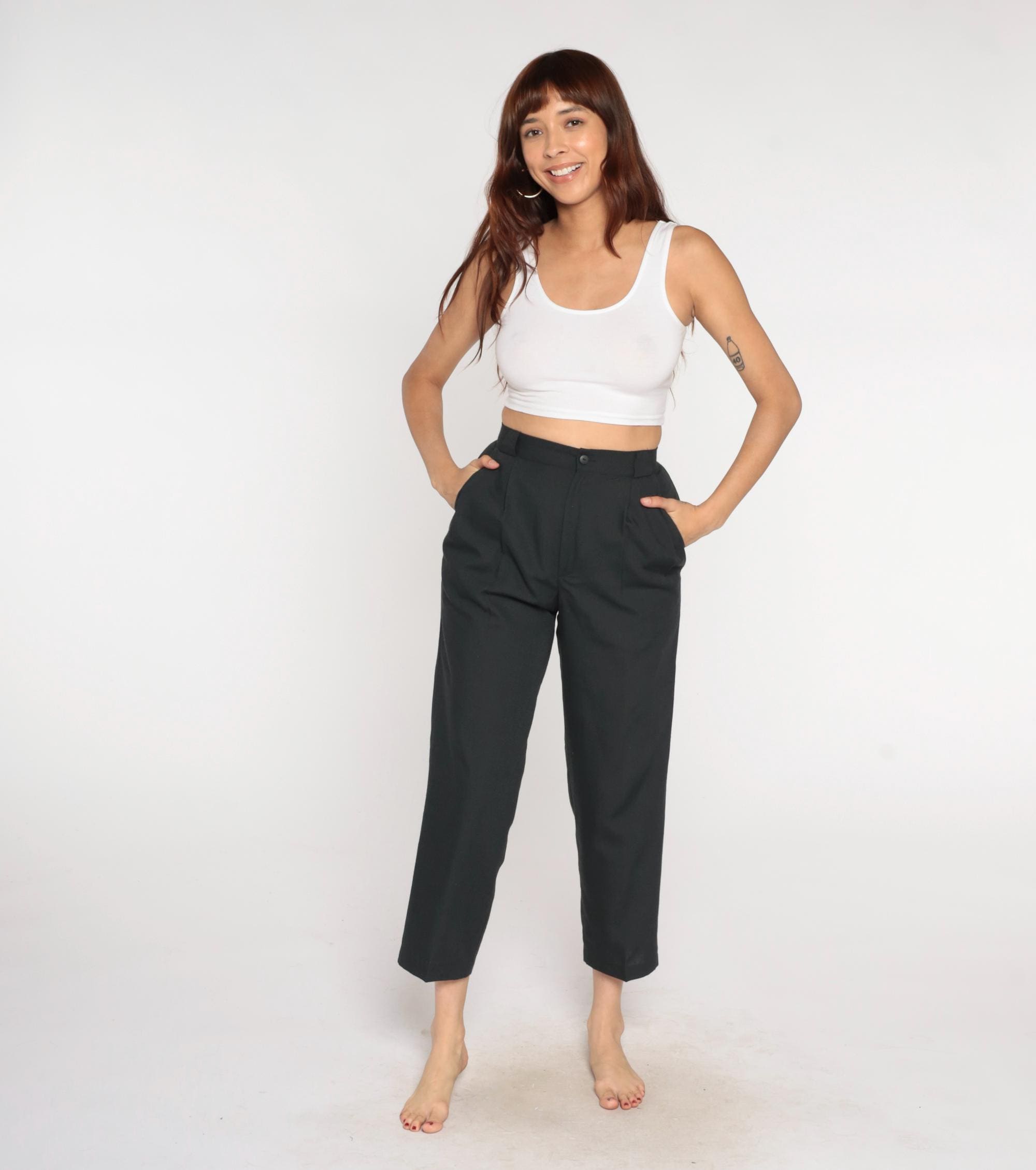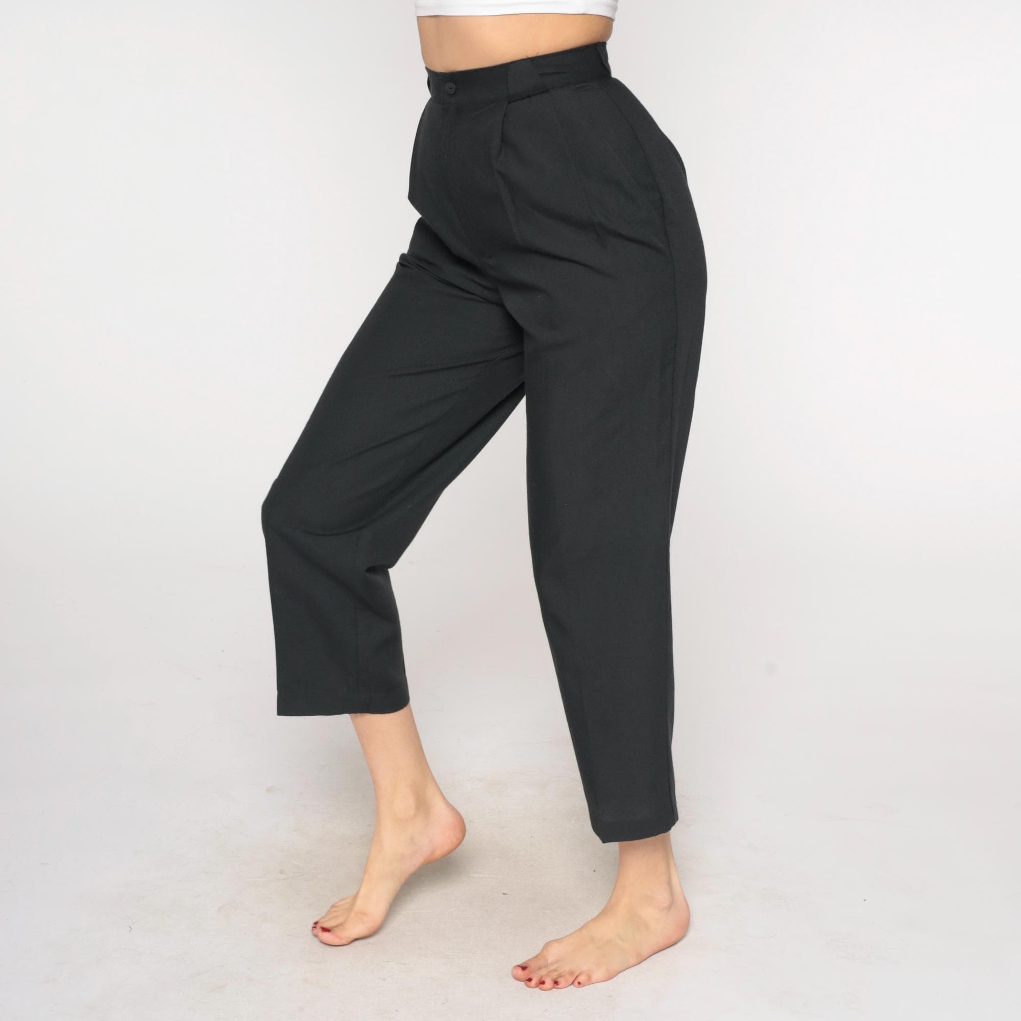 1980s black pleated trousers featuring a high waist and cropped tapered leg. These pants include front pleats, belt loops, and side pockets with a button and zip closure.