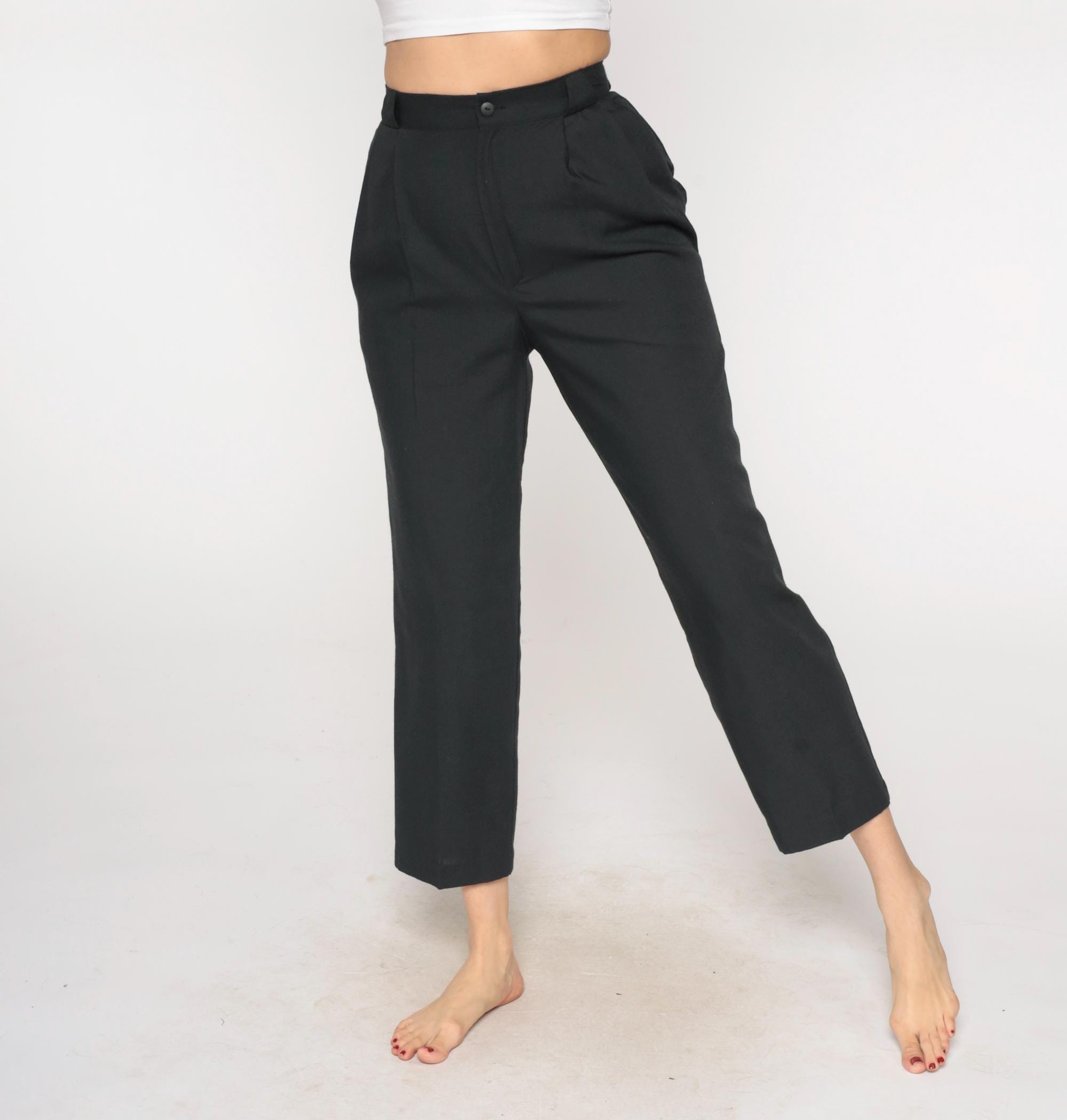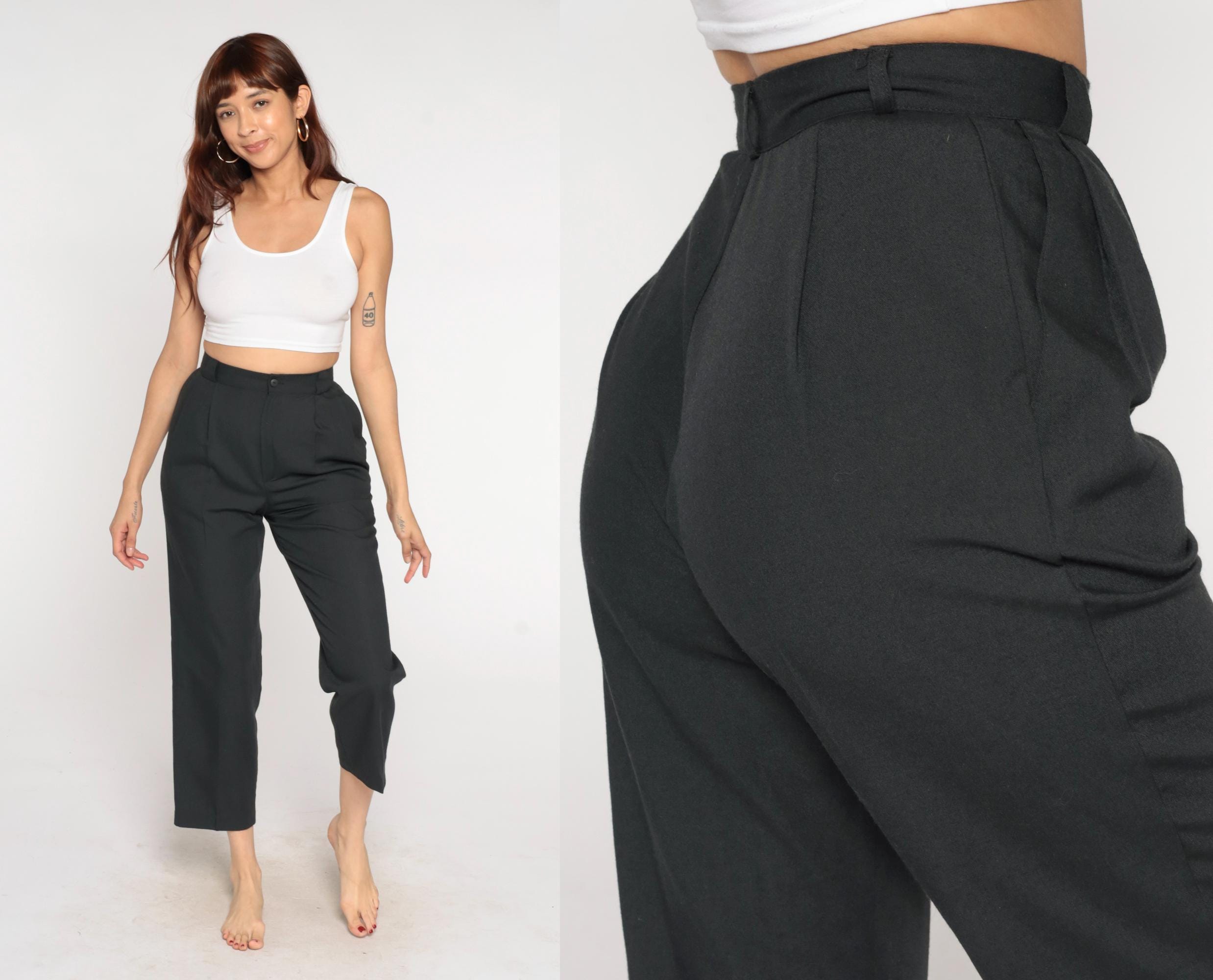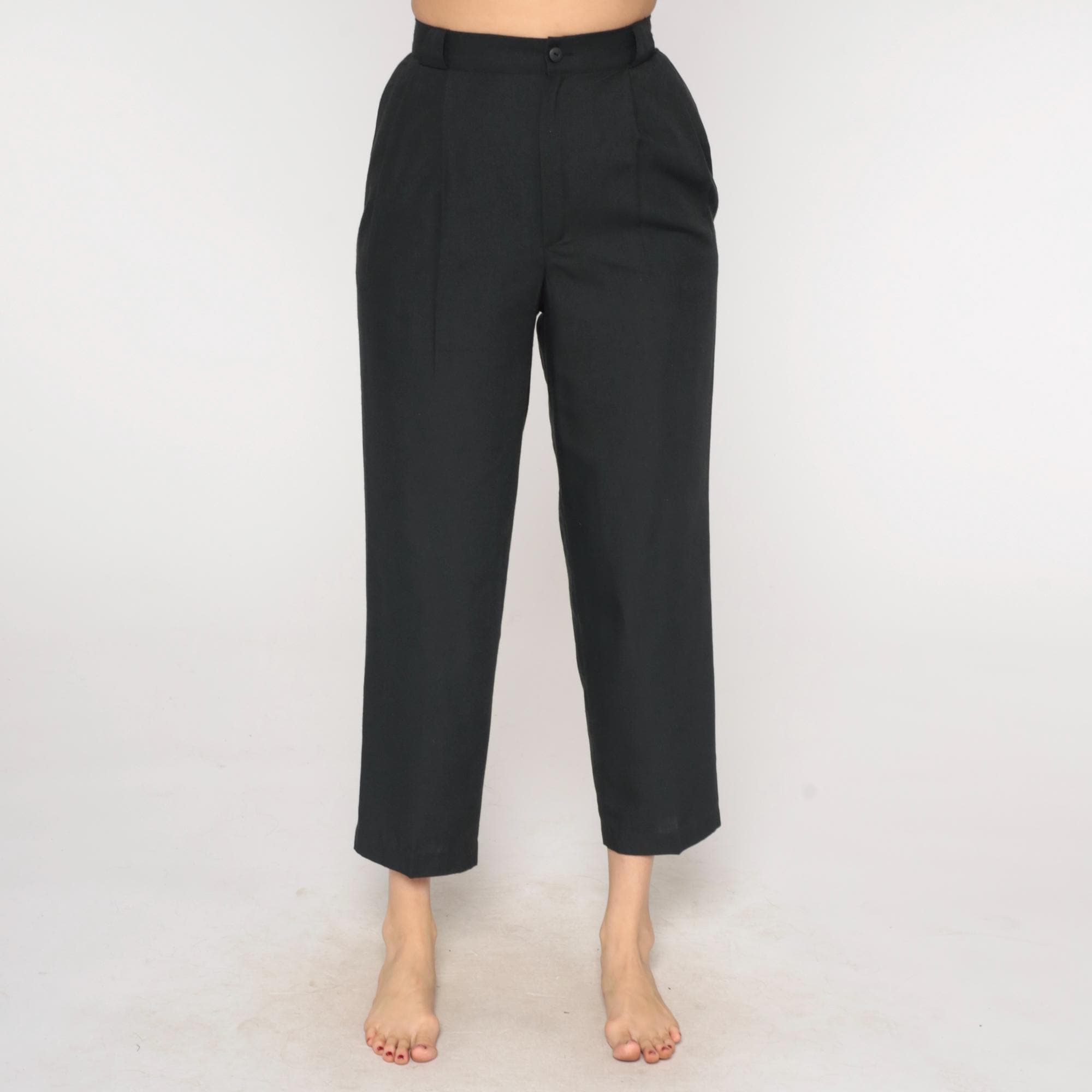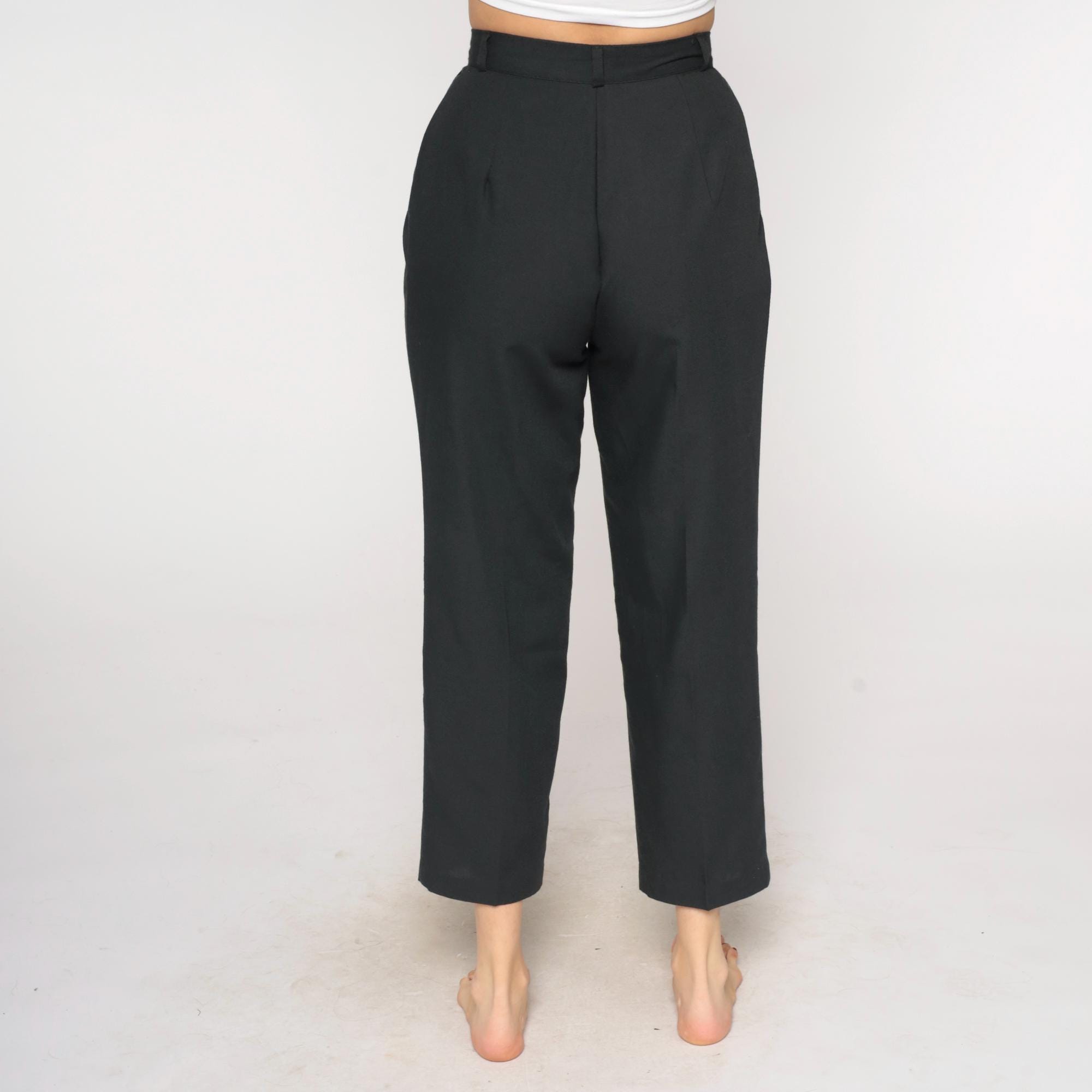 1980s black pleated trousers featuring a high waist and cropped tapered leg. These pants include front pleats, belt loops, and side pockets with a button and zip closure.