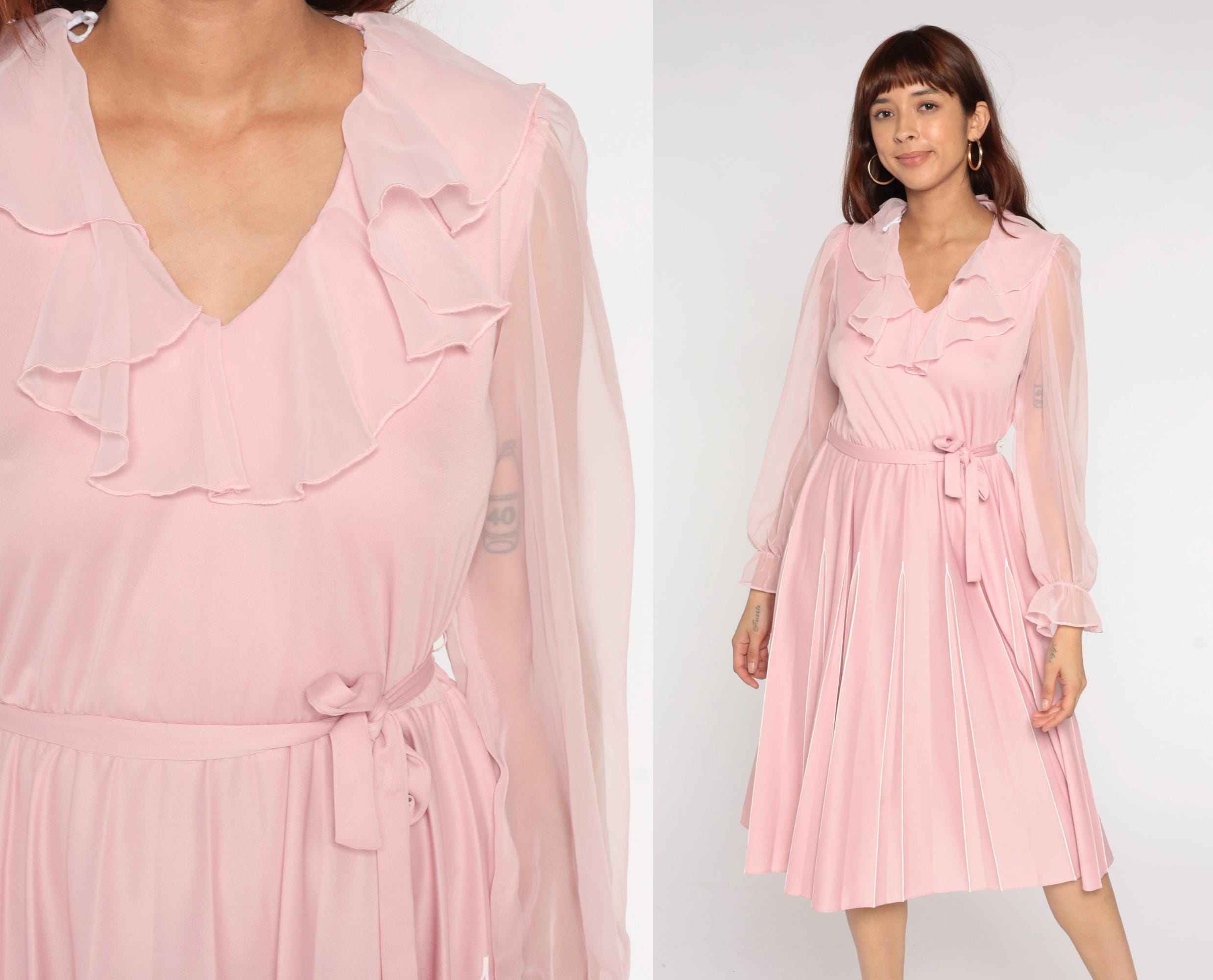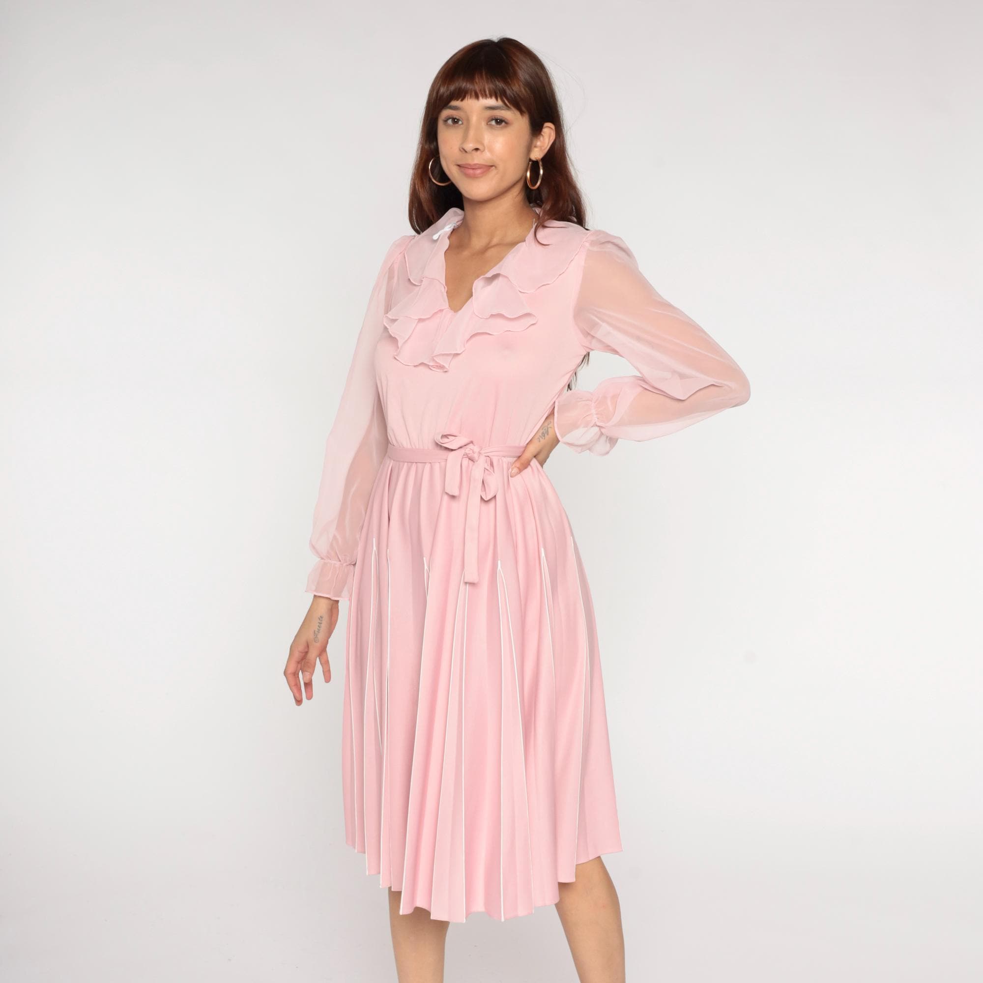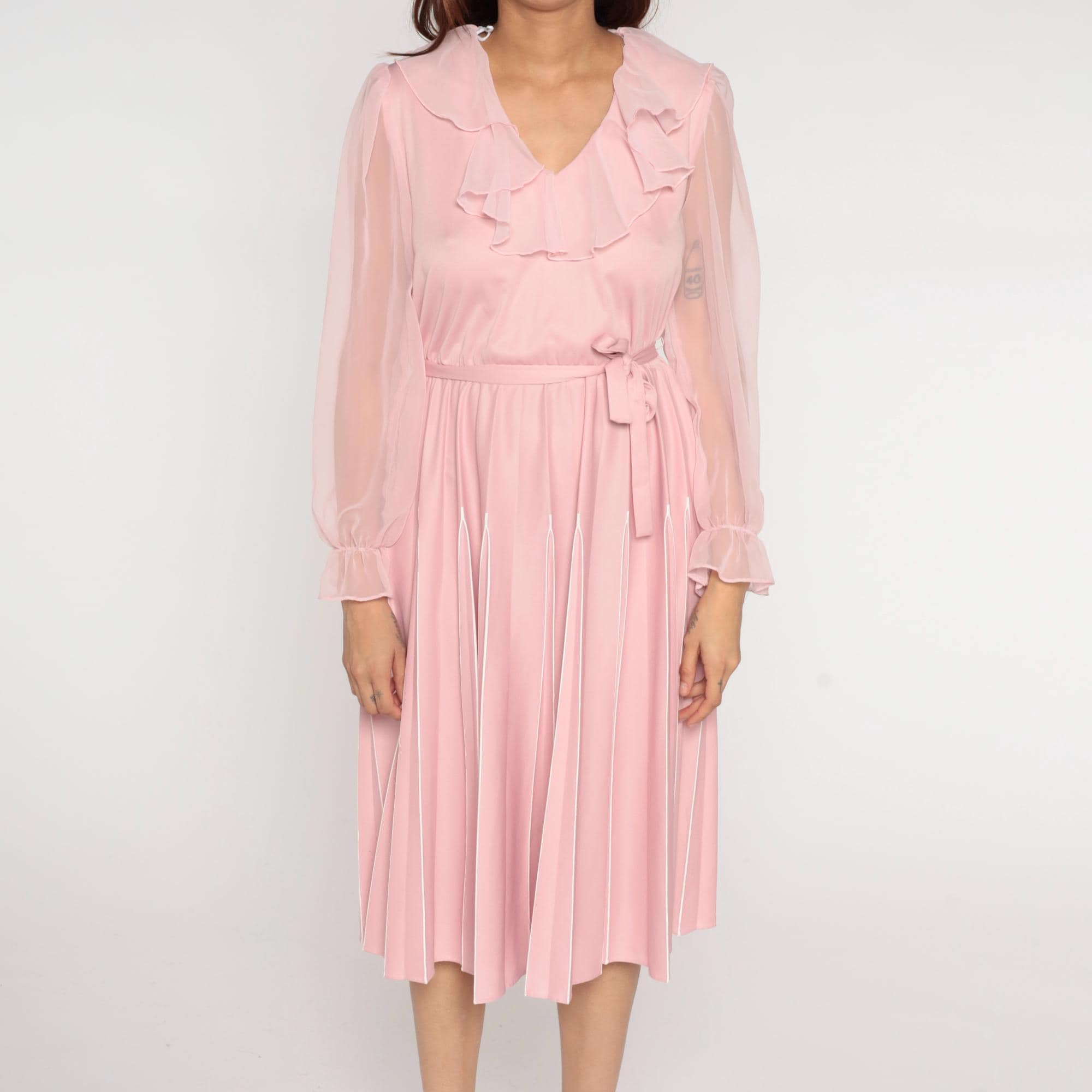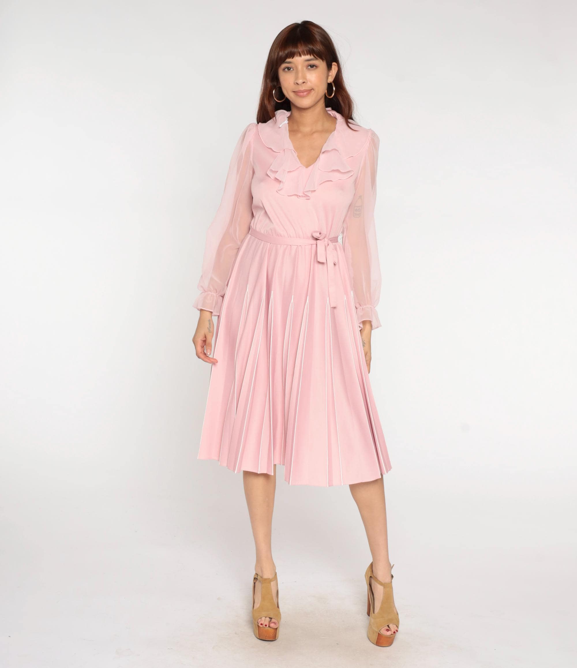 70s pale pink midi dress by Riccardo. Features a beautiful ruffled V-neckline and sheer long sleeves with gathered cuffs. The dress has a flattering fitted bodice with attached tie belt and a pleated skirt.