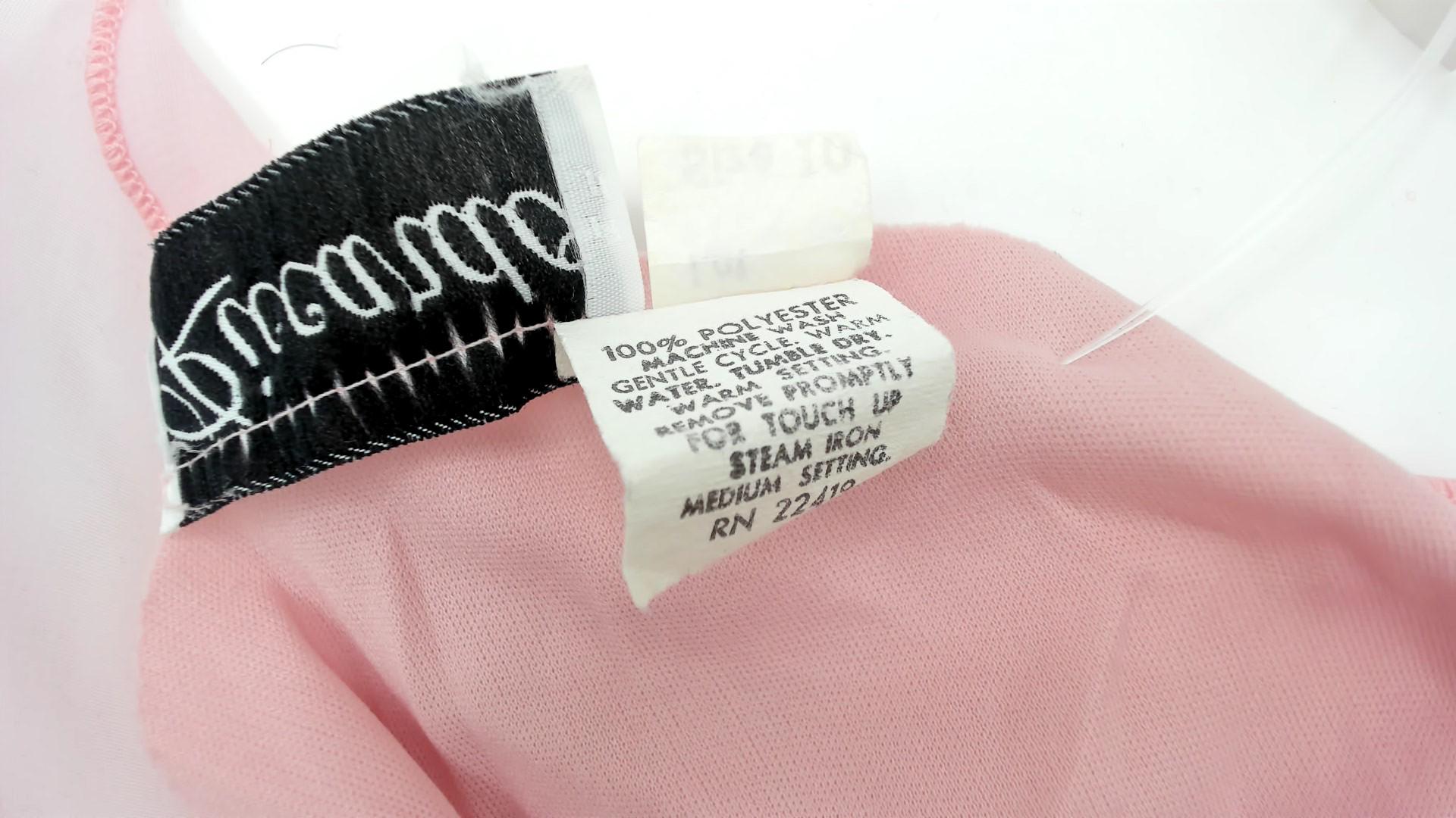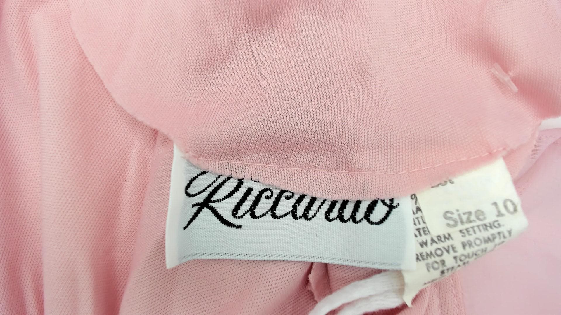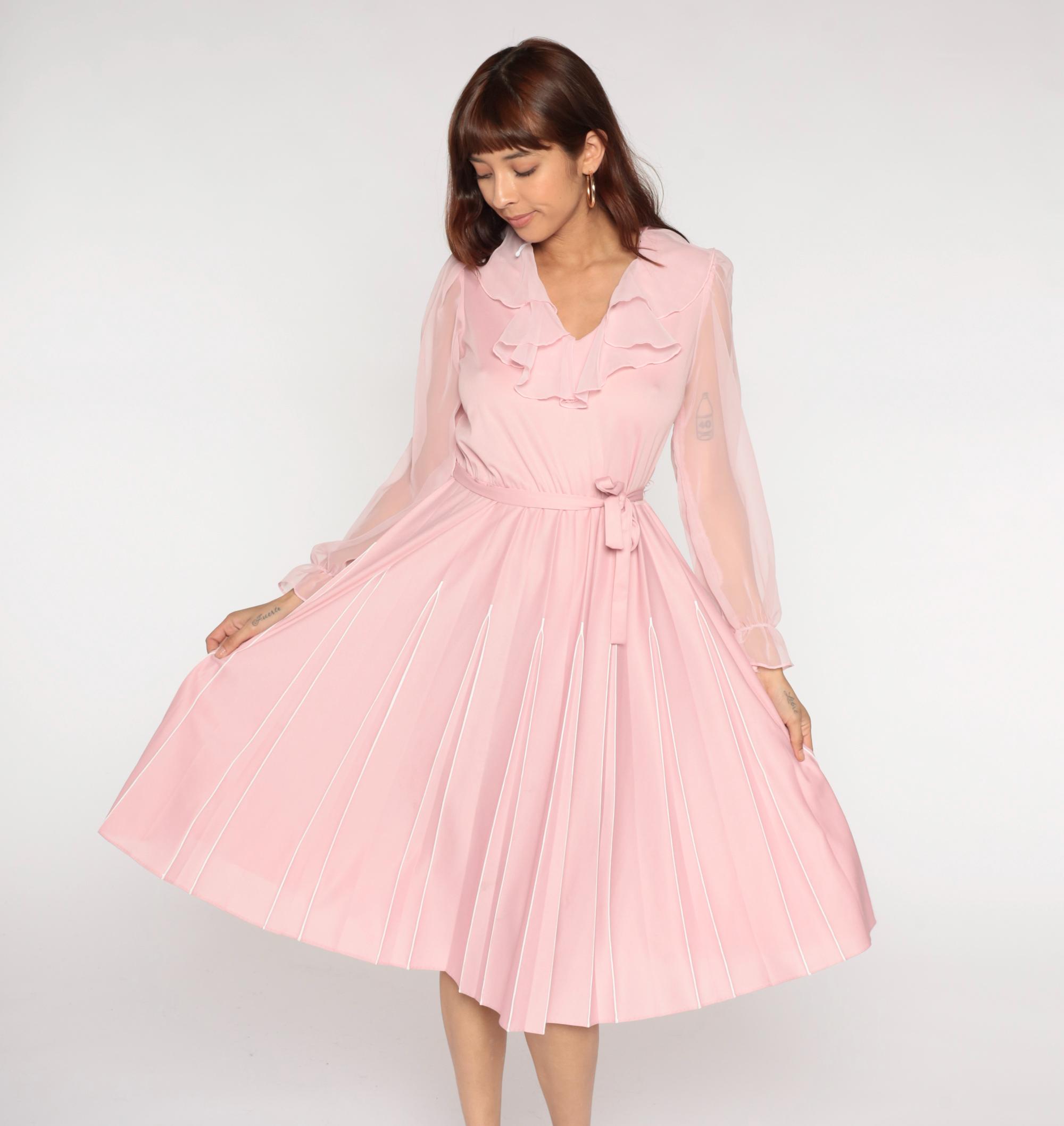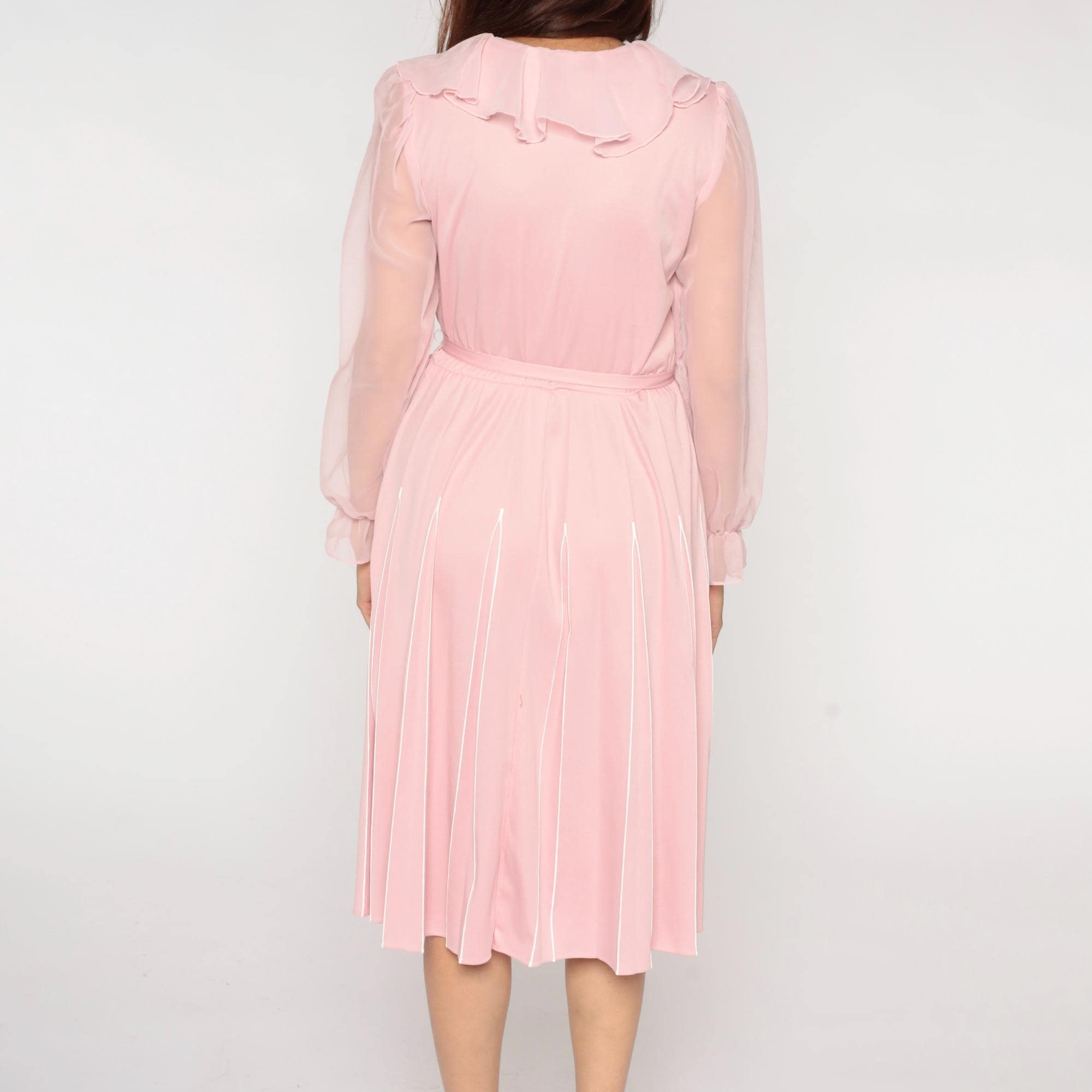 70s pale pink midi dress by Riccardo. Features a beautiful ruffled V-neckline and sheer long sleeves with gathered cuffs. The dress has a flattering fitted bodice with attached tie belt and a pleated skirt.