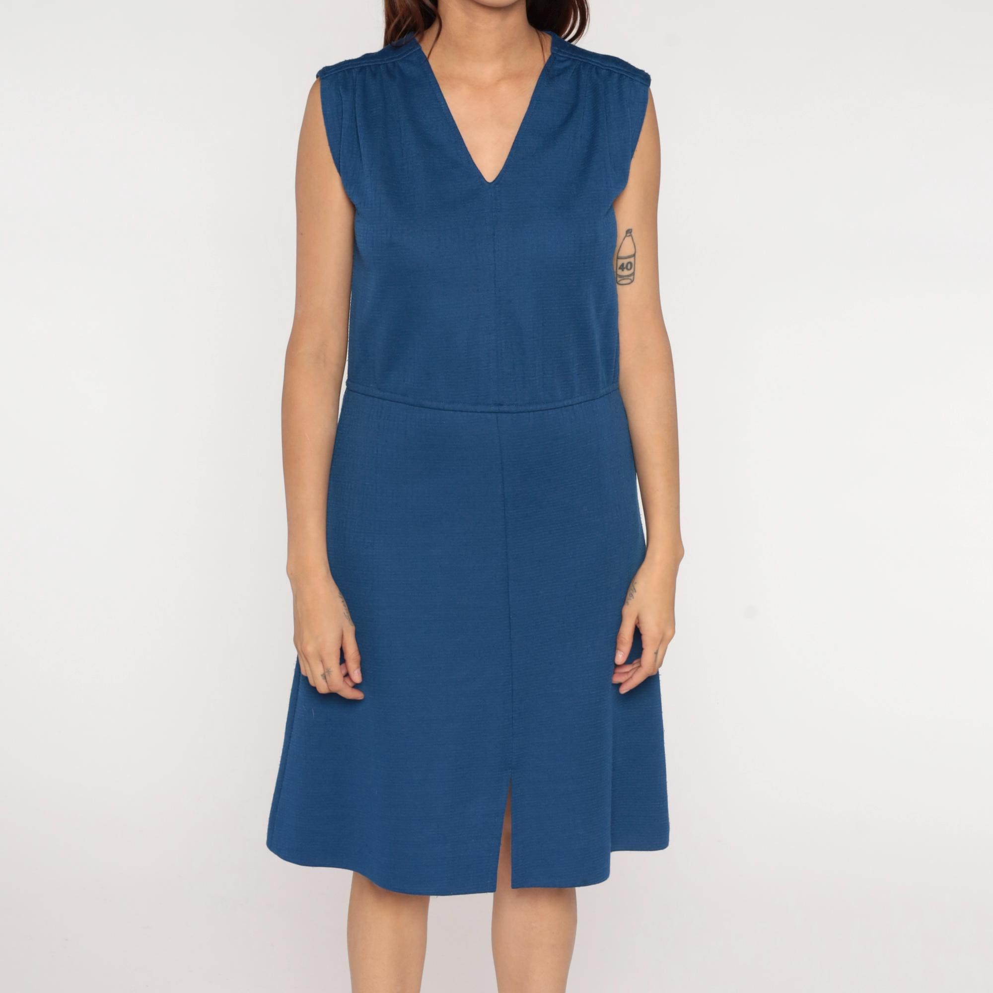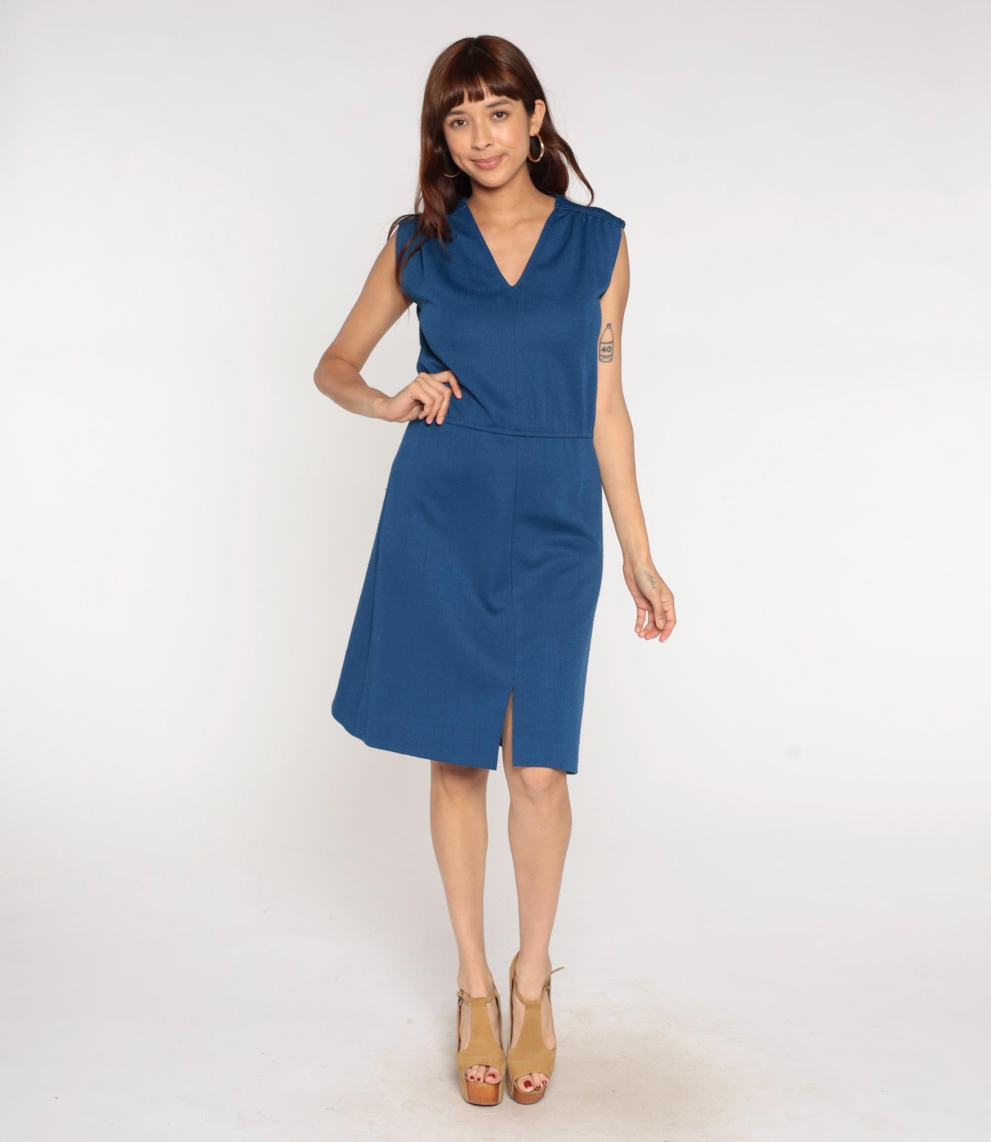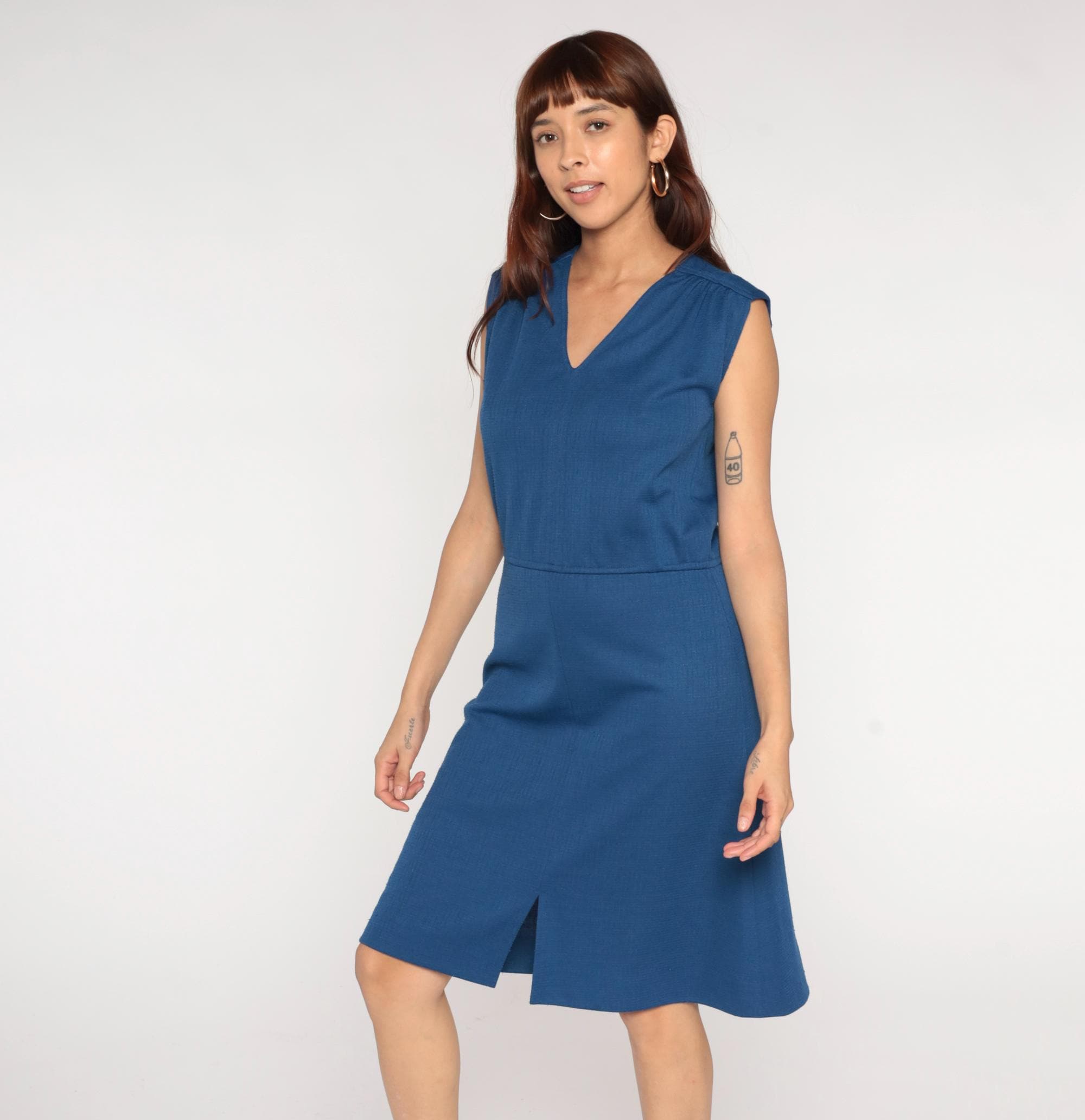 70s royal blue dress in a classic A-line silhouette. Features a flattering V-neckline and sleeveless cut with subtle gathering at the shoulders. Clean, minimalist design with a center front slit at the bottom of the skirt for easy movement.