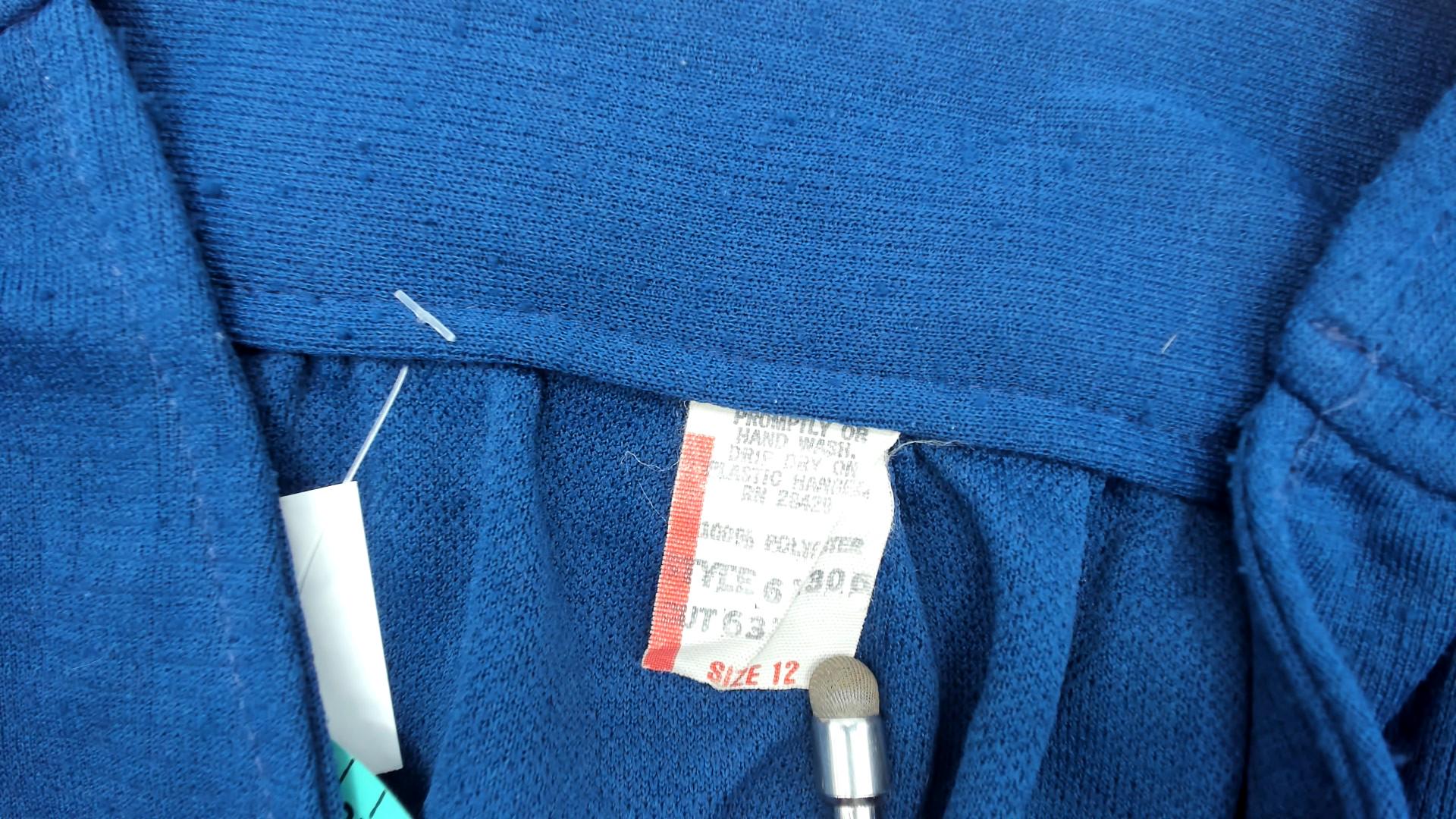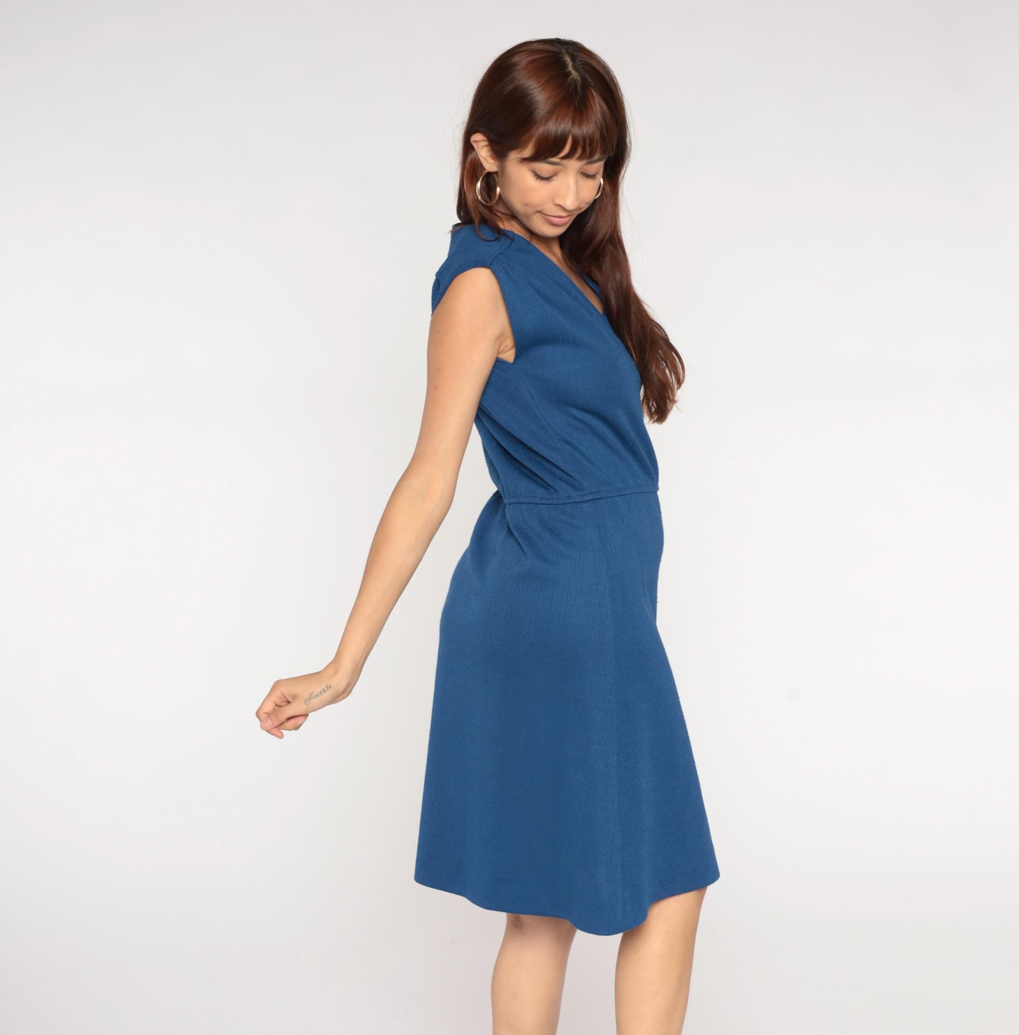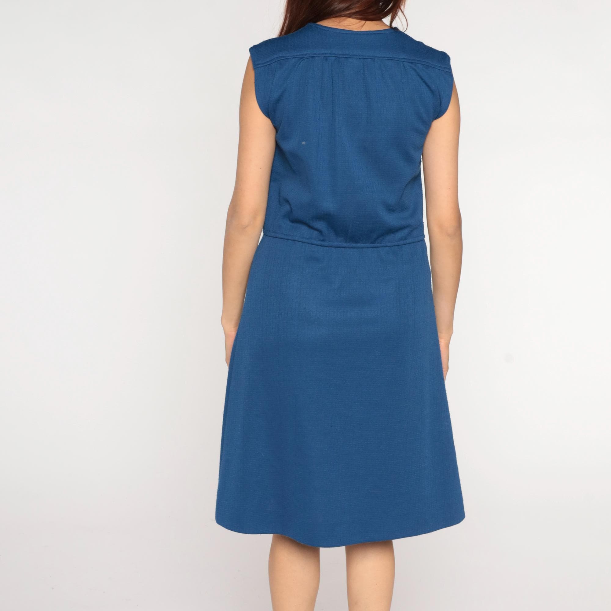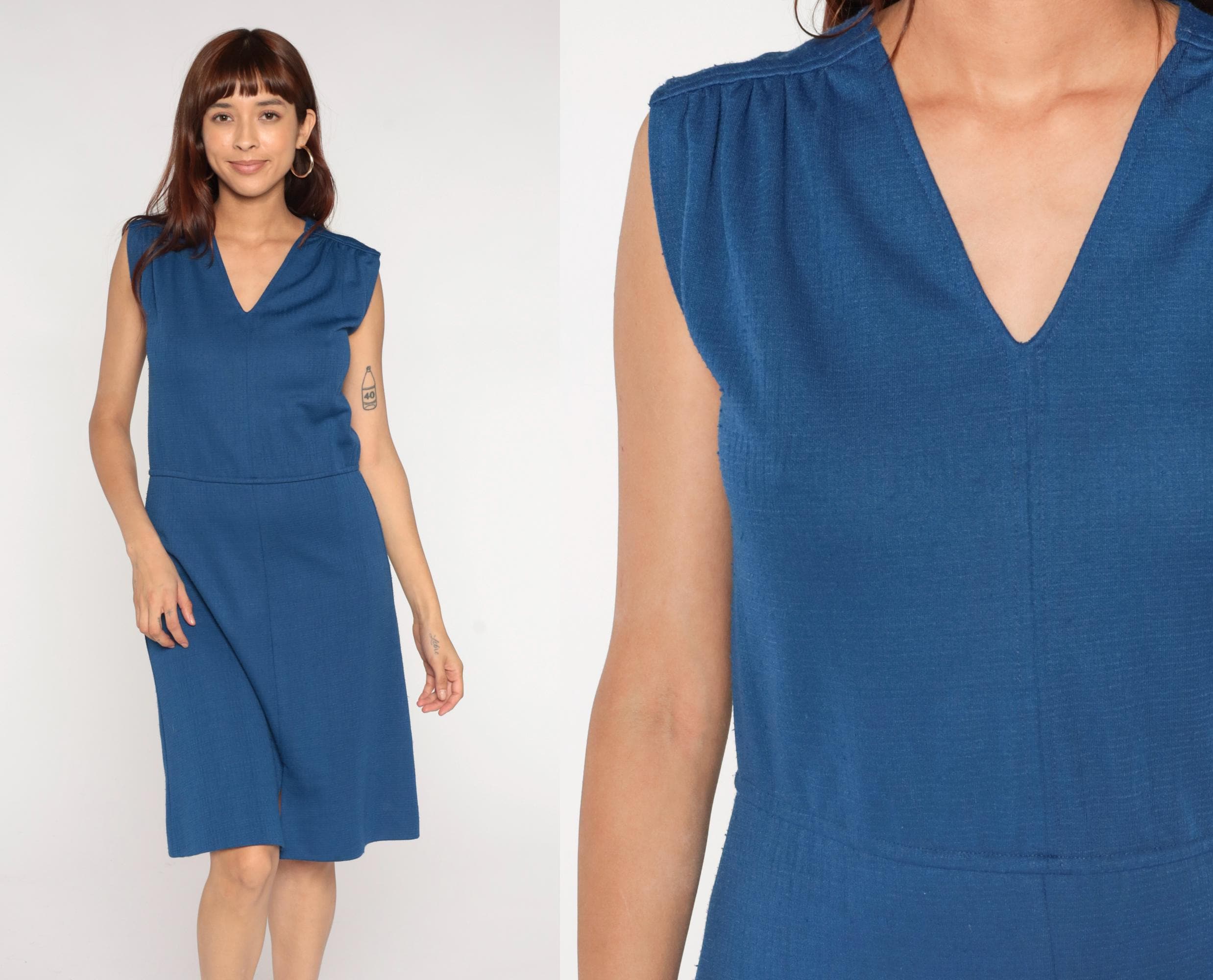 70s royal blue dress in a classic A-line silhouette. Features a flattering V-neckline and sleeveless cut with subtle gathering at the shoulders. Clean, minimalist design with a center front slit at the bottom of the skirt for easy movement.
