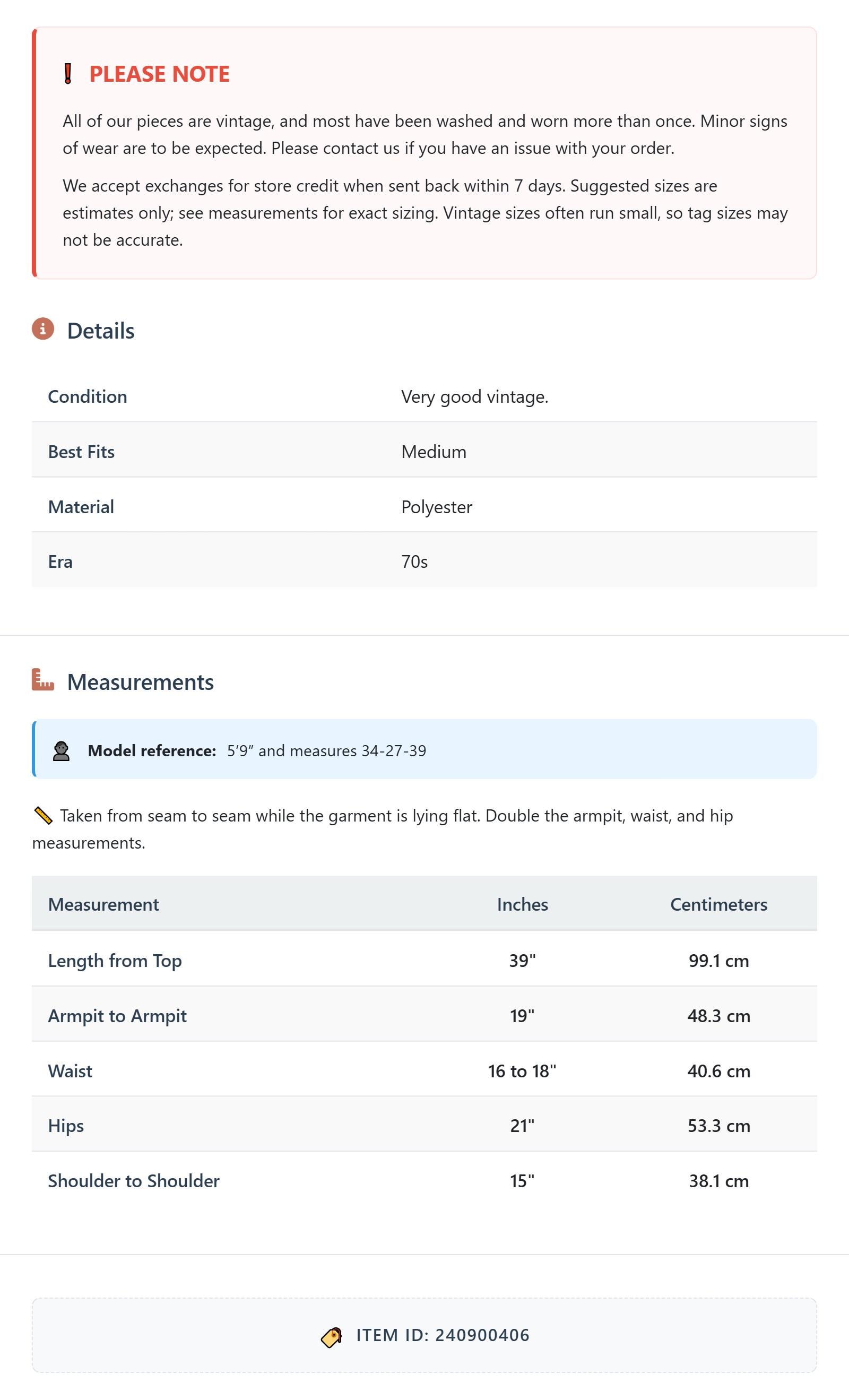 Suggested sizes are estimates only; see measurements for exact sizing. Vintage sizes often run small, so tag sizes may not be accurate.