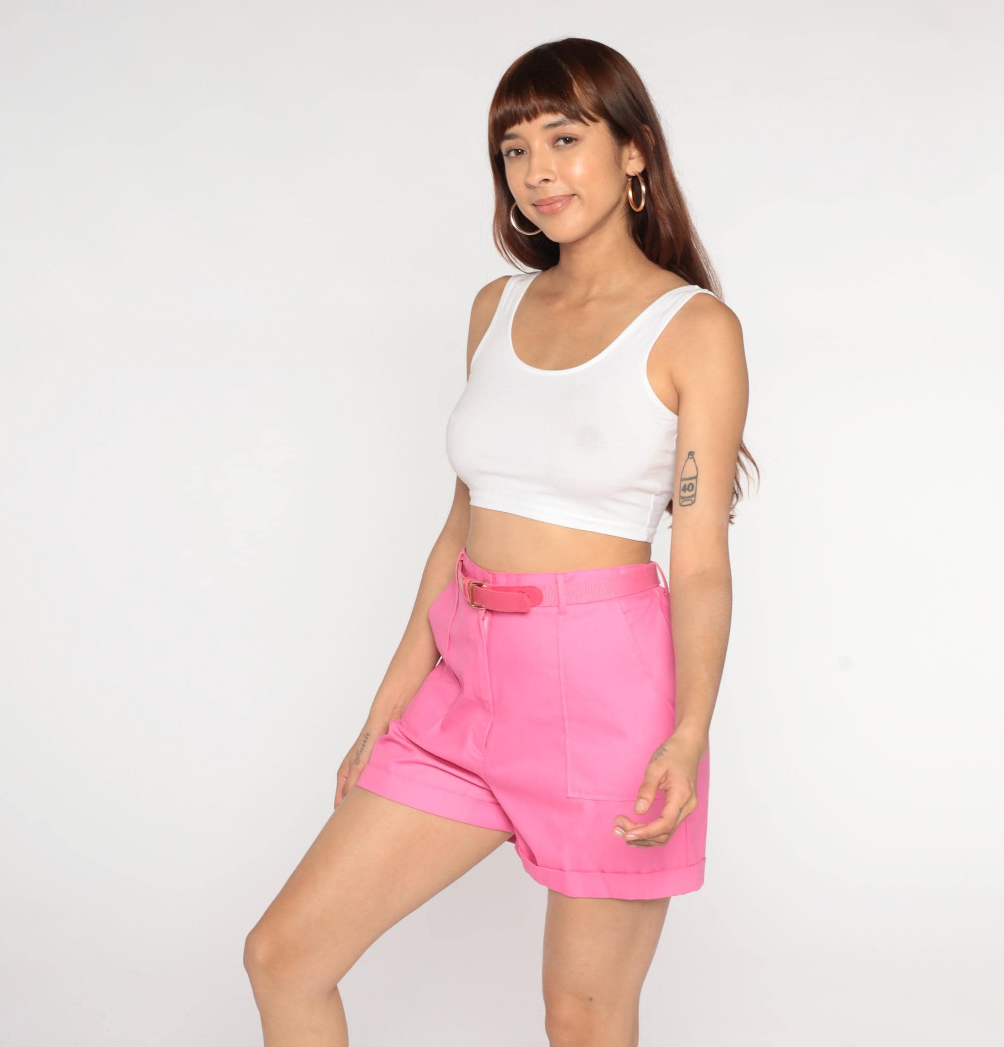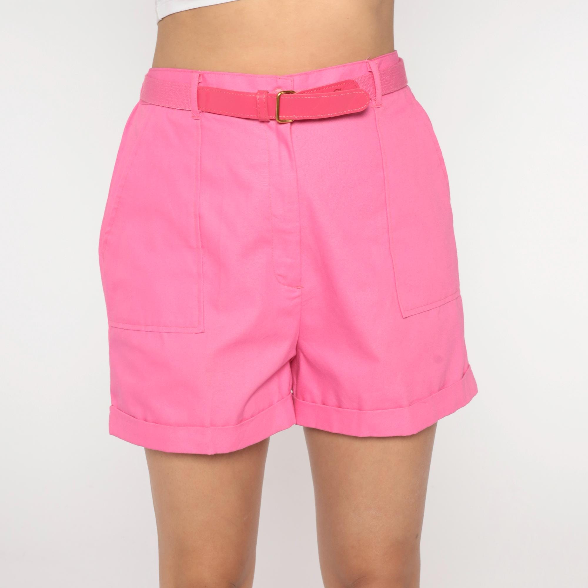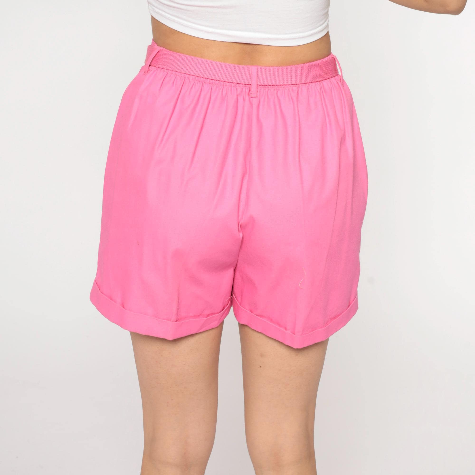 80s Hunter’s Glen high-waisted shorts in bright pink cotton blend. These shorts feature front patch pockets, a cuffed hem, and matching pink belt with gold buckle.