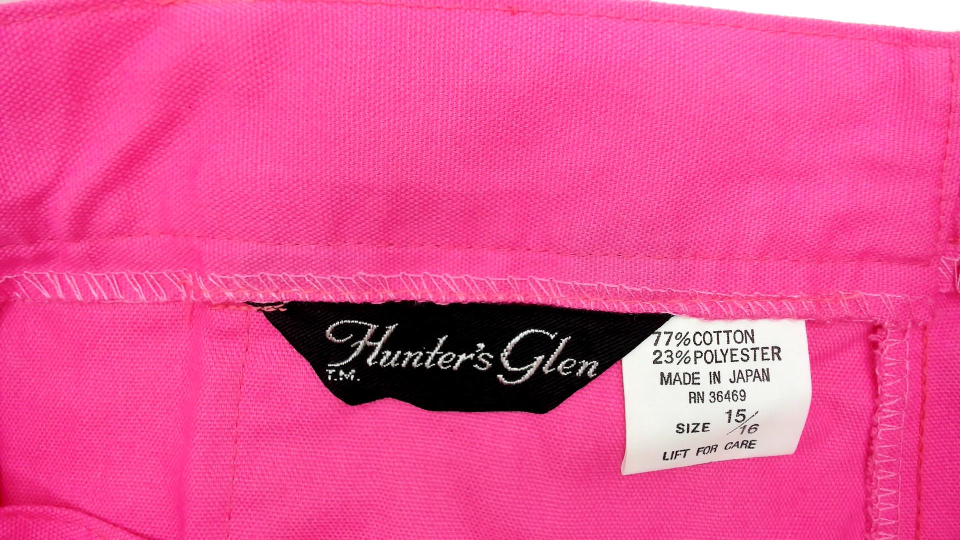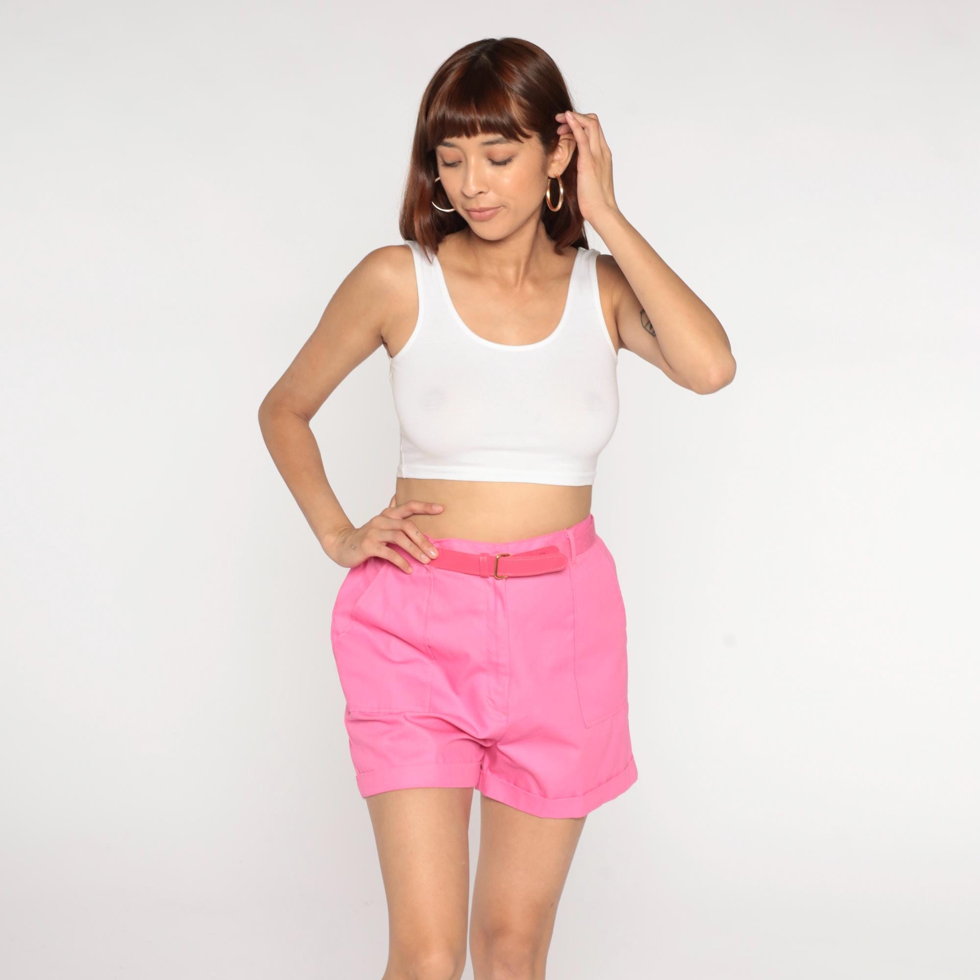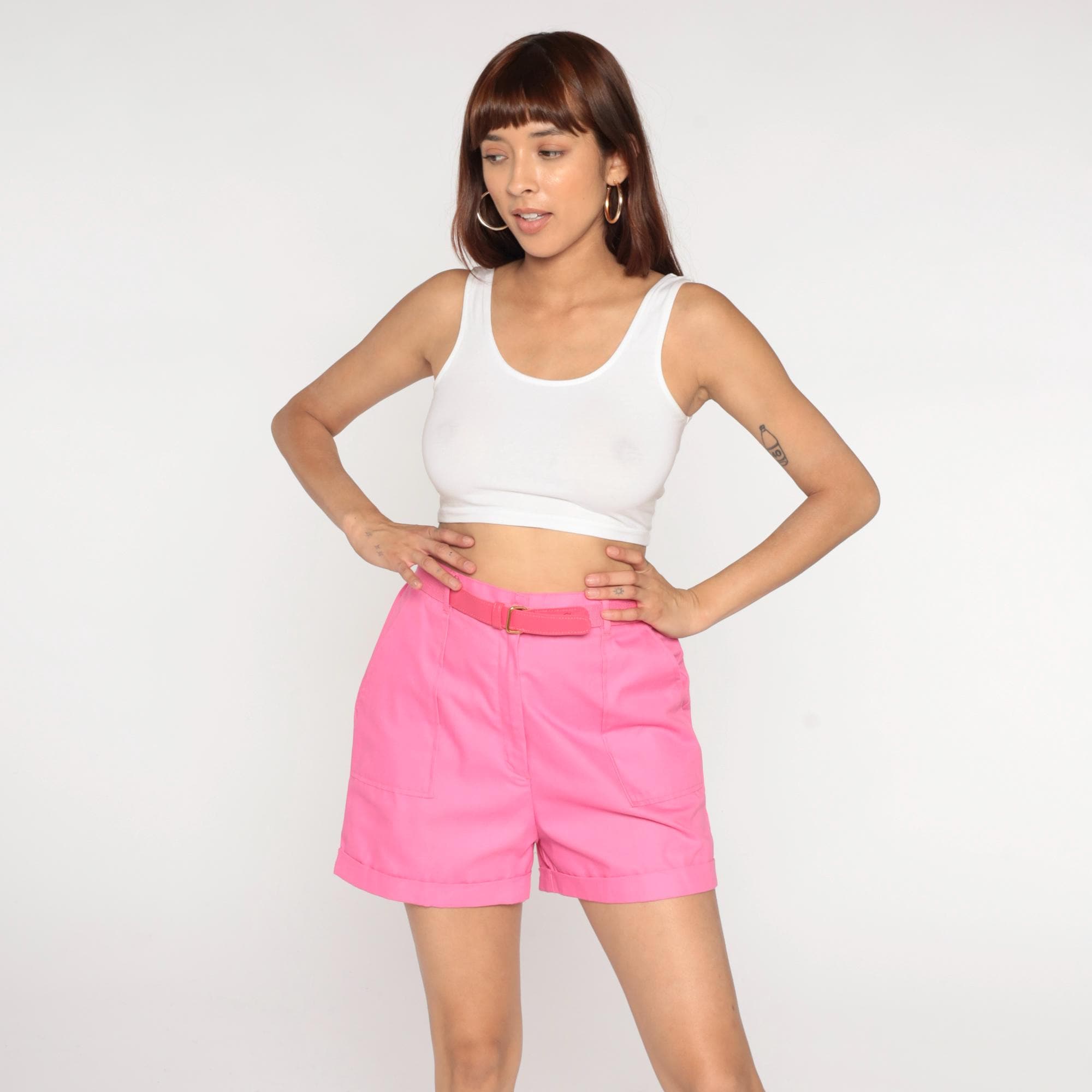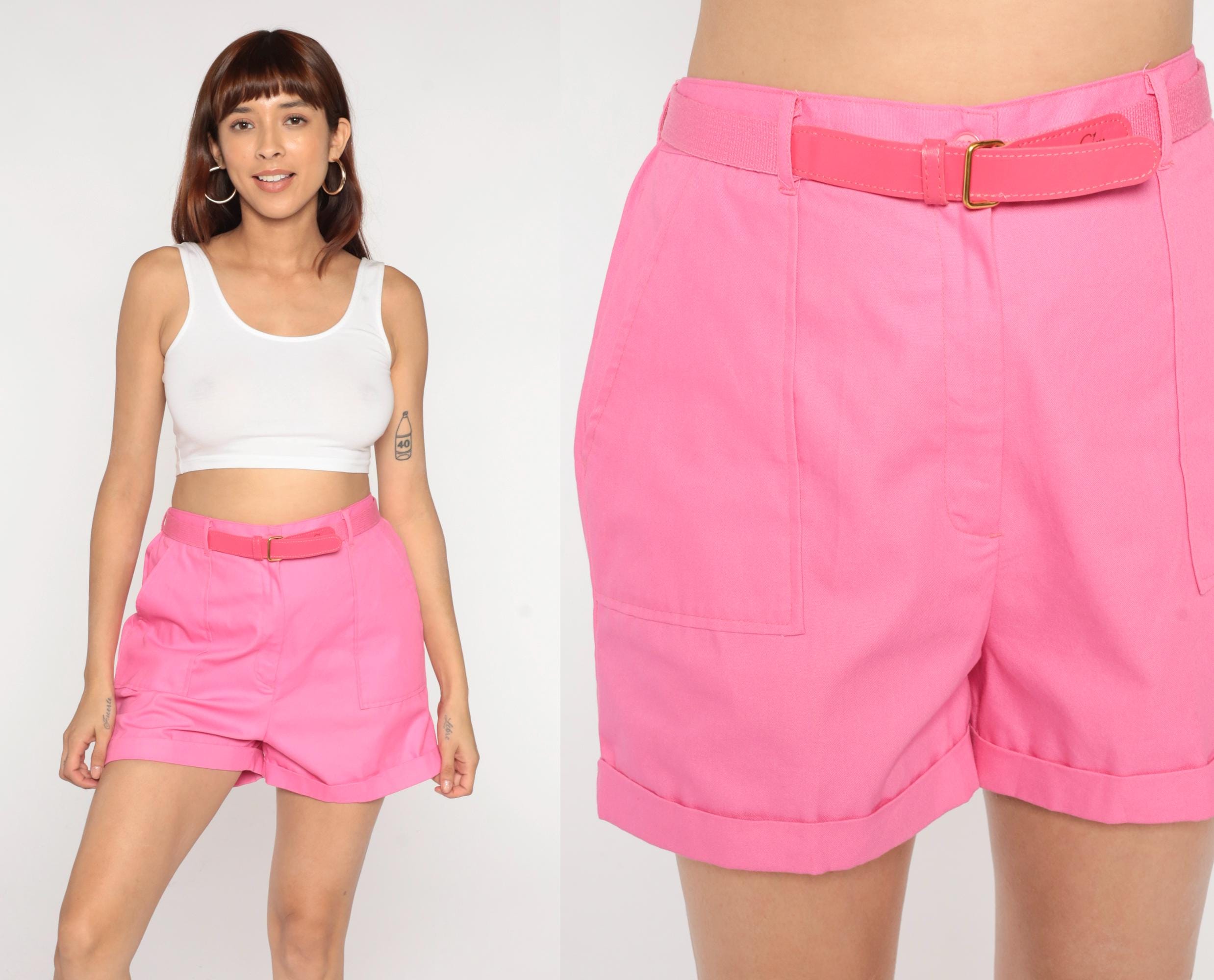 80s Hunter’s Glen high-waisted shorts in bright pink cotton blend. These shorts feature front patch pockets, a cuffed hem, and matching pink belt with gold buckle.