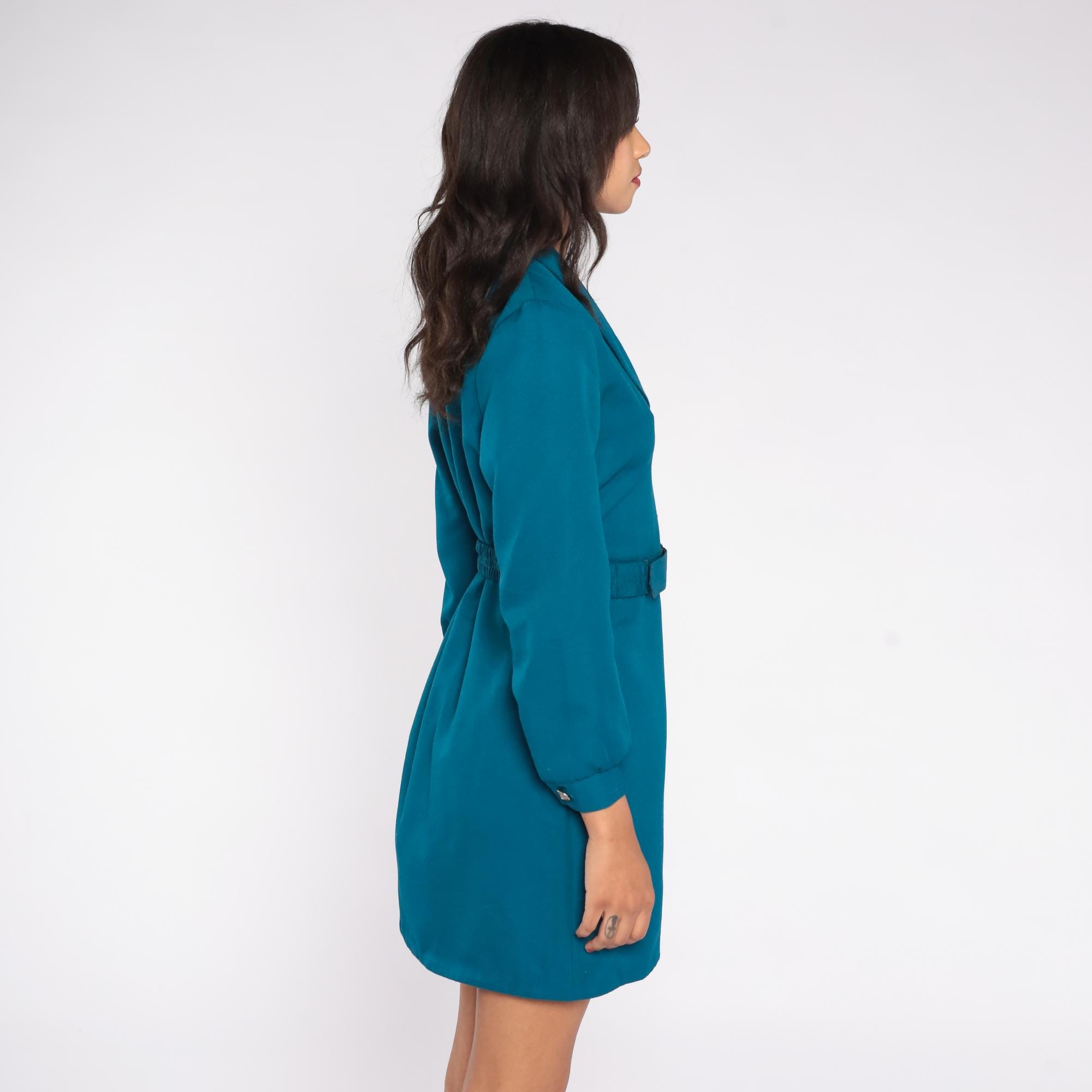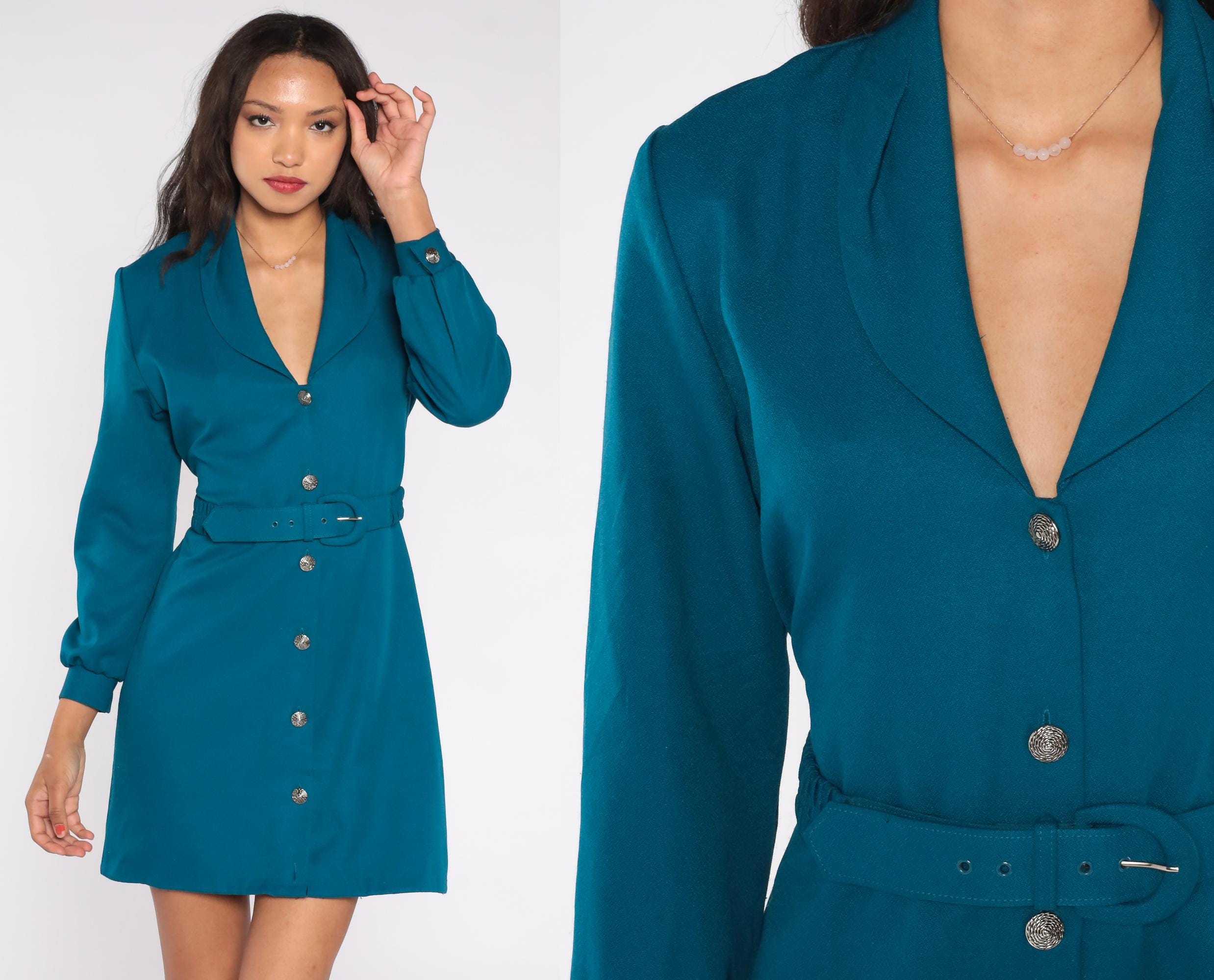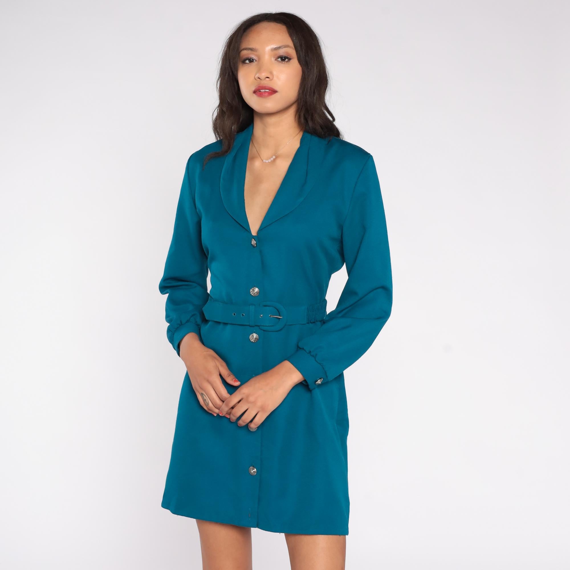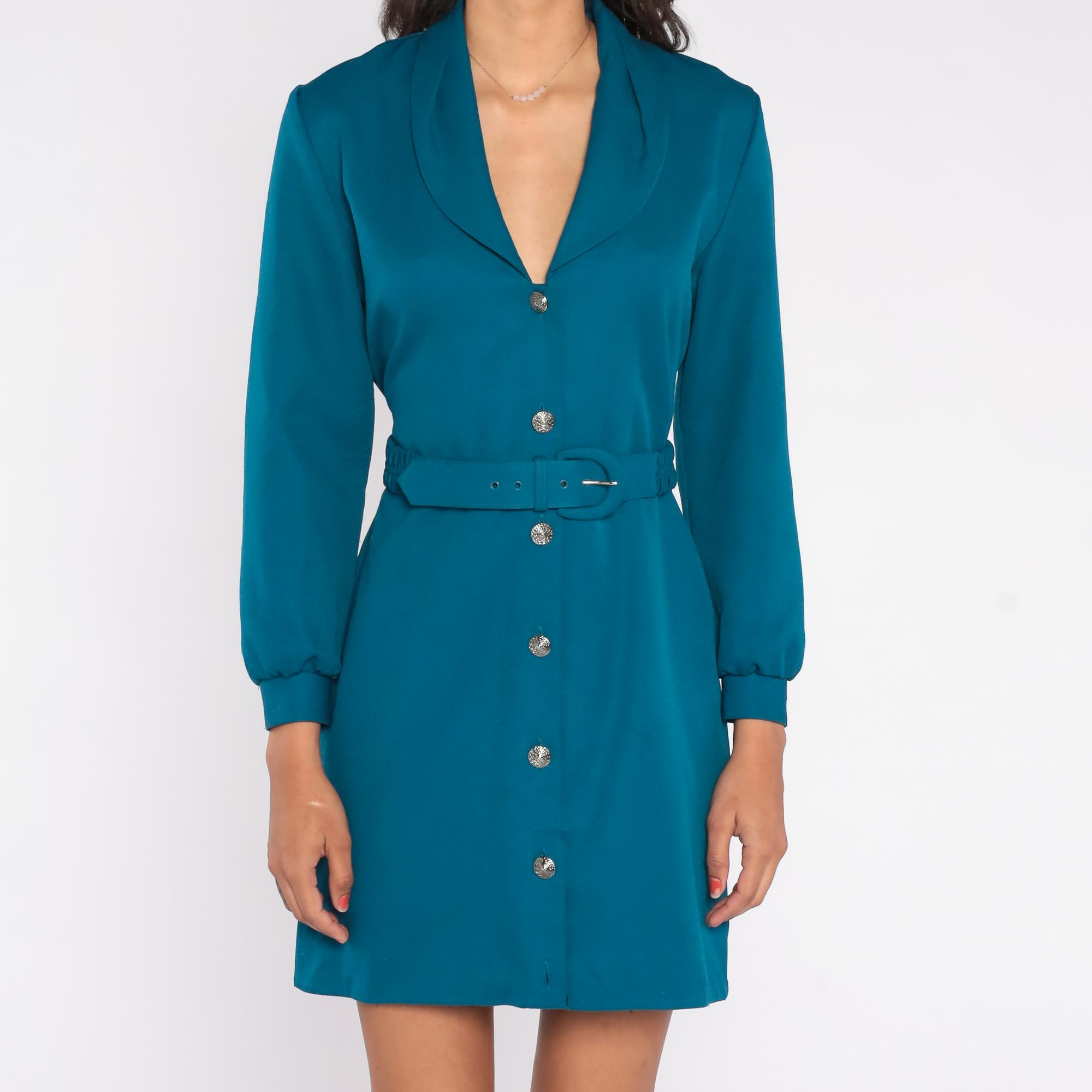 80s teal blazer dress with its structured silhouette and bold presence. The Nancy Petite label dress features a sophisticated deep V neckline with a shawl collar that creates a flattering frame. Silver decorative buttons run down the front, complementing the matching self-belt that cinches the waist.