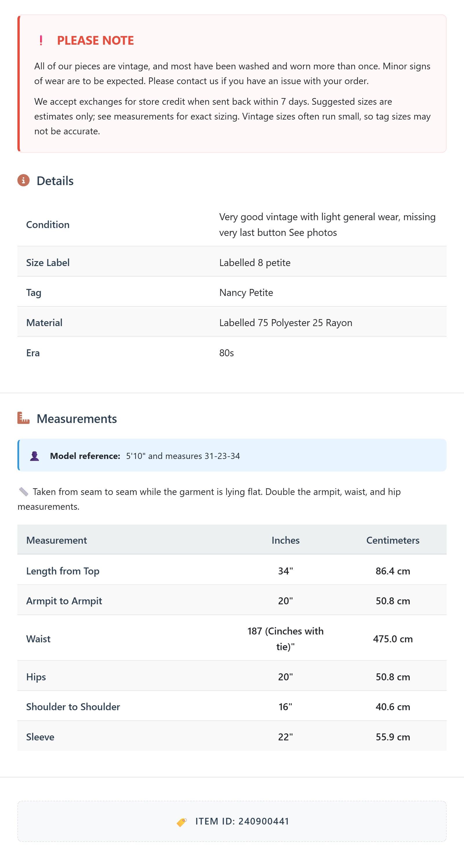 All of our pieces are vintage, and most have been washed and worn more than once. Minor signs of wear are to be expected. Please contact us if you have an issue with your order. We accept exchanges for store credit when sent back within 7 days.