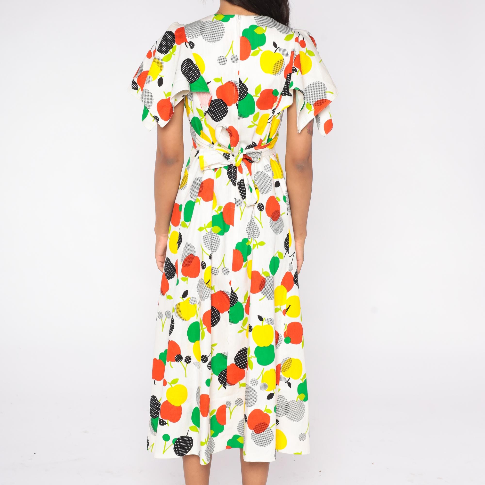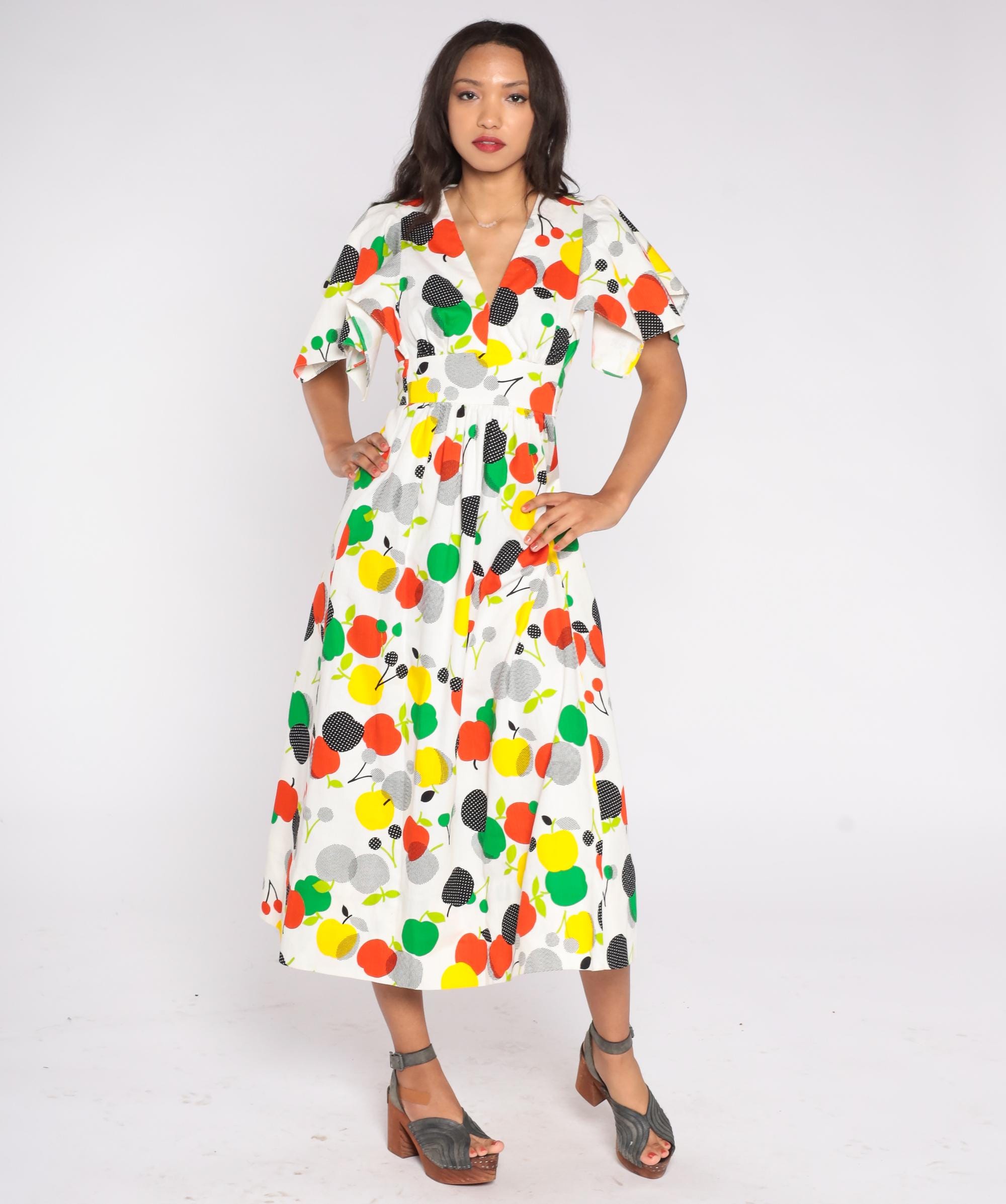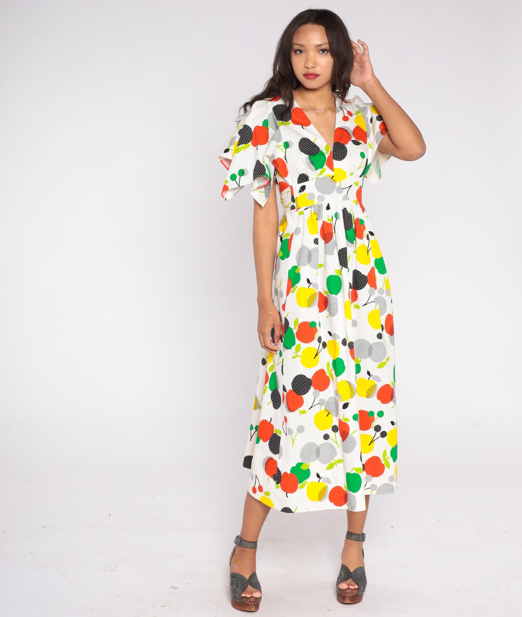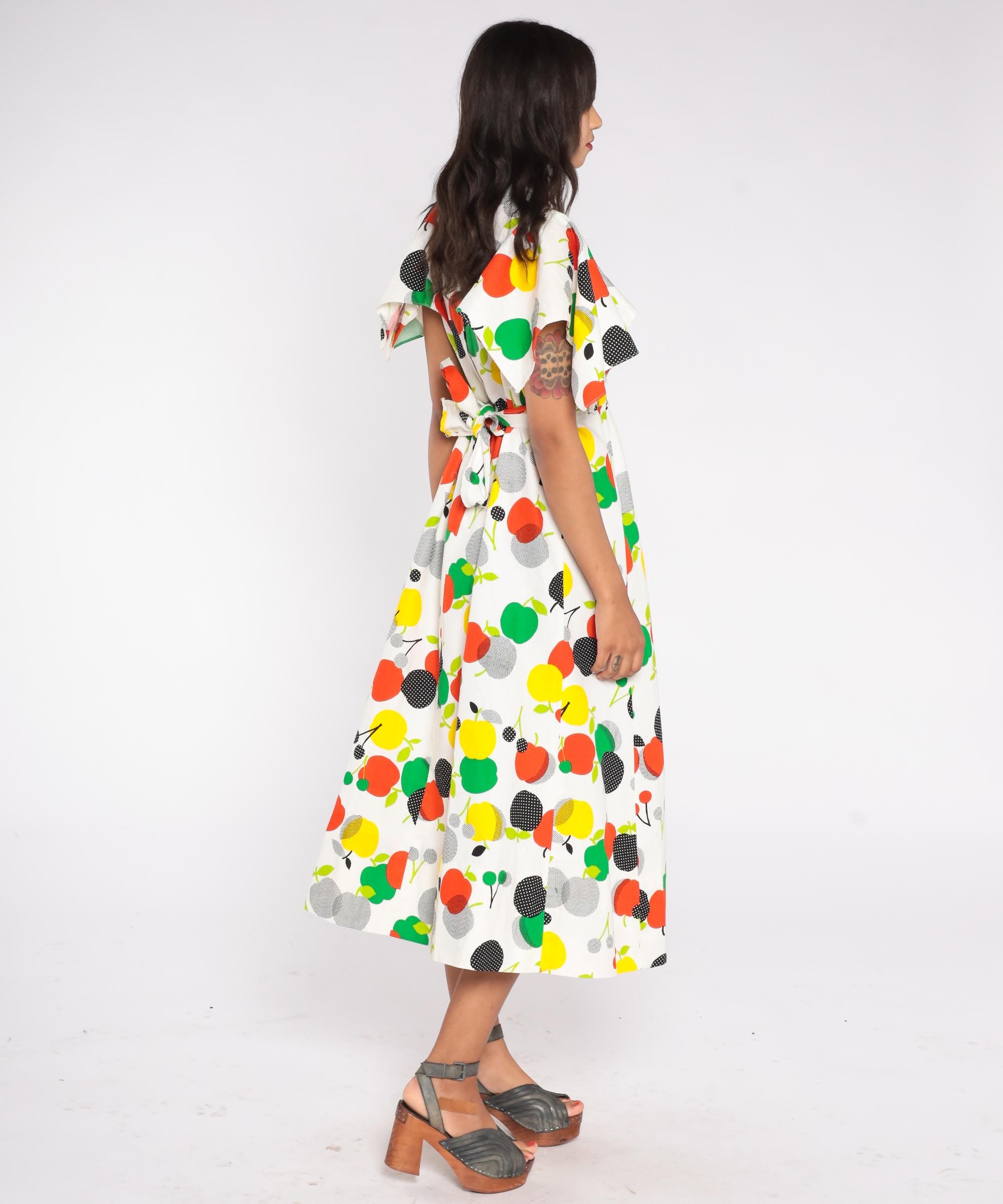 70s fruit print dress showcases a vibrant pop art design of apples, cherries and fruit motifs in bold red, green, yellow, black and gray on a crisp white cotton background. The dress features a flattering surplice V-neckline that creates a wrap-style bodice. Distinctive flutter sleeves with angled hems add movement and drama to the silhouette. The fitted waist includes a matching self-fabric tie belt that secures at the back.
