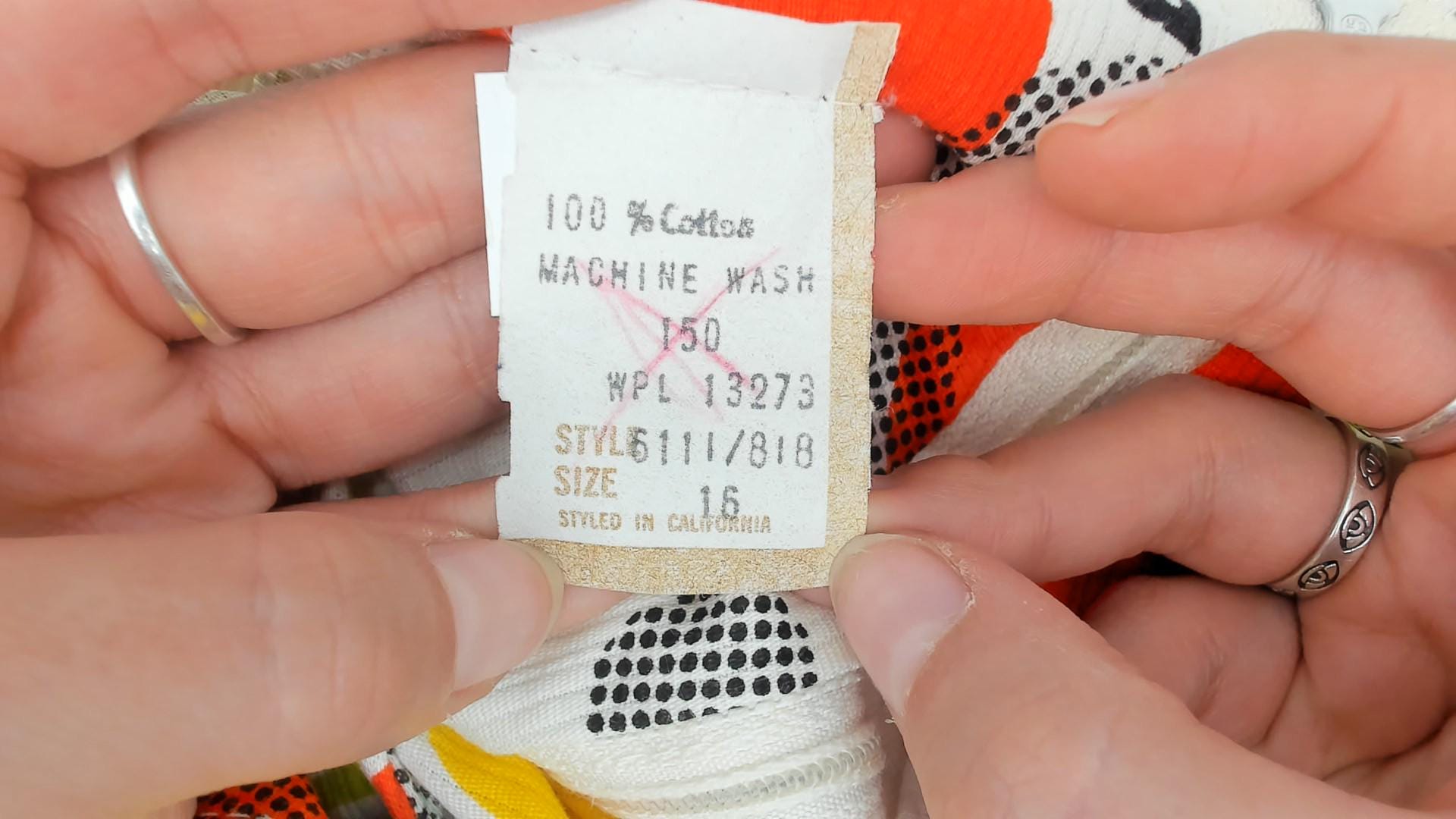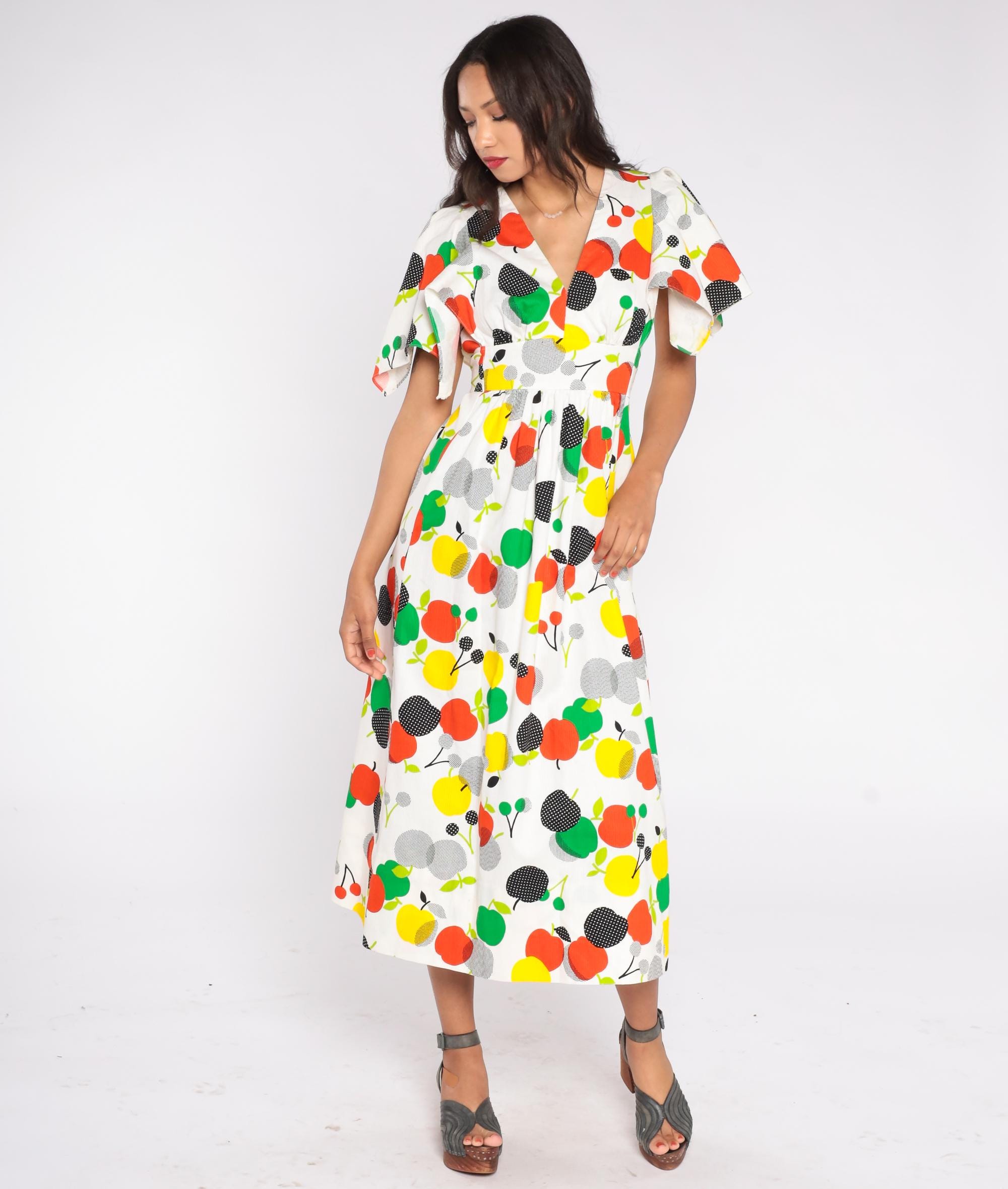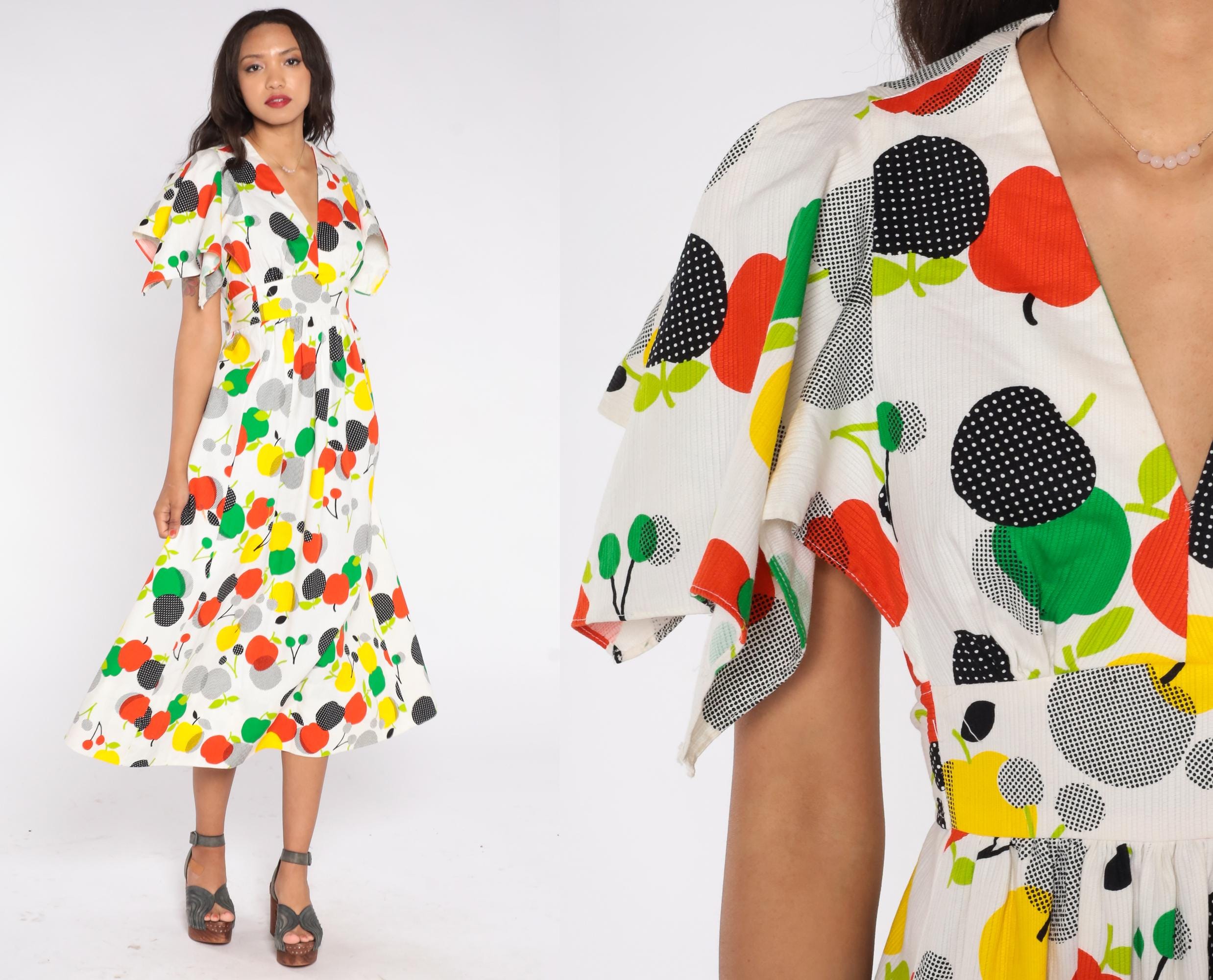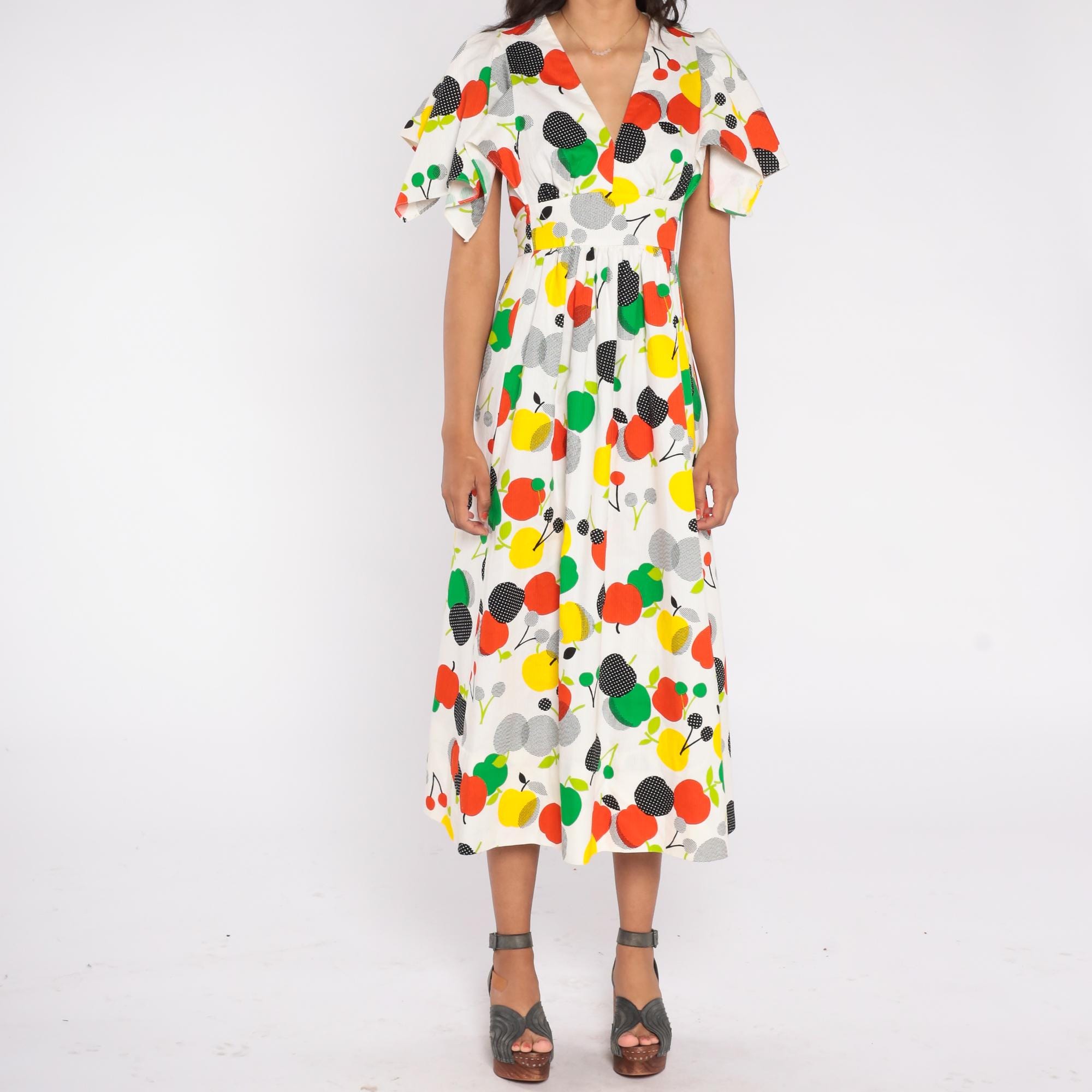 70s fruit print dress showcases a vibrant pop art design of apples, cherries and fruit motifs in bold red, green, yellow, black and gray on a crisp white cotton background. The dress features a flattering surplice V-neckline that creates a wrap-style bodice. Distinctive flutter sleeves with angled hems add movement and drama to the silhouette. The fitted waist includes a matching self-fabric tie belt that secures at the back.