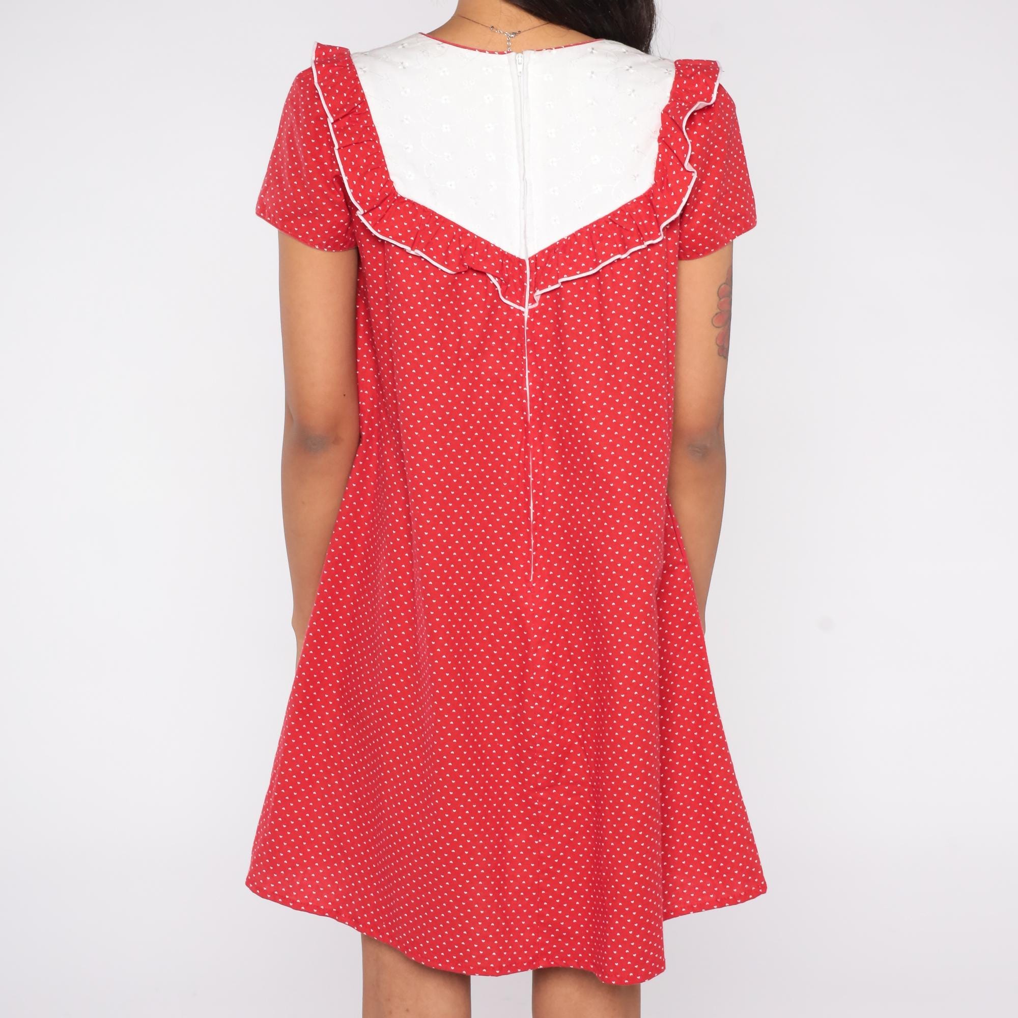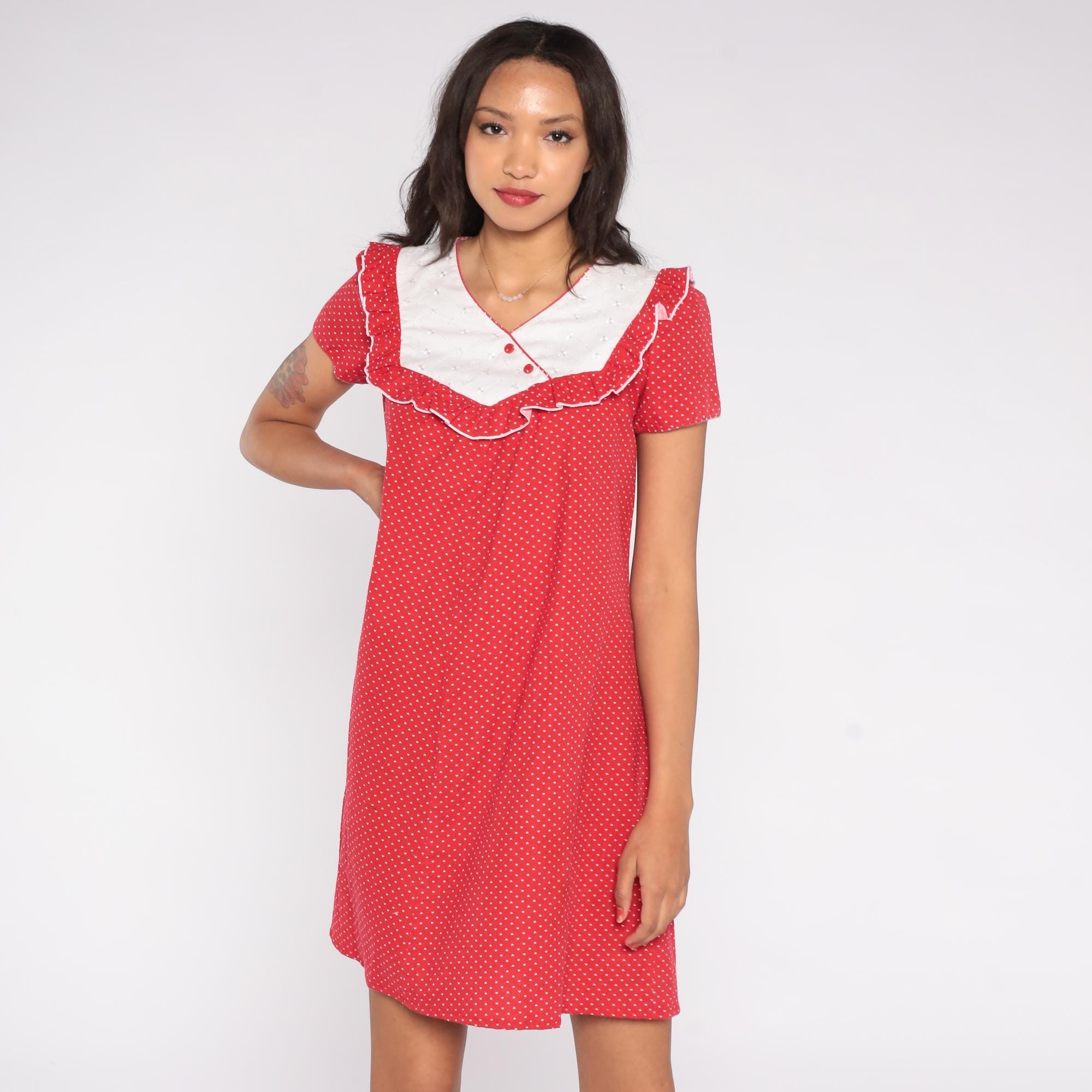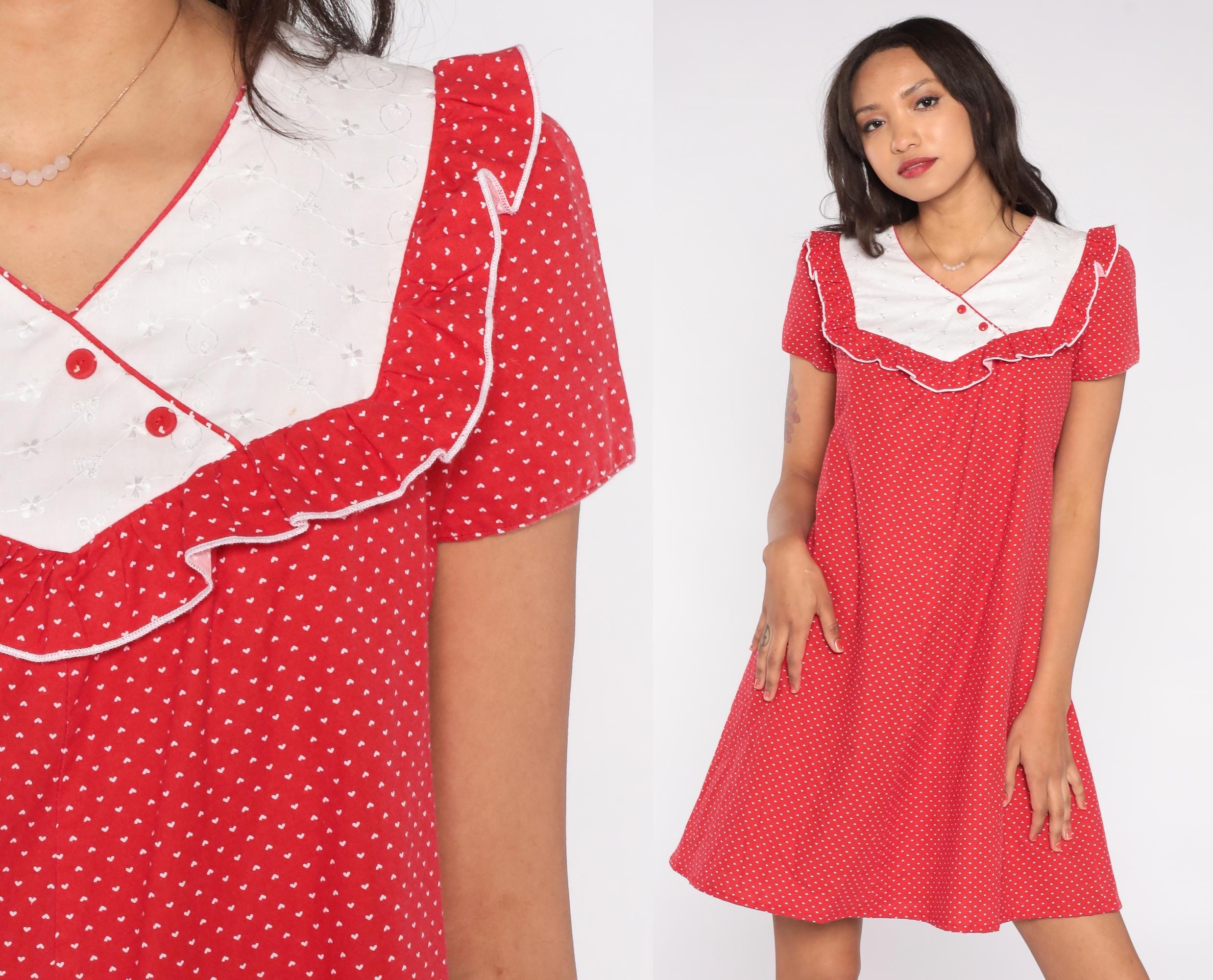 cherry red mini dress features a playful heart-shaped polka dot pattern throughout. The standout white bib collar is adorned with delicate eyelet embroidery and framed by a scalloped ruffle trim with white piping. Two small red buttons accent the asymmetrical crossover collar design.