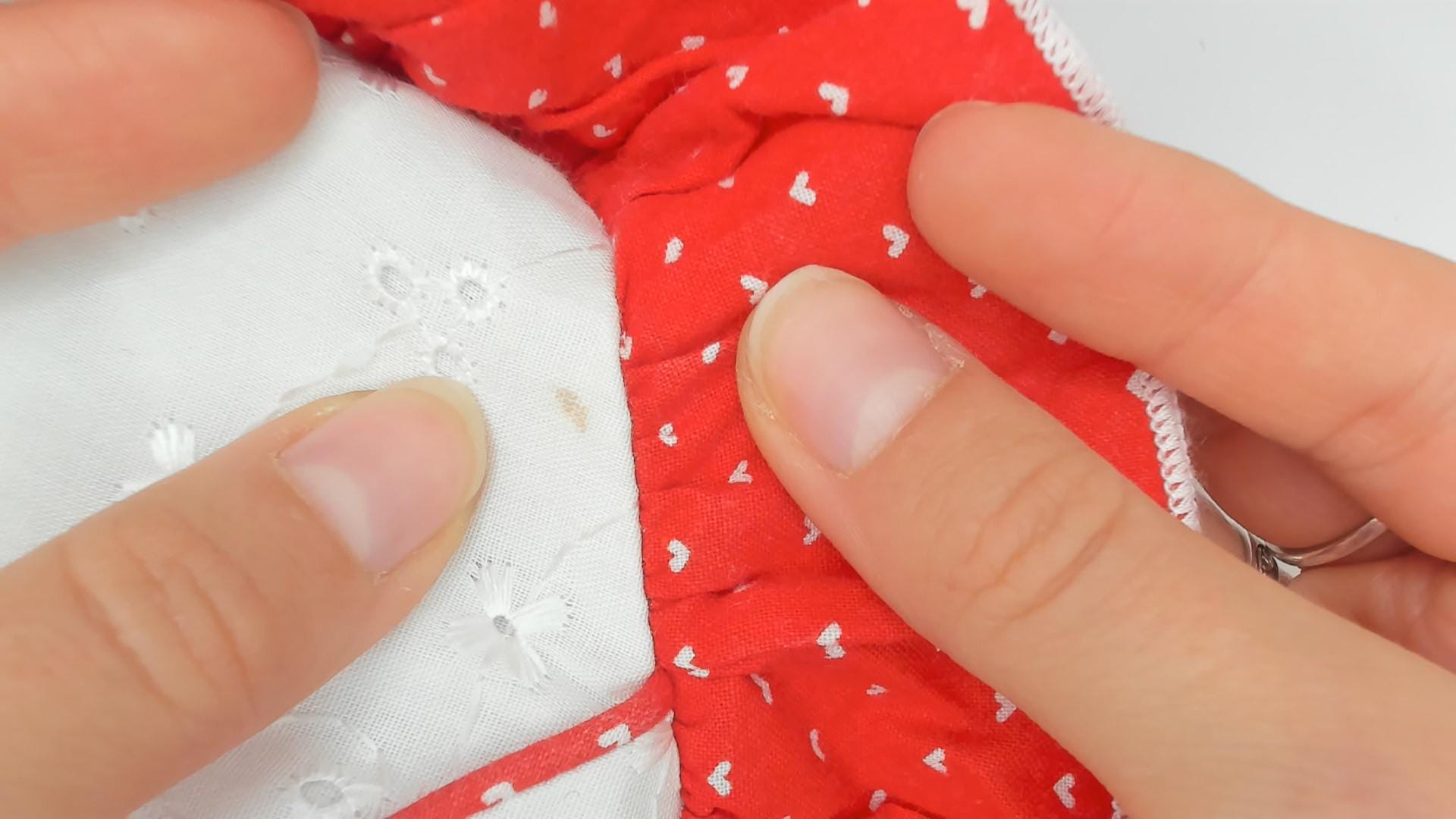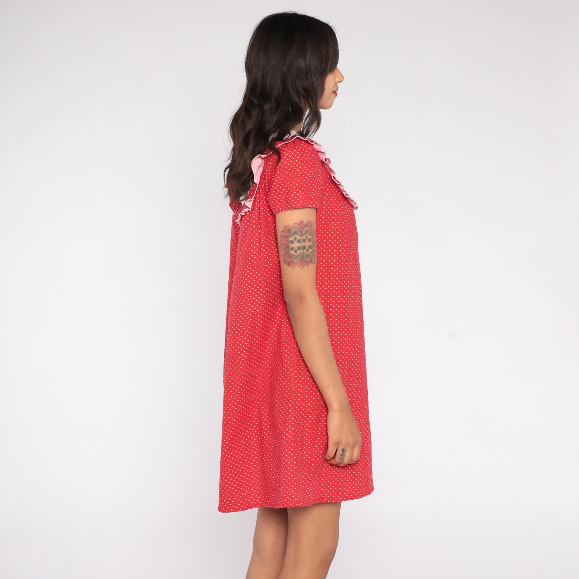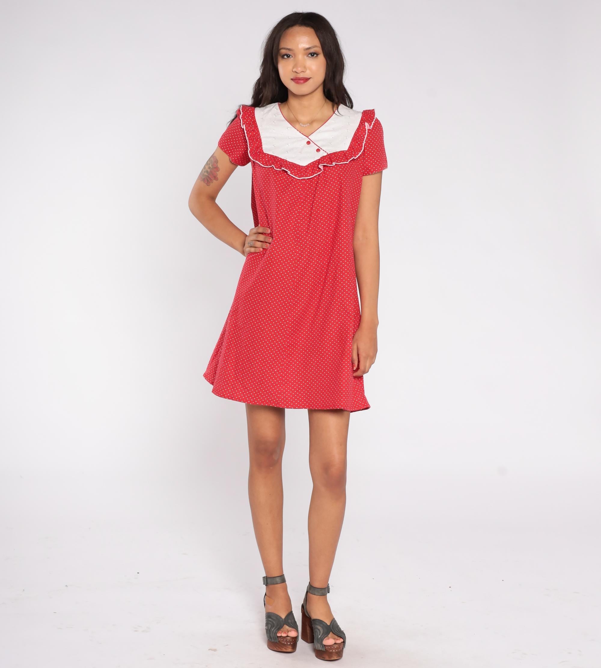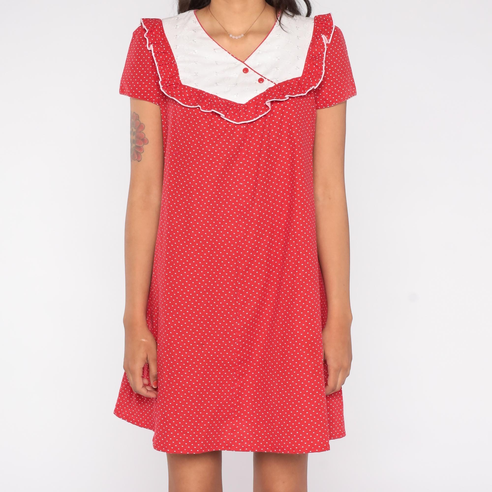 cherry red mini dress features a playful heart-shaped polka dot pattern throughout. The standout white bib collar is adorned with delicate eyelet embroidery and framed by a scalloped ruffle trim with white piping. Two small red buttons accent the asymmetrical crossover collar design.