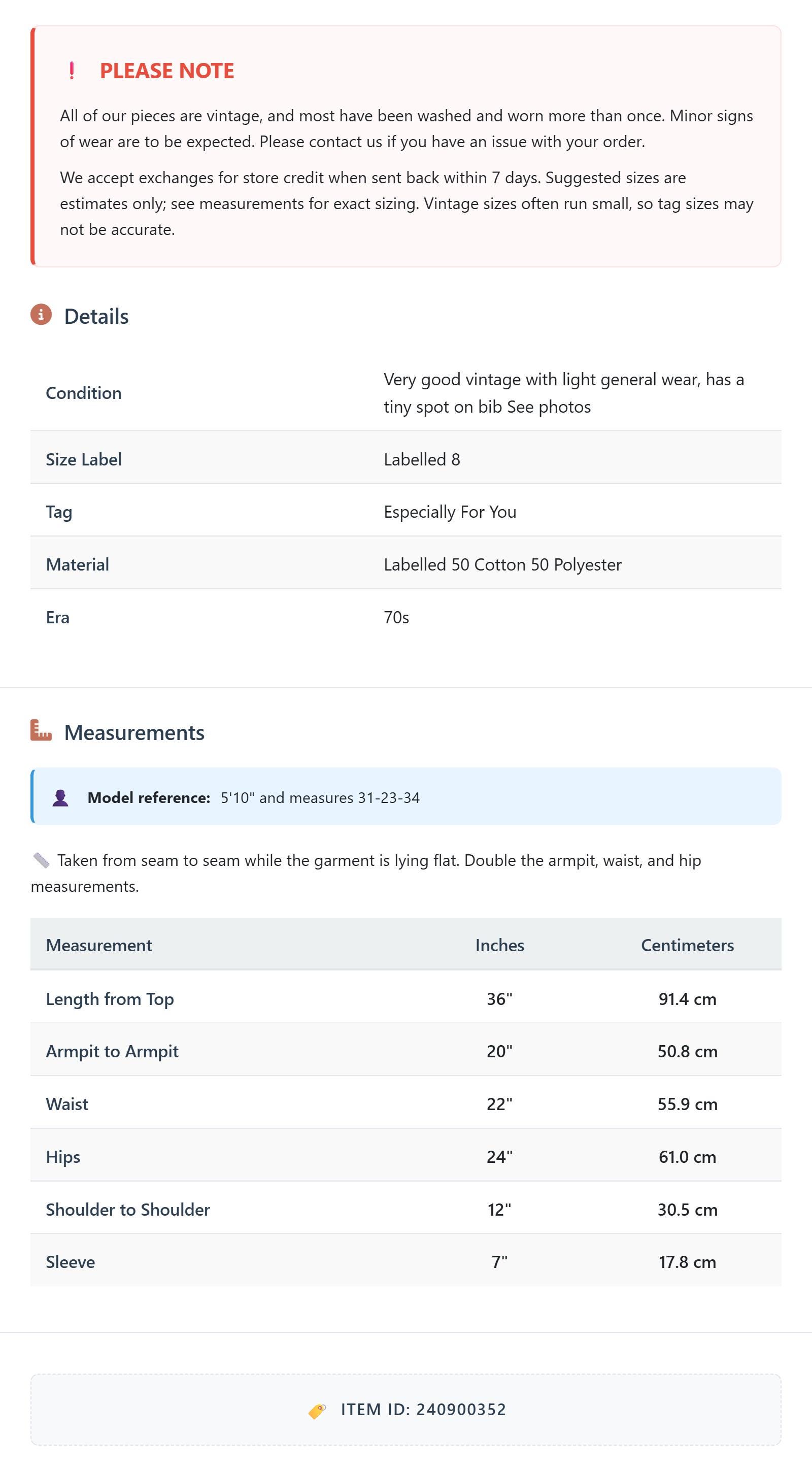 Suggested sizes are estimates only; see measurements for exact sizing. Vintage sizes often run small, so tag sizes may not be accurate.