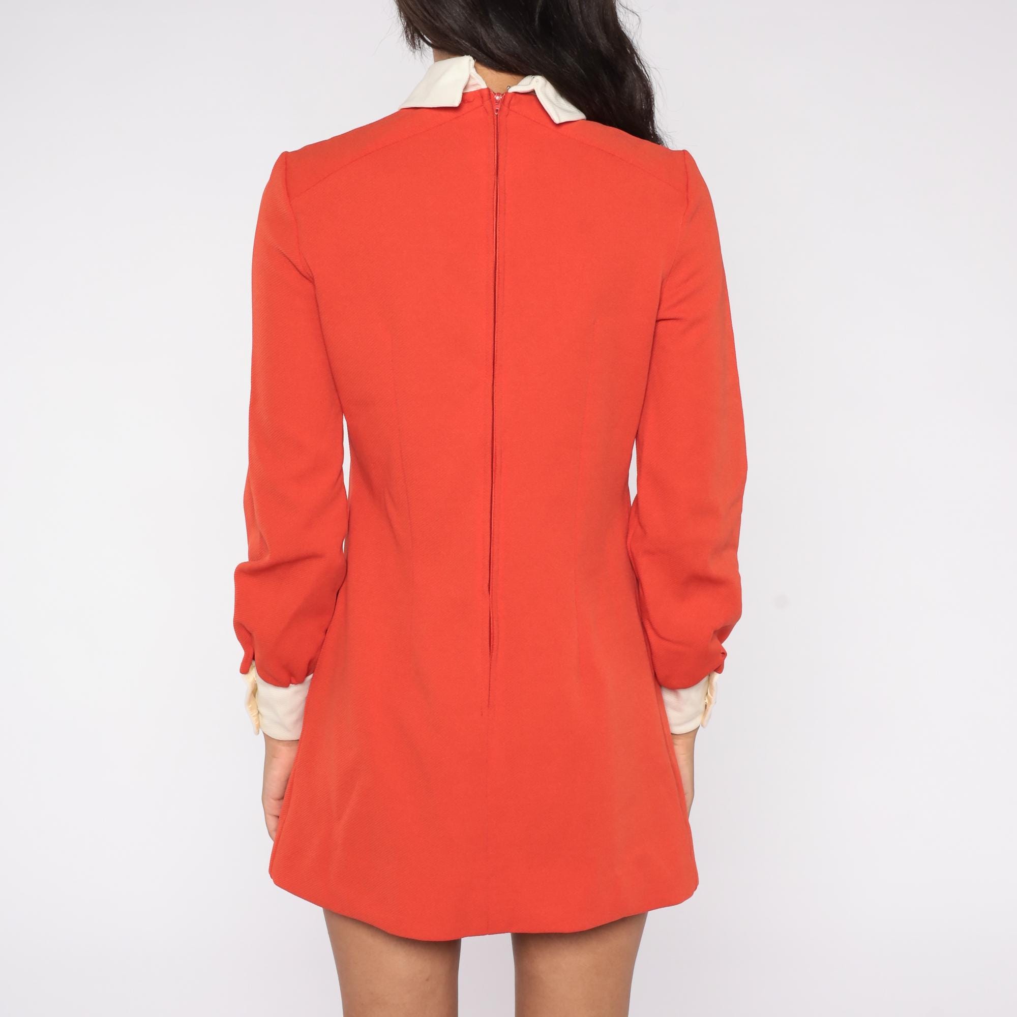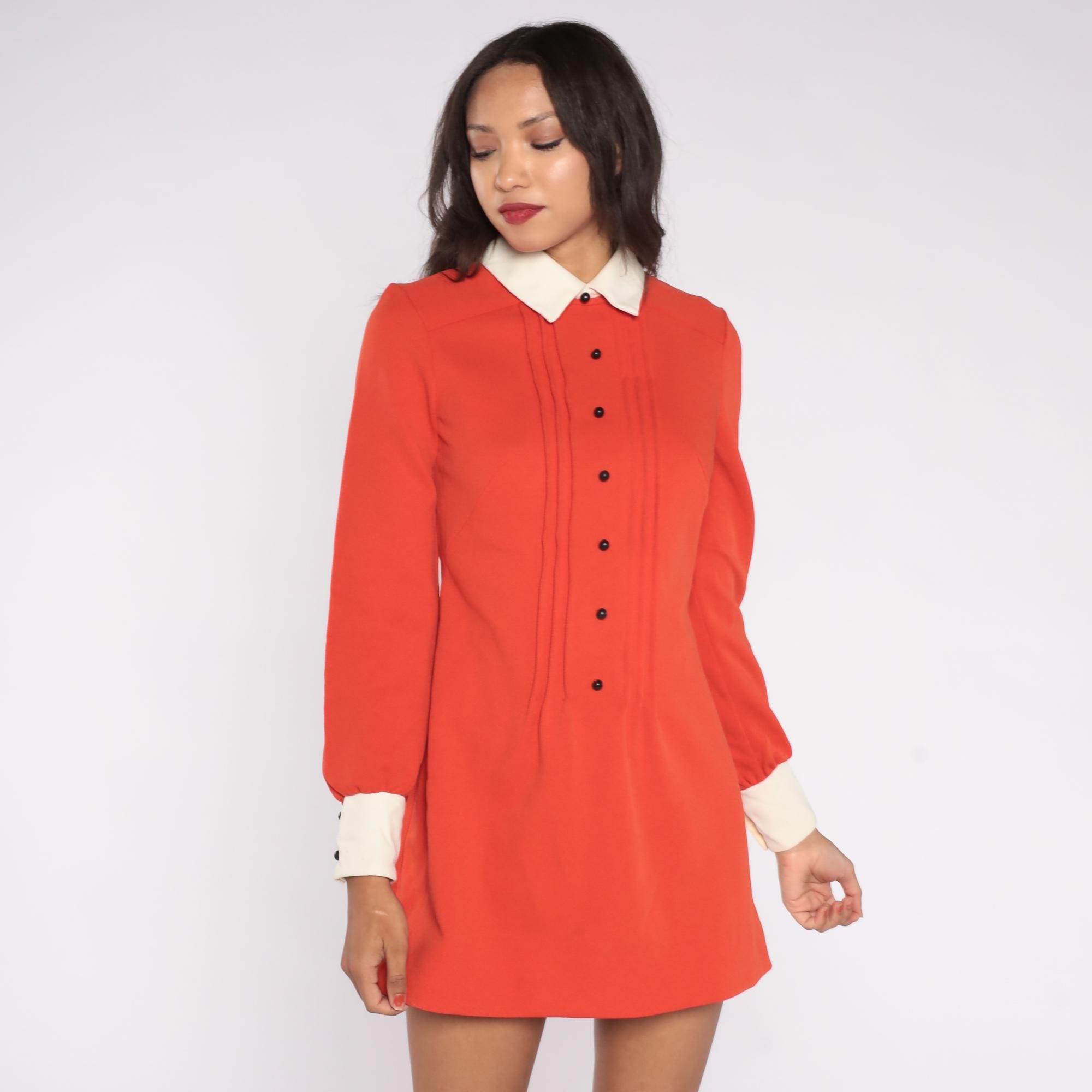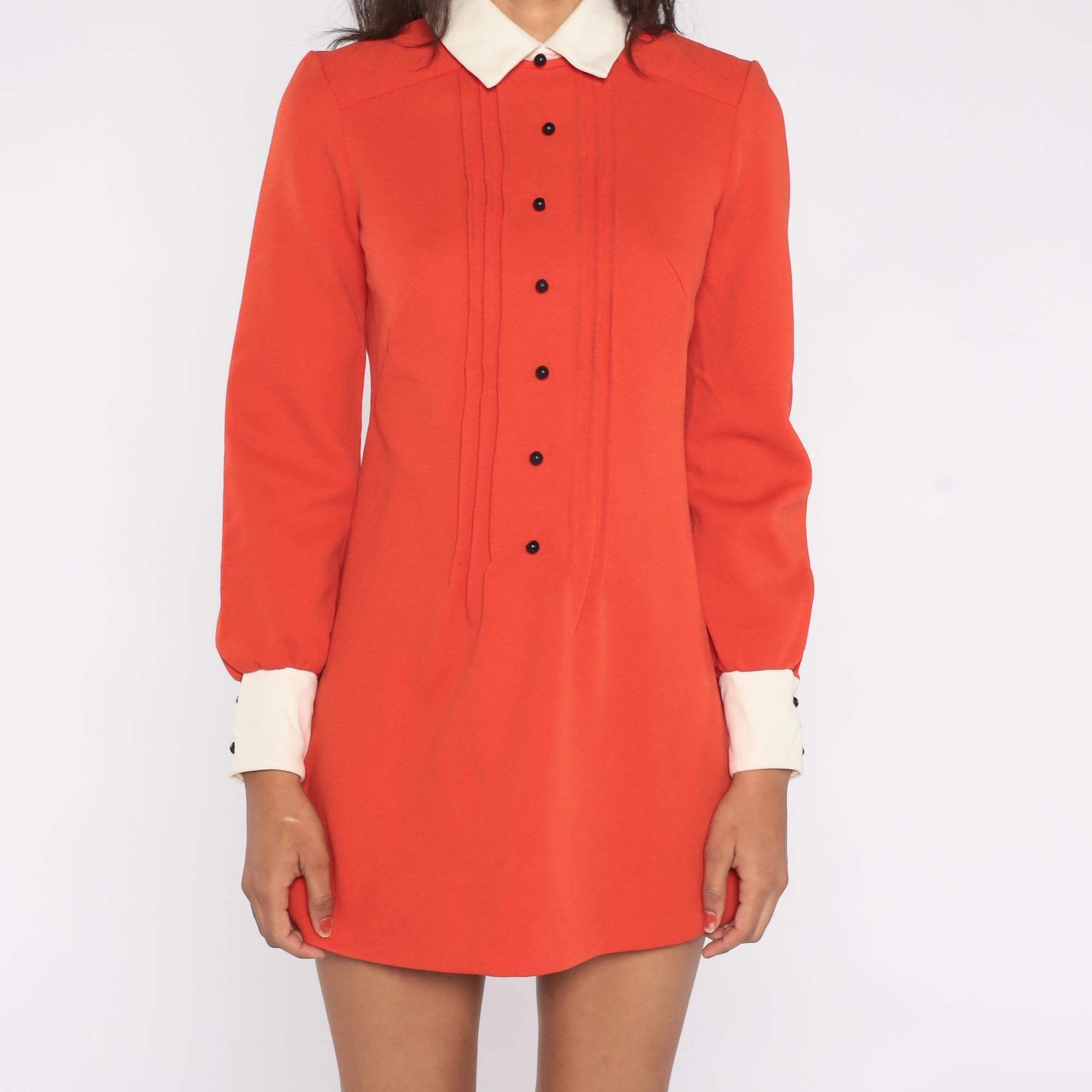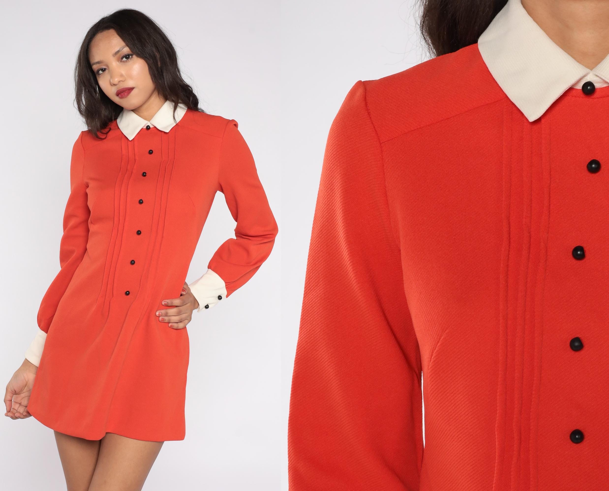 70s orange mini dress. The dress features a distinctive white Peter Pan collar and matching white button cuffs that create dramatic contrast against the bold red fabric. Three vertical pintuck pleats run down the center of the bodice, framing a row of black buttons that extend from collar to mid-torso. The A-line silhouette creates a flattering shape with long sleeves that gather slightly at the cuffs. A concealed back zipper provides a sleek closure.