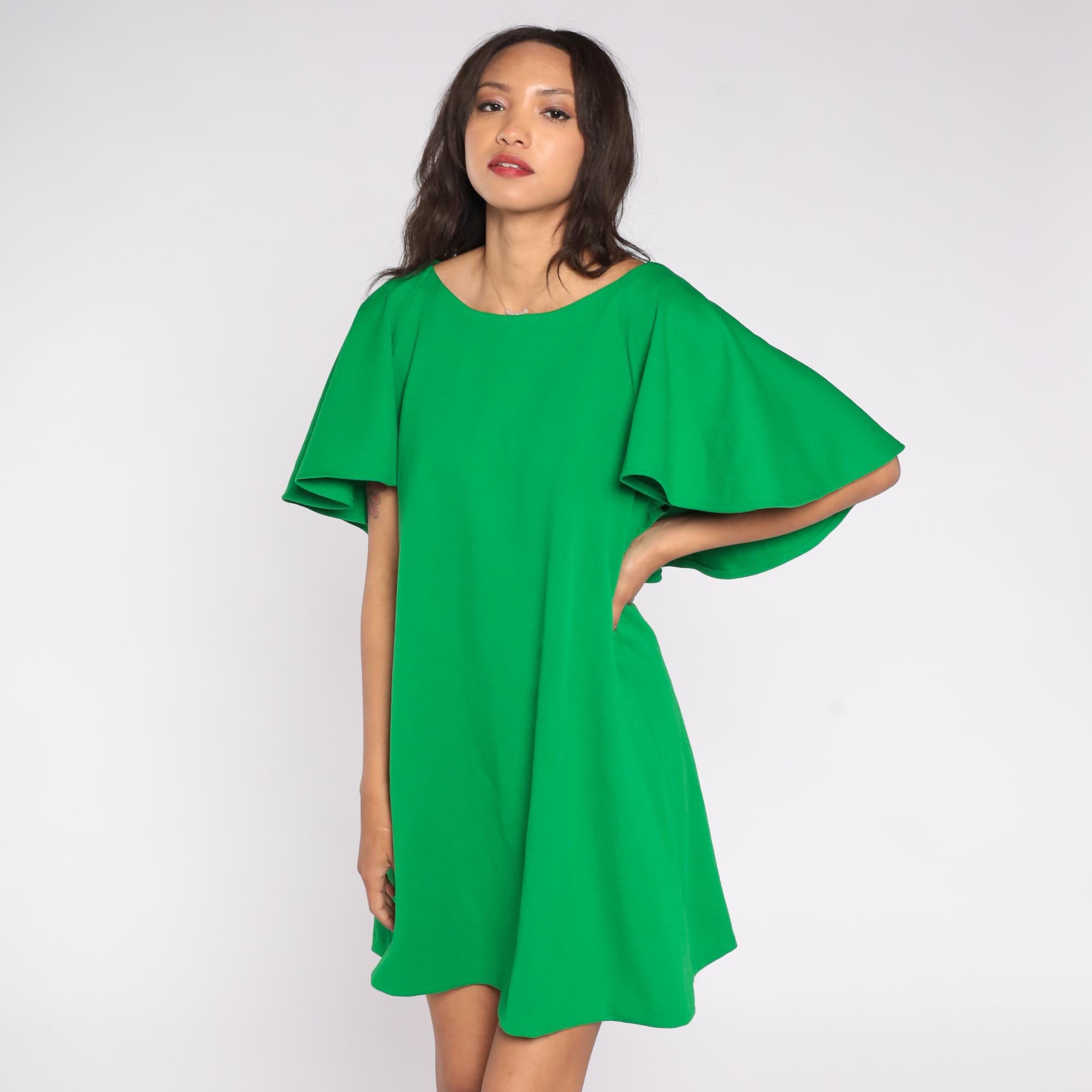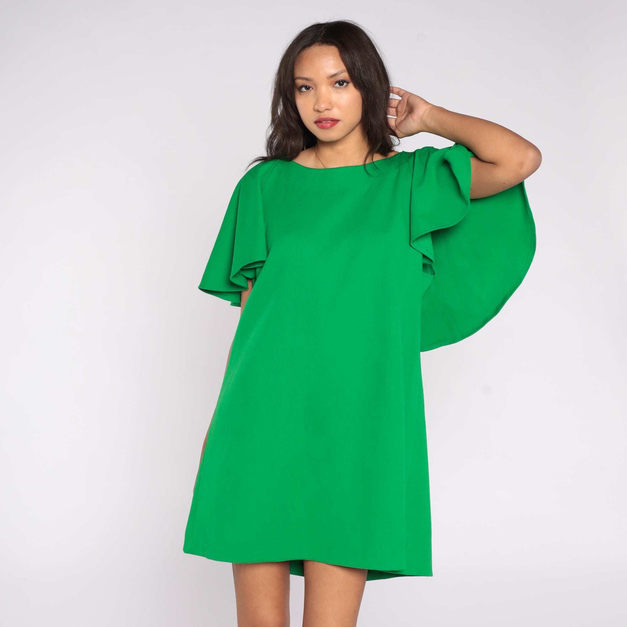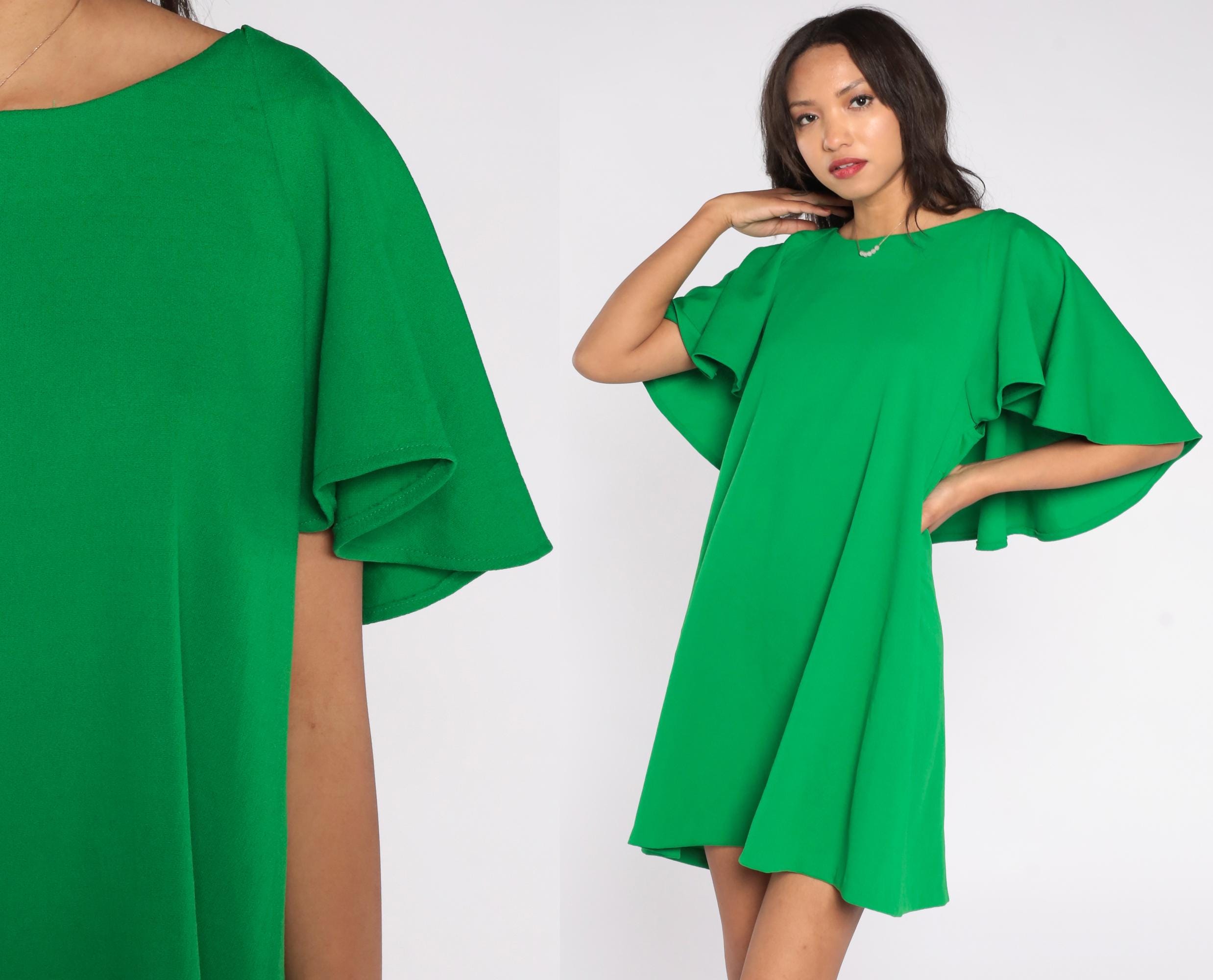 70s emerald green mini dress. The standout feature is the dramatic cape-style flutter sleeves that create elegant wing-like extensions from shoulder to elbow. The shift silhouette offers a clean, minimalist line with a slight A-line shape that skims the body.