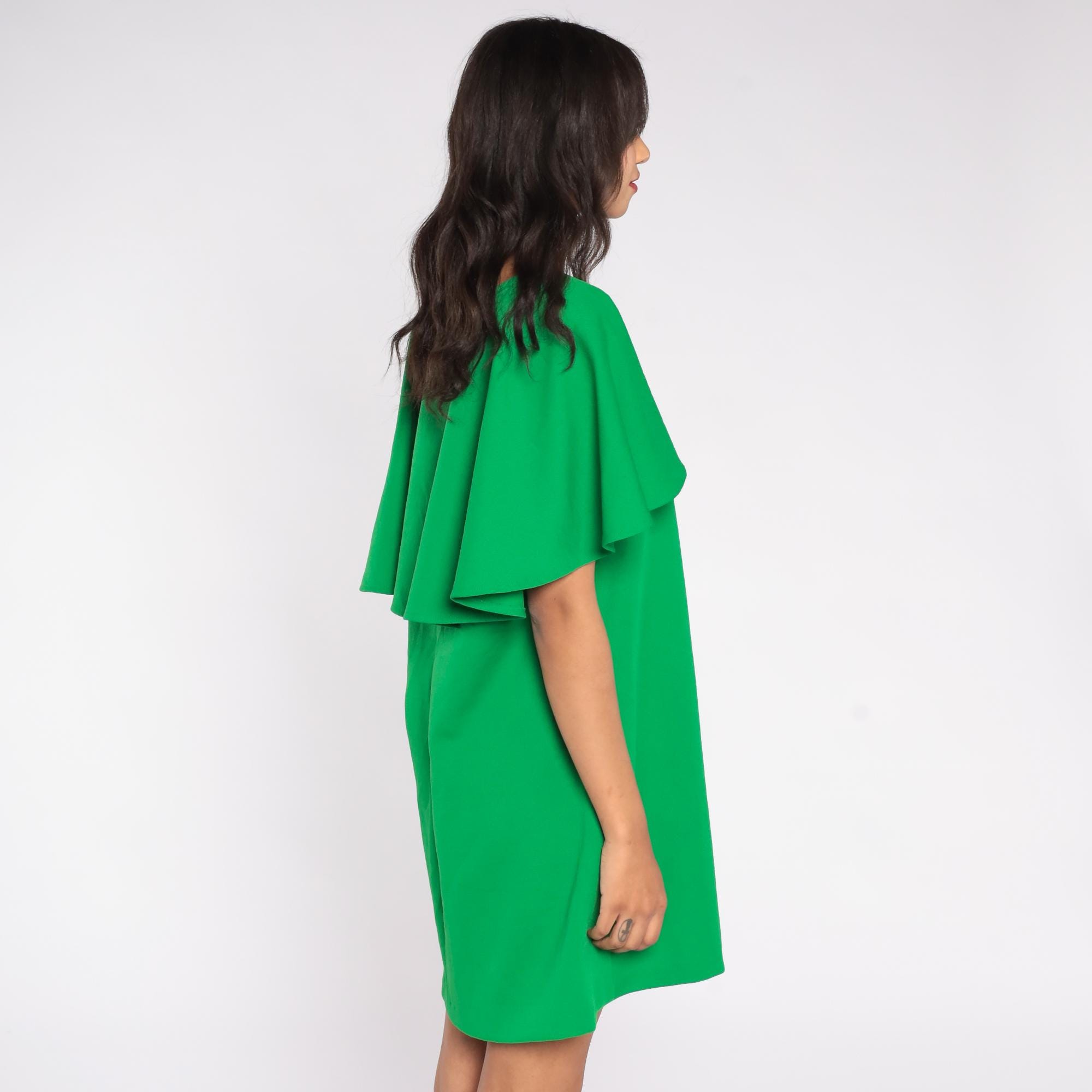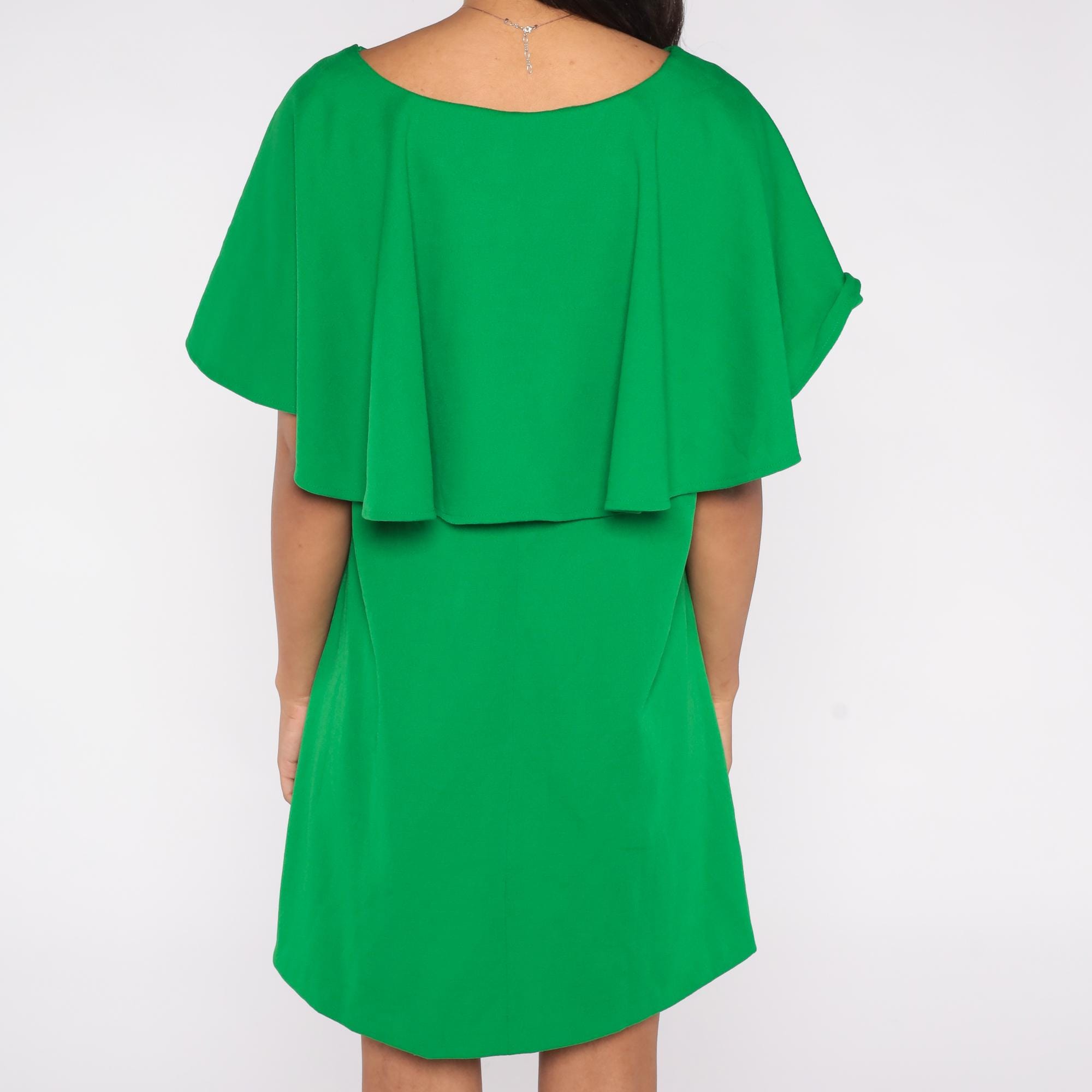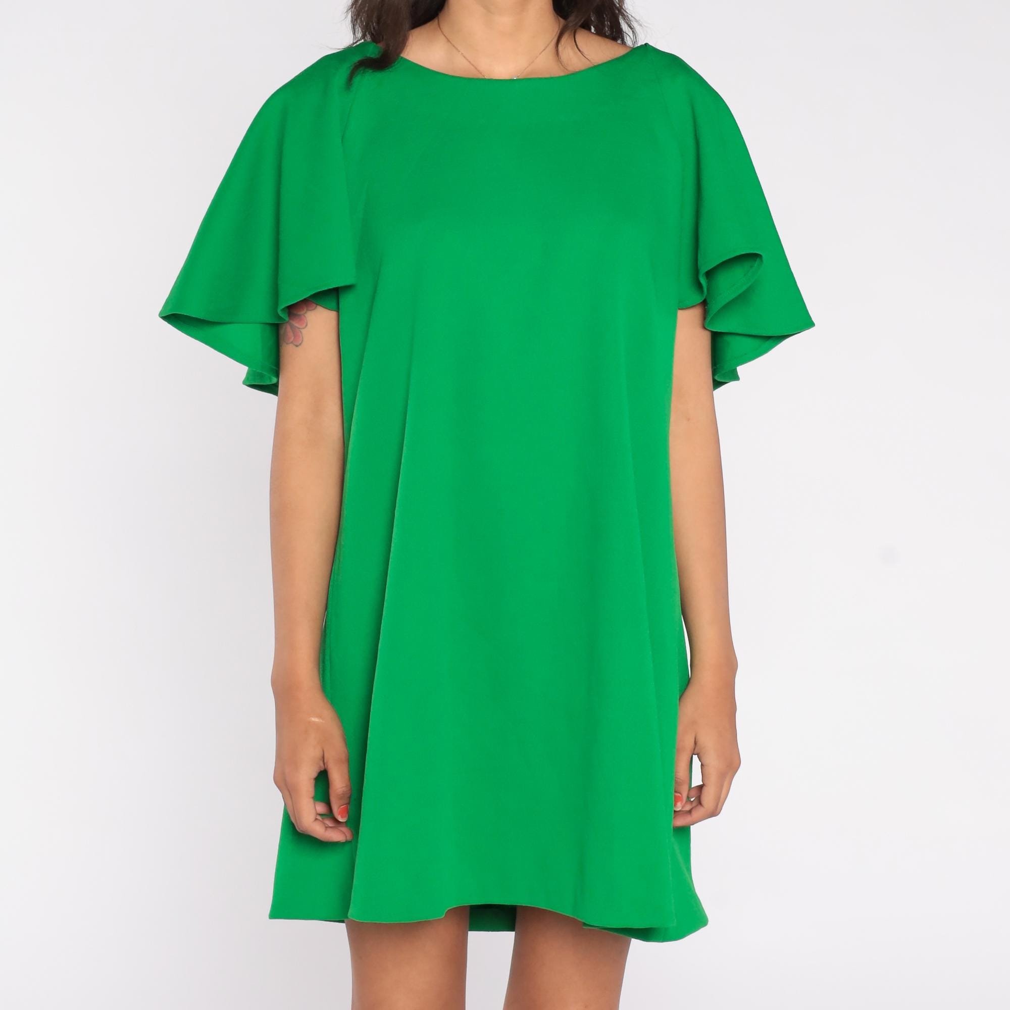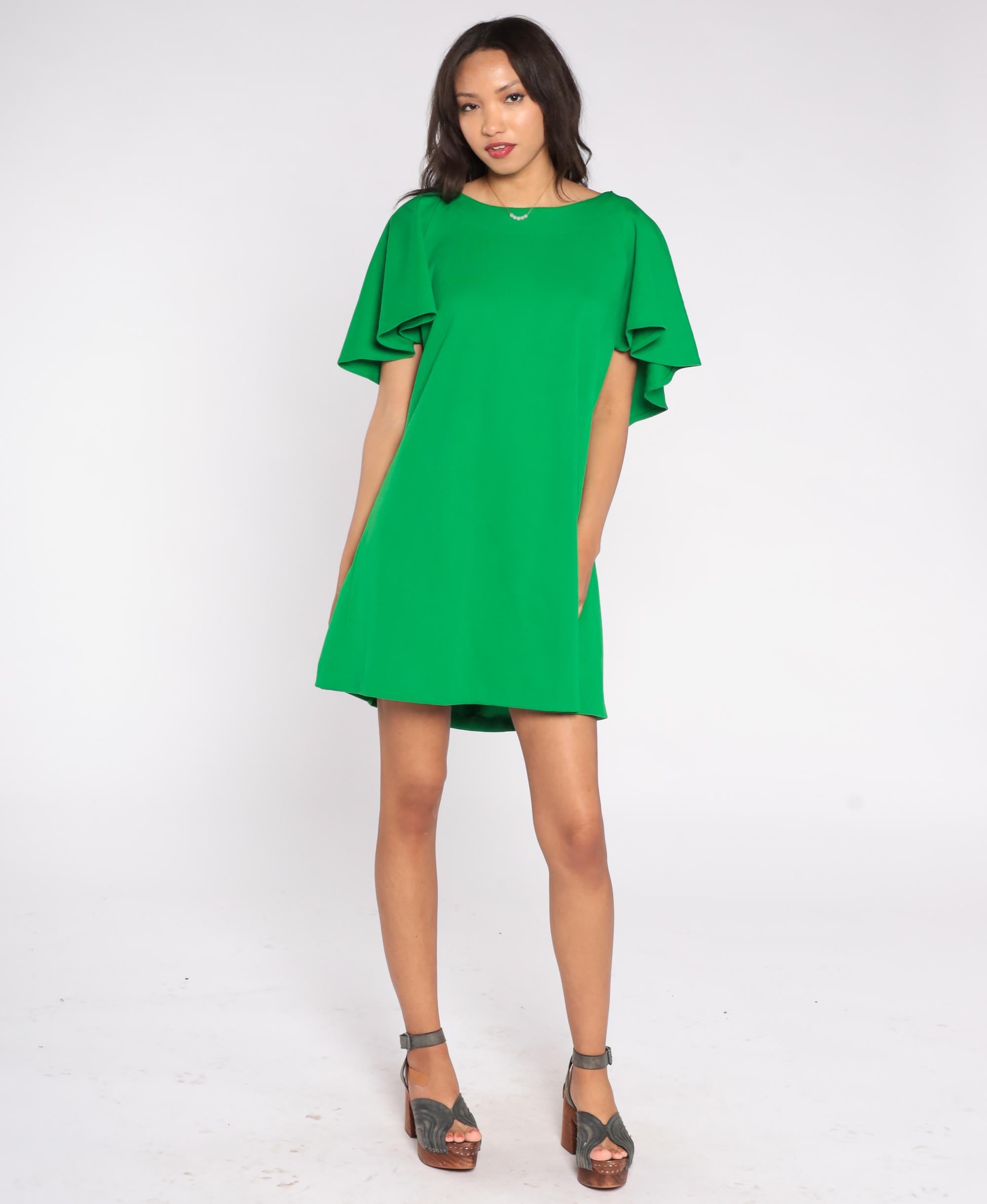70s emerald green mini dress. The standout feature is the dramatic cape-style flutter sleeves that create elegant wing-like extensions from shoulder to elbow. The shift silhouette offers a clean, minimalist line with a slight A-line shape that skims the body.