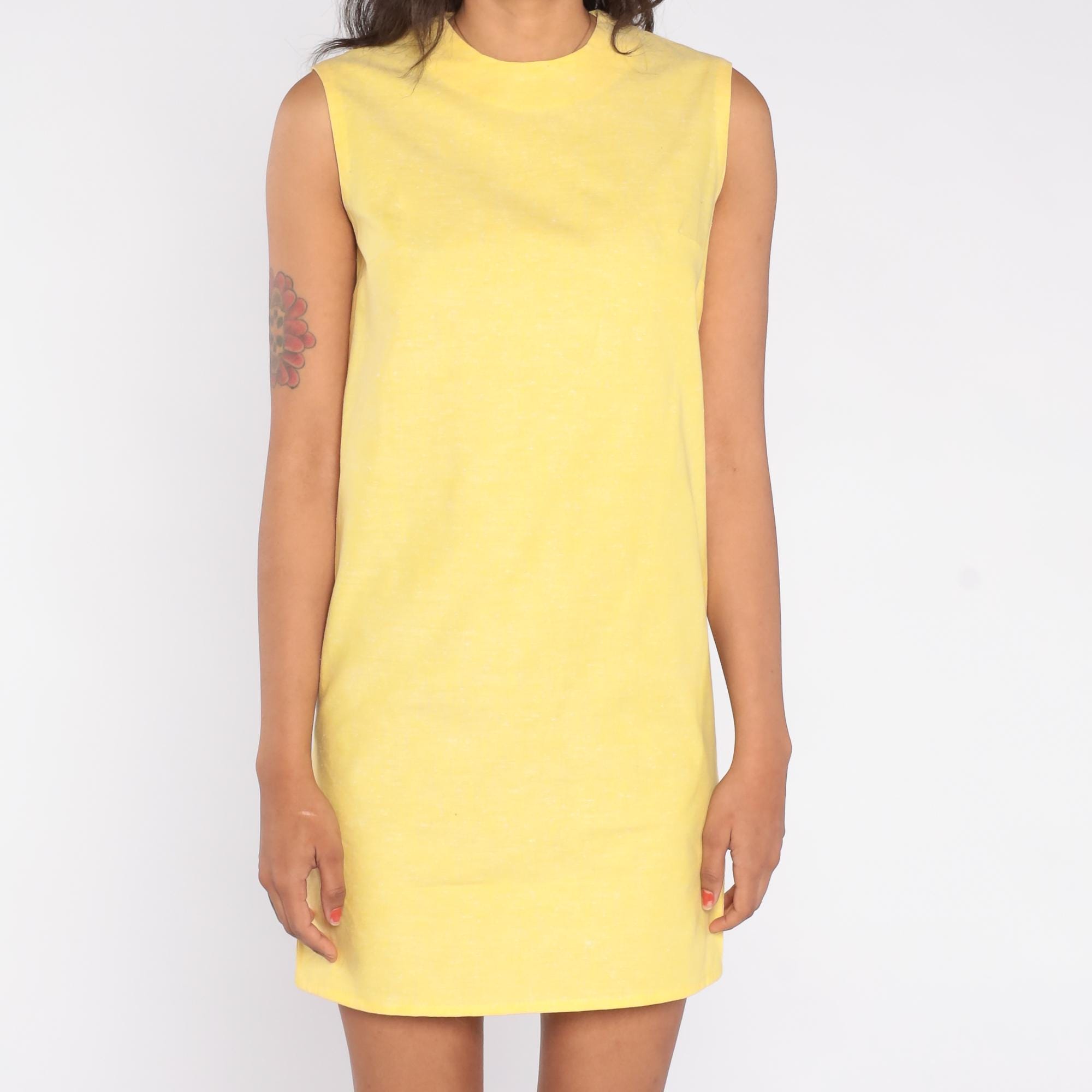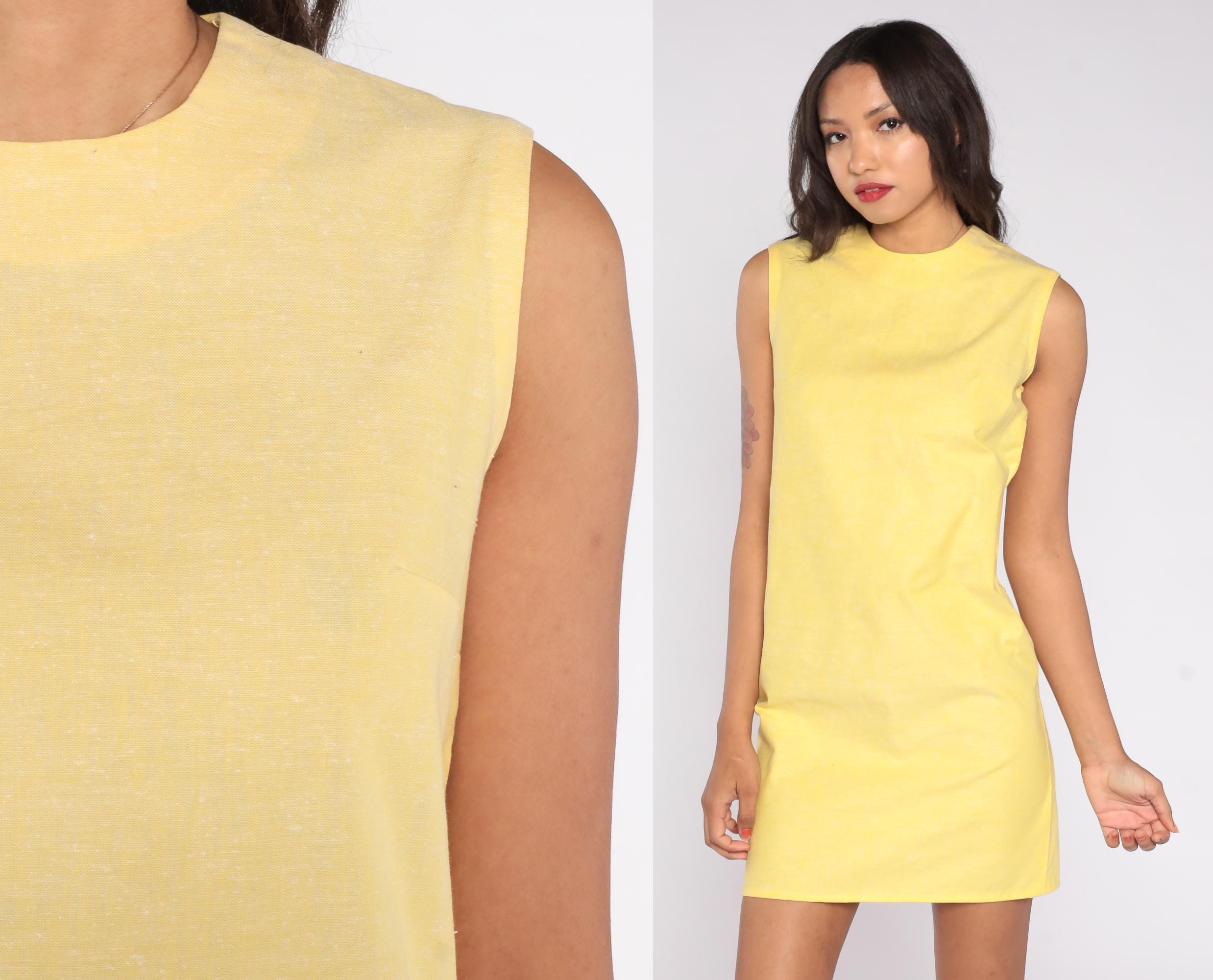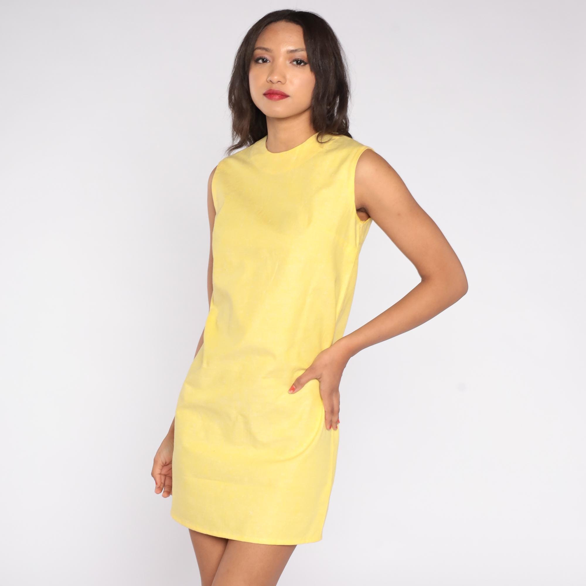 60s yellow mini mod shift dress. The sleeveless silhouette features a simple crew neckline and a straight cut that falls to a mini length. The fabric has a subtle natural texture that adds depth to the soft yellow hue. The back features a concealed zipper closure for a sleek finish.