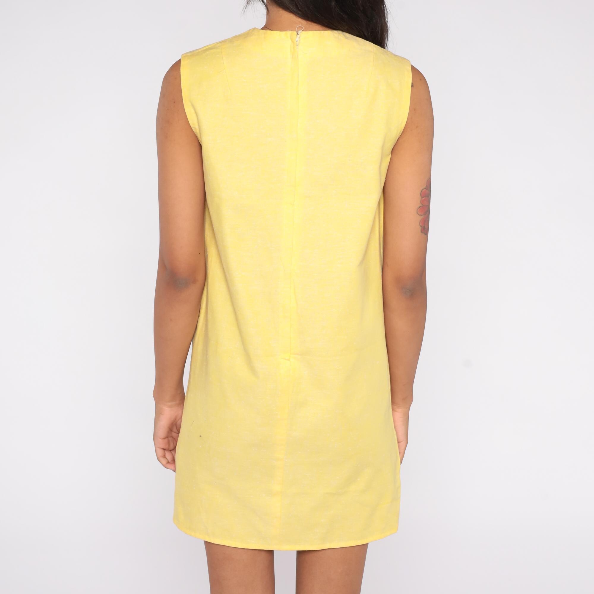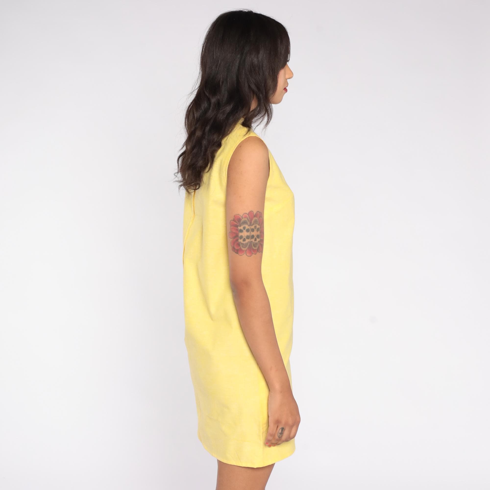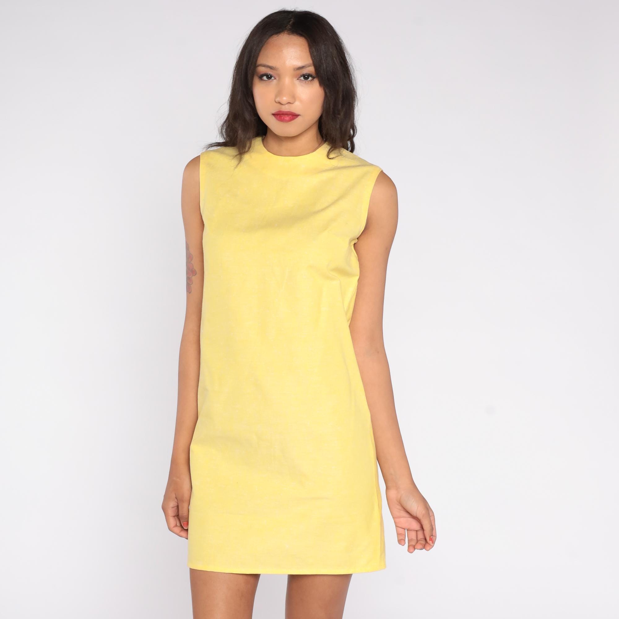 60s yellow mini mod shift dress. The sleeveless silhouette features a simple crew neckline and a straight cut that falls to a mini length. The fabric has a subtle natural texture that adds depth to the soft yellow hue. The back features a concealed zipper closure for a sleek finish.