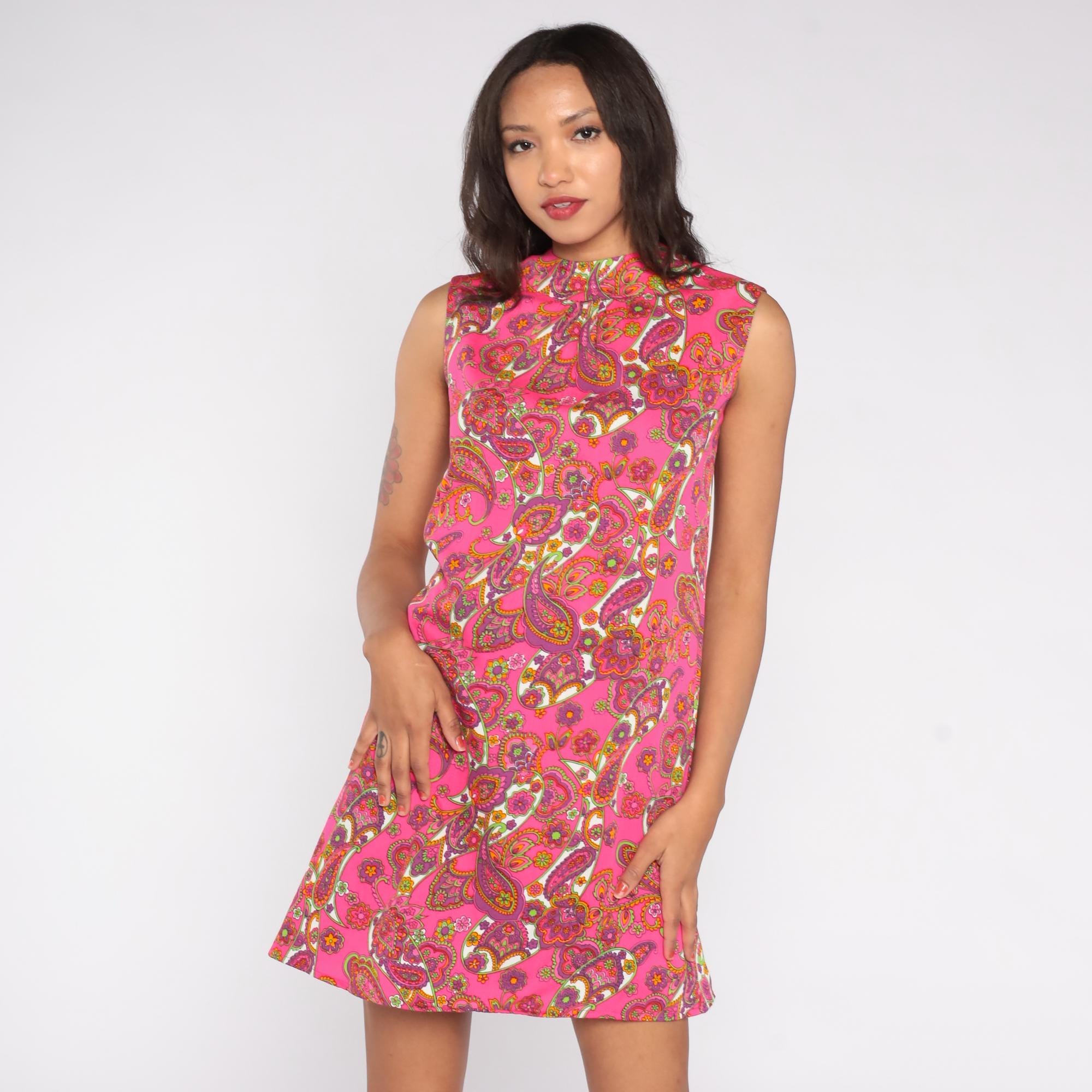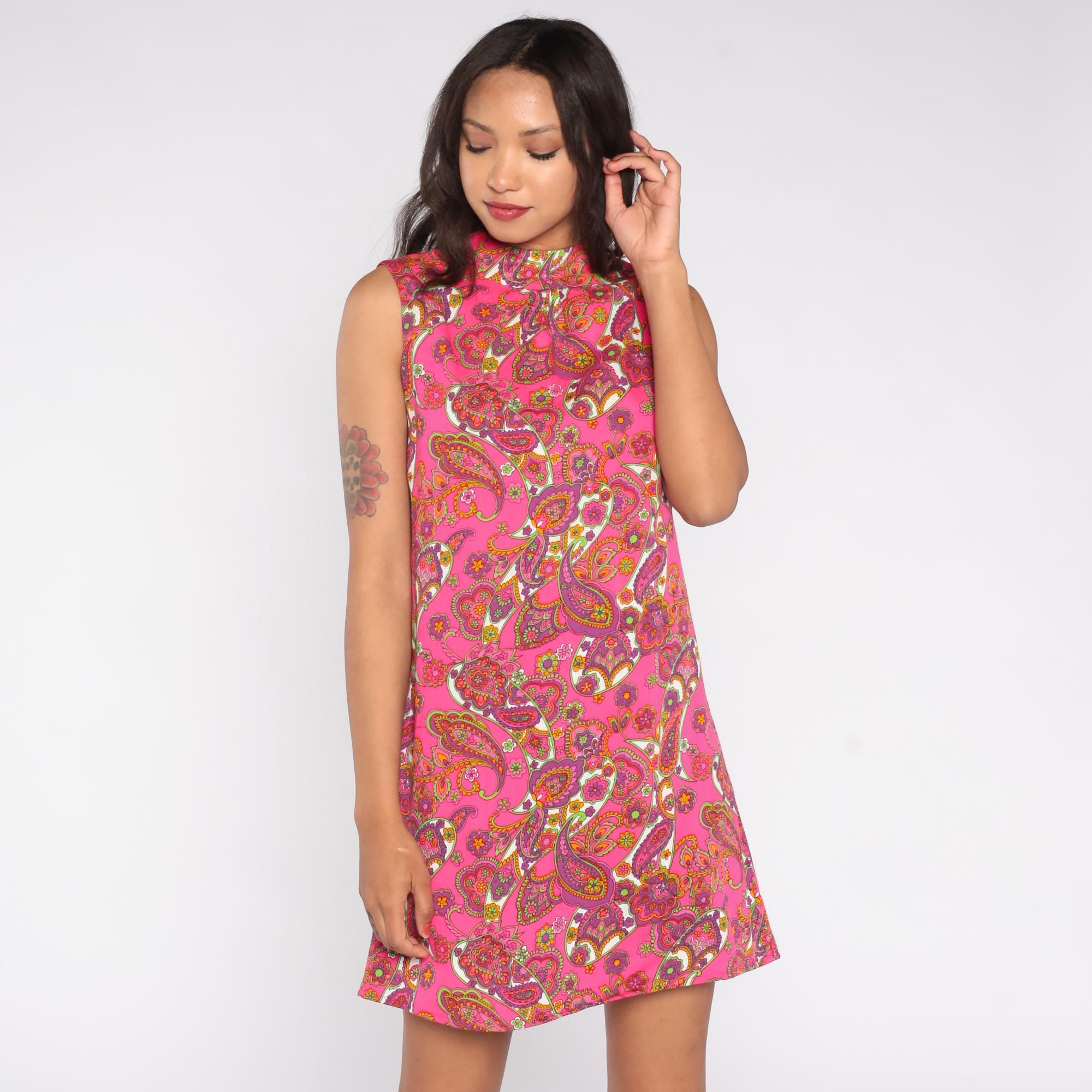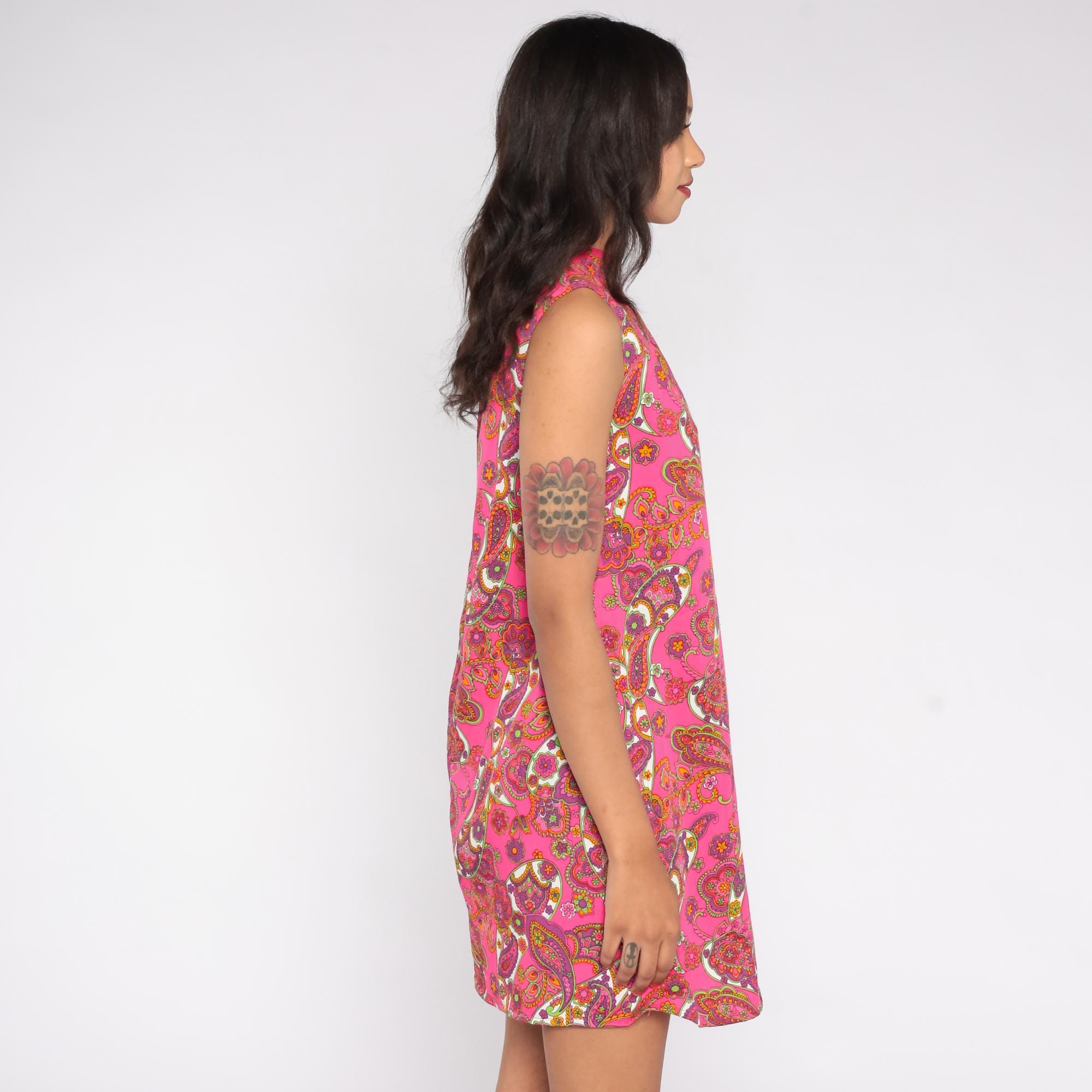 70s hot pink paisley mini dress. The vivid fuchsia background showcases an intricate paisley pattern in rich purple, orange, green, and yellow tones. The sleeveless shift silhouette features a modest mock turtleneck and a slight