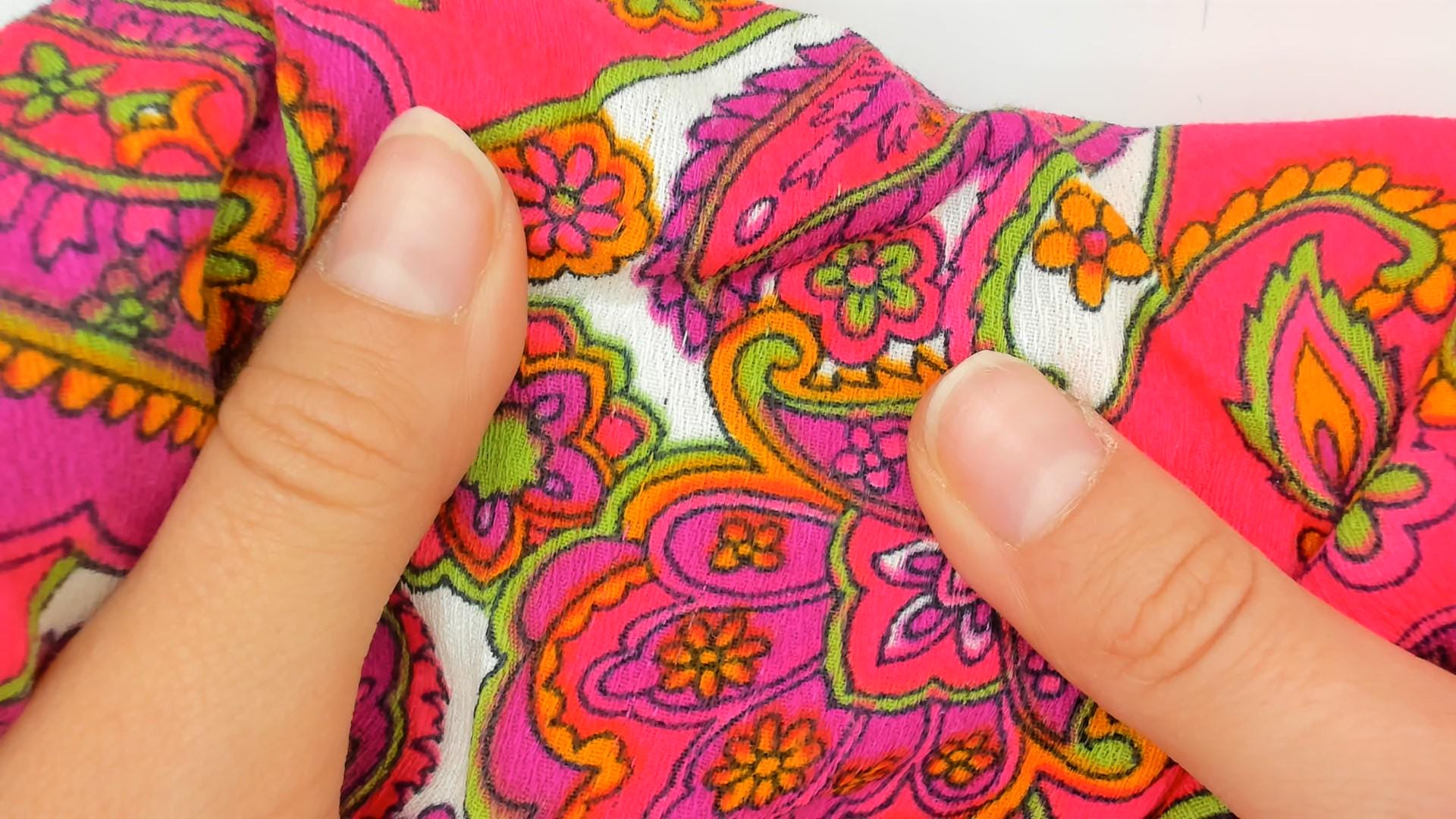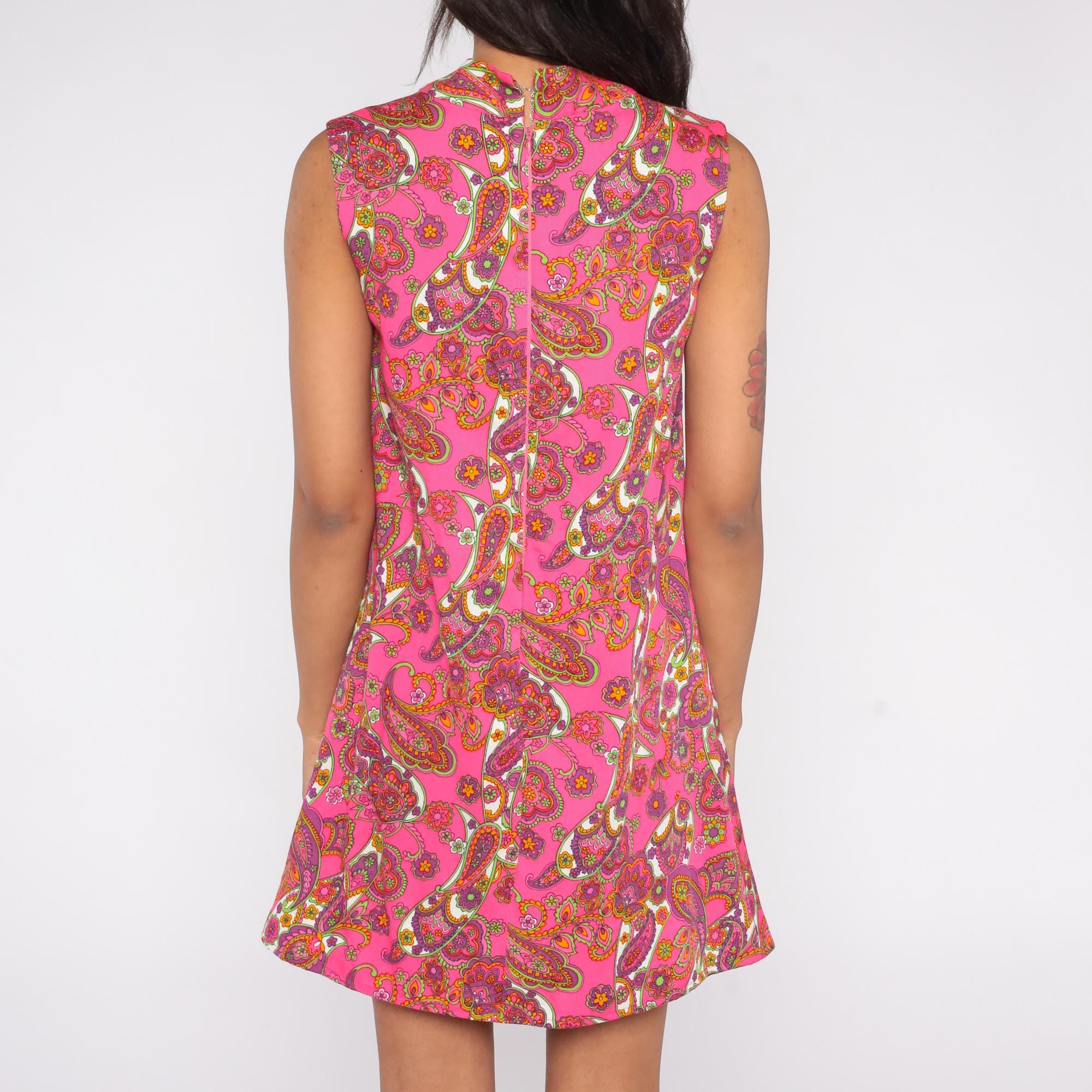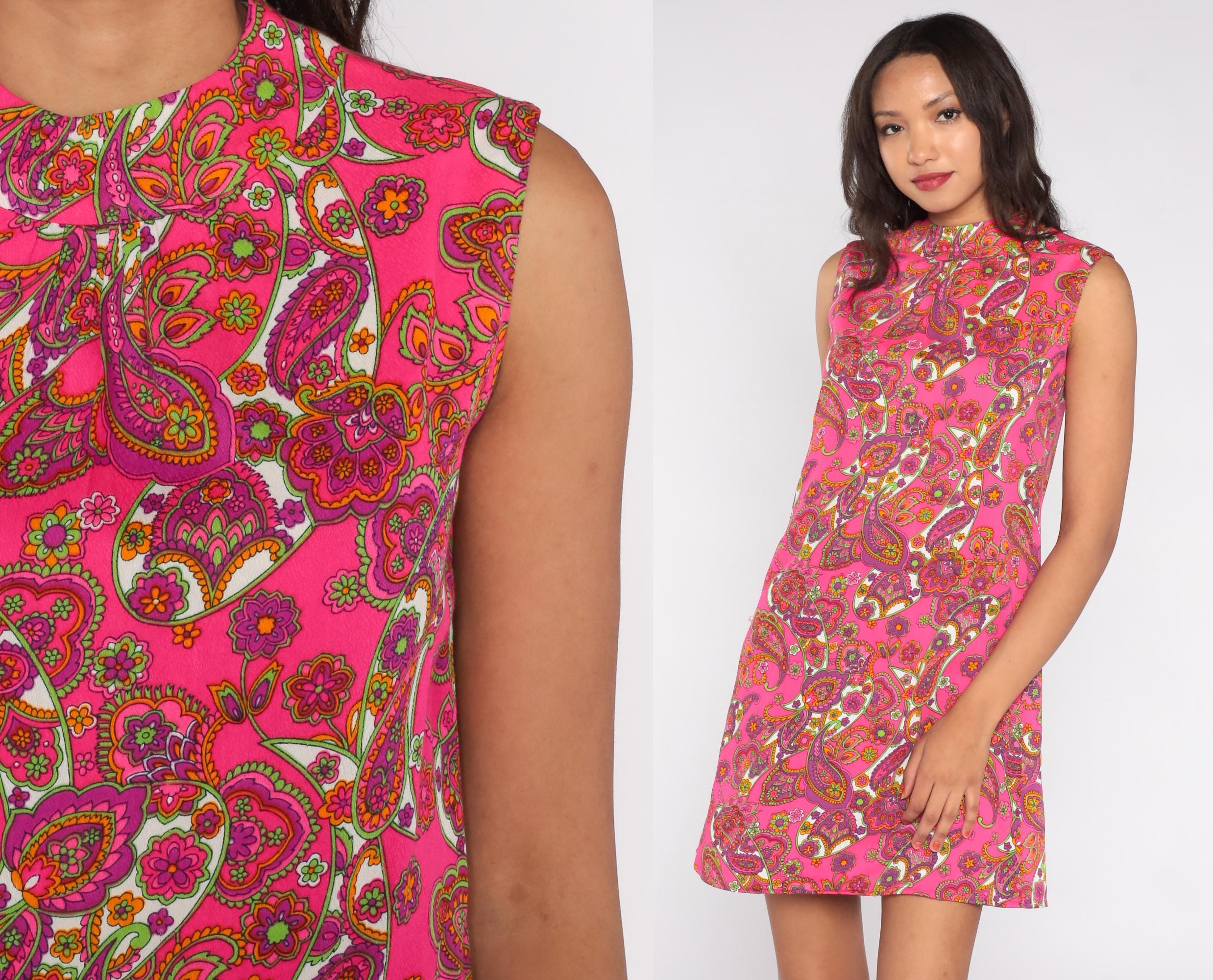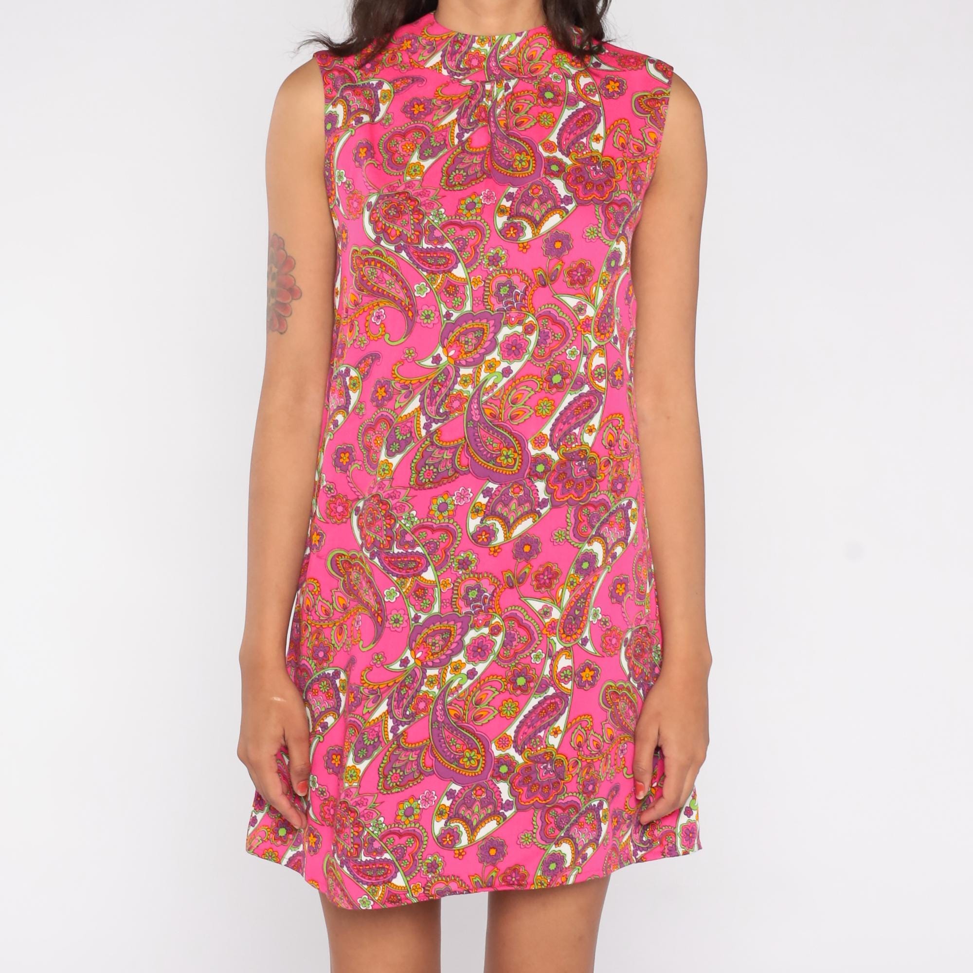 70s hot pink paisley mini dress. The vivid fuchsia background showcases an intricate paisley pattern in rich purple, orange, green, and yellow tones. The sleeveless shift silhouette features a modest mock turtleneck and a slight