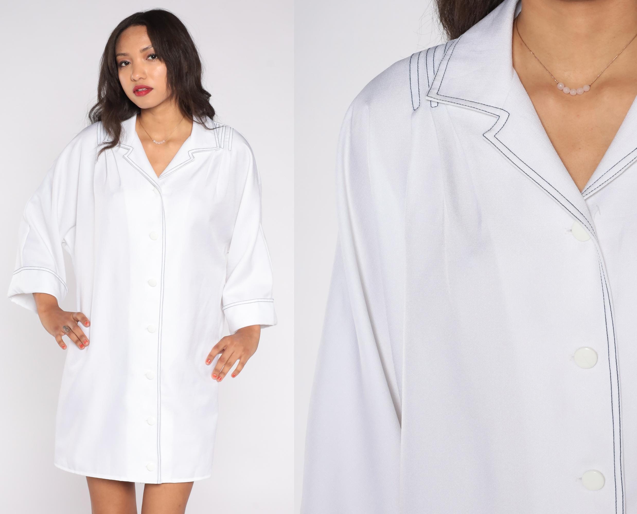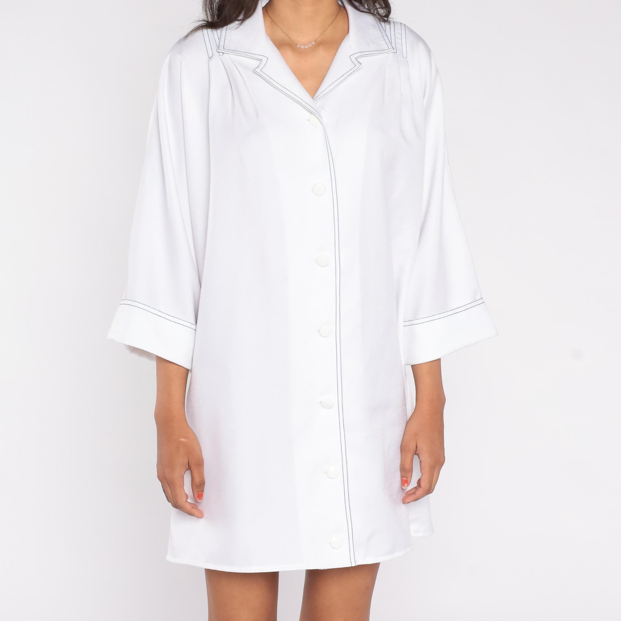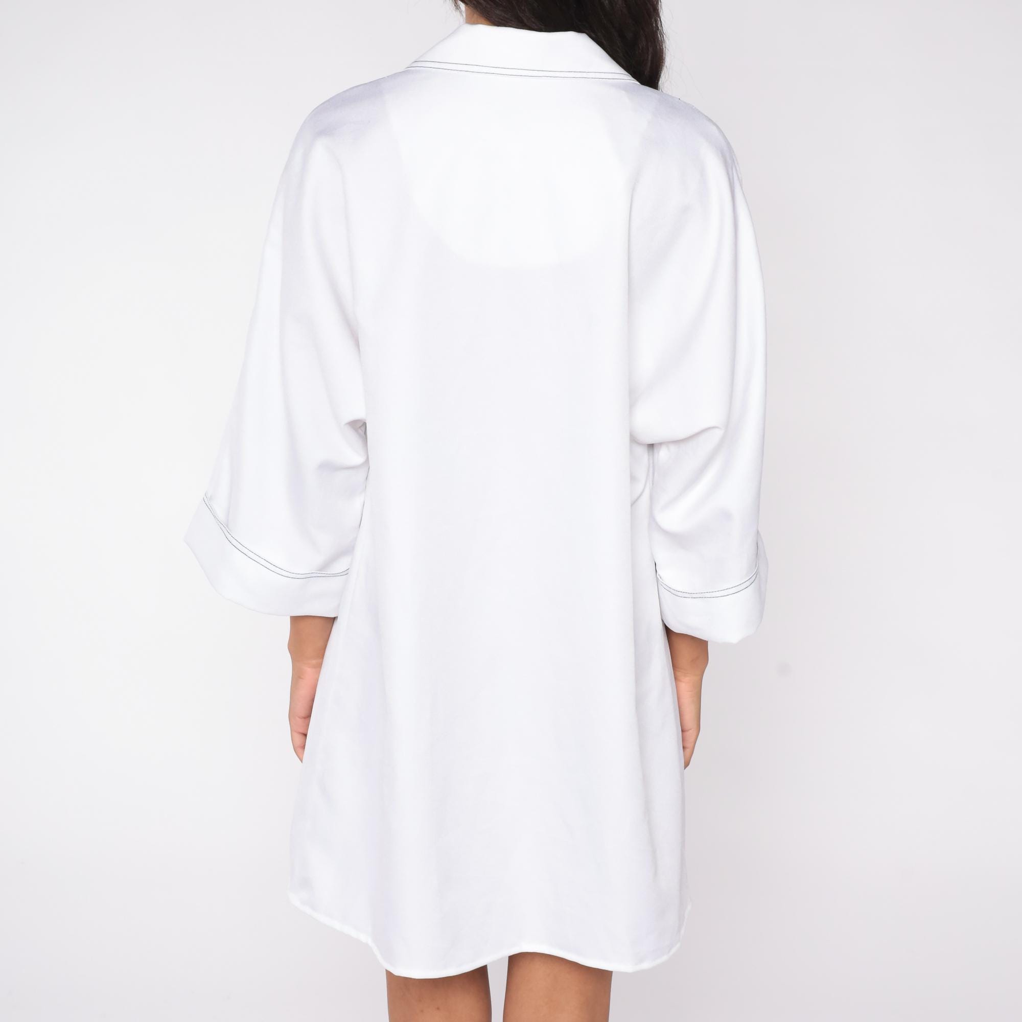 70s white shirt dress. Made by Mendel of Dallas, a quality American designer, this dress features distinctive black contrast topstitching that outlines the collar, placket and cuffs for a striking graphic effect. The structured design includes a notched lapel collar, button-front closure with white buttons, and elegant three-quarter sleeves with defined cuffs.