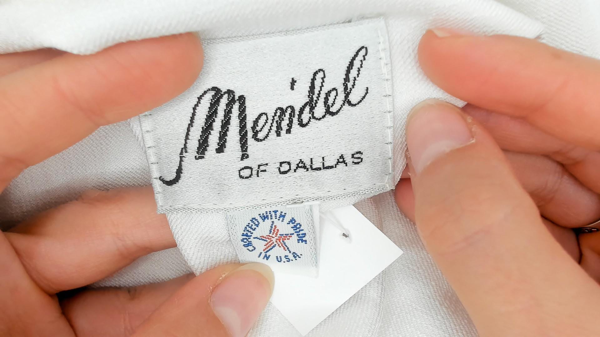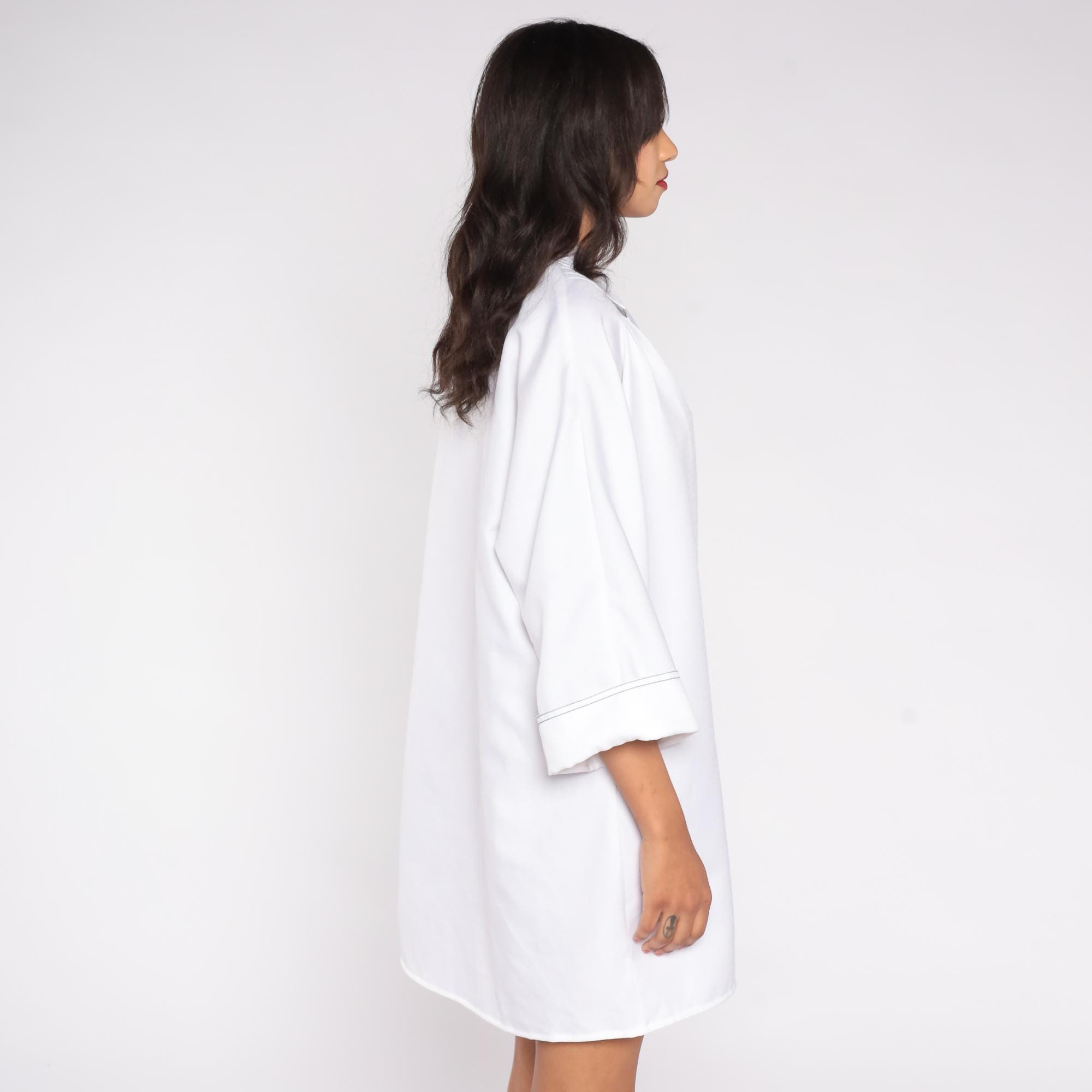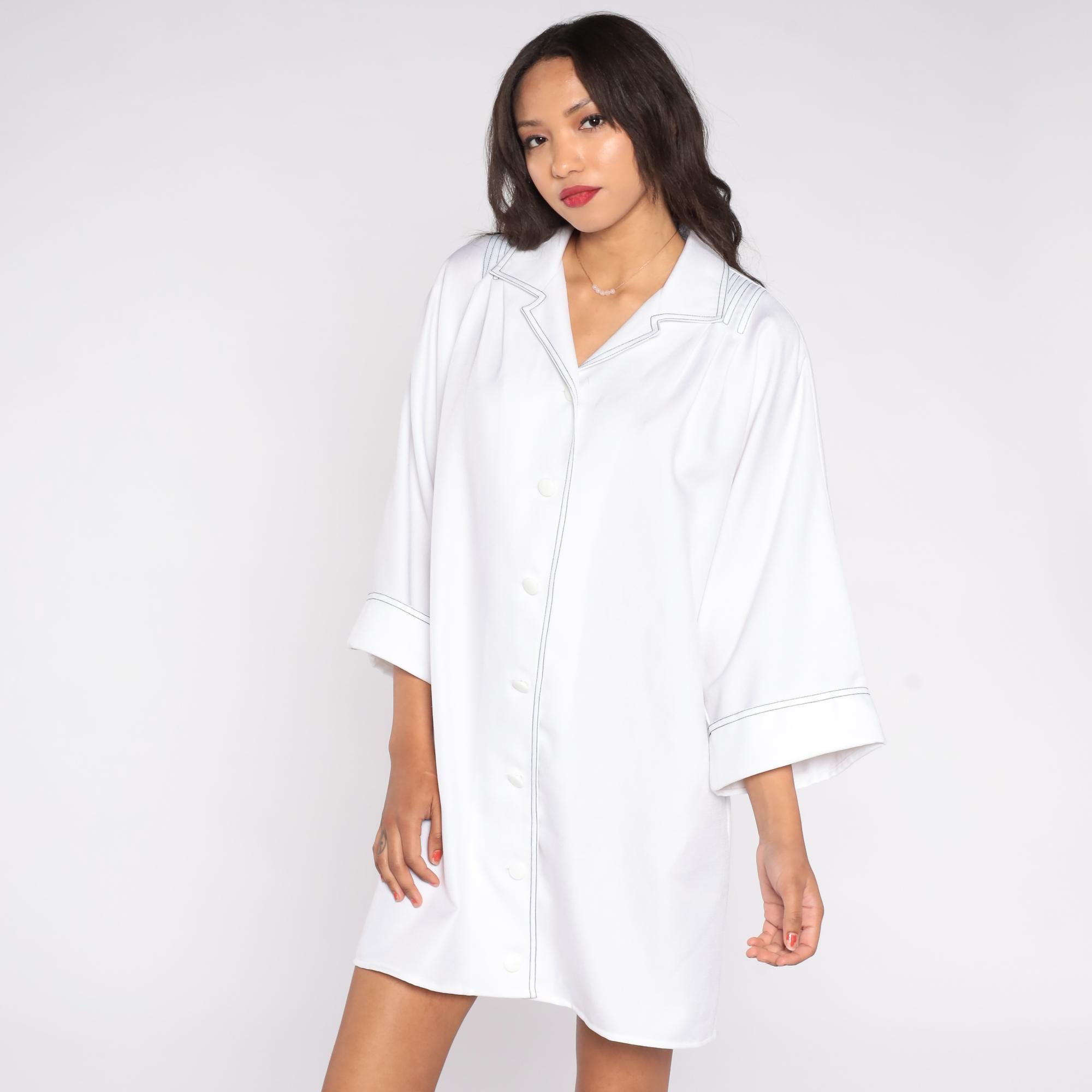 70s white shirt dress. Made by Mendel of Dallas, a quality American designer, this dress features distinctive black contrast topstitching that outlines the collar, placket and cuffs for a striking graphic effect. The structured design includes a notched lapel collar, button-front closure with white buttons, and elegant three-quarter sleeves with defined cuffs.