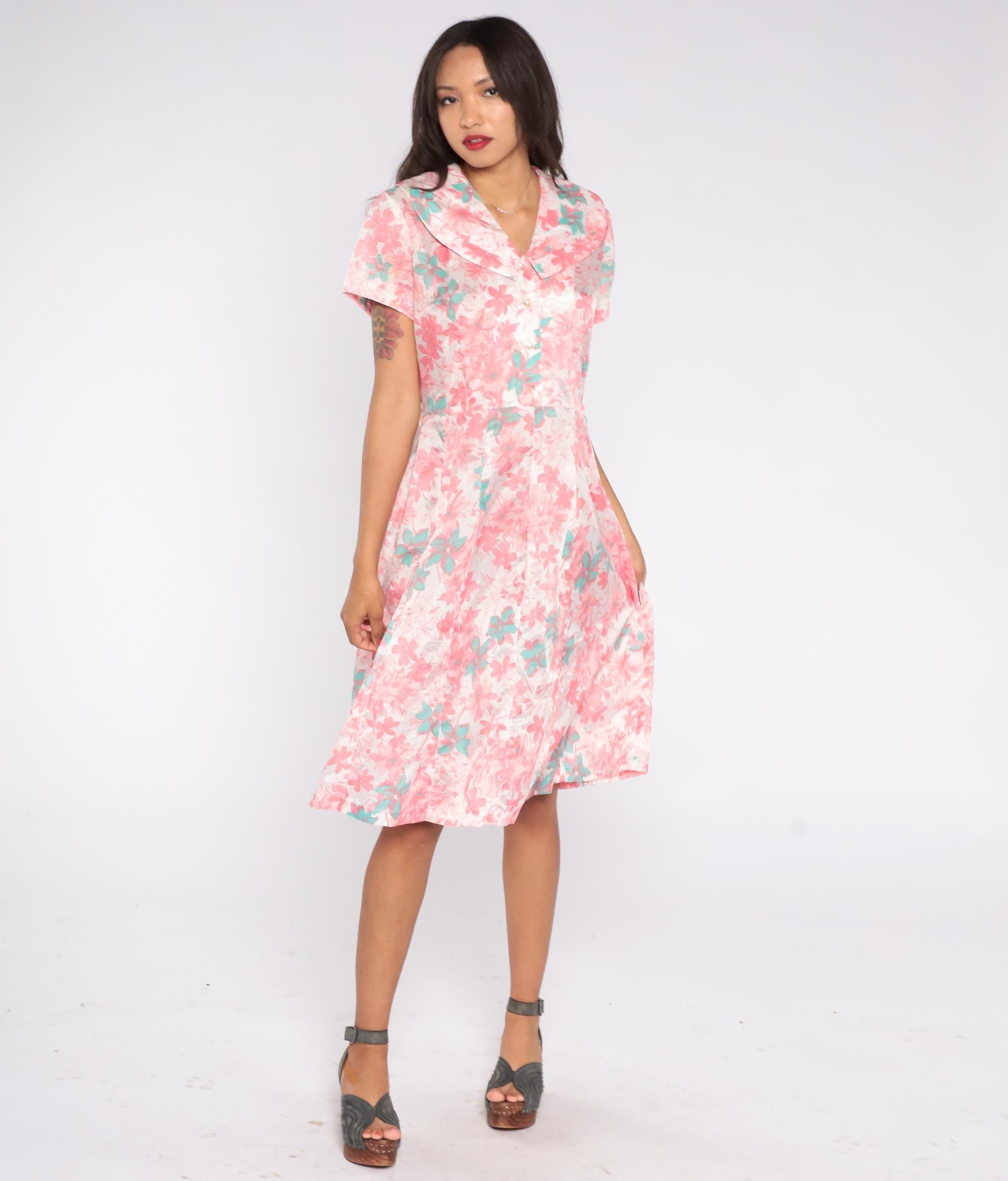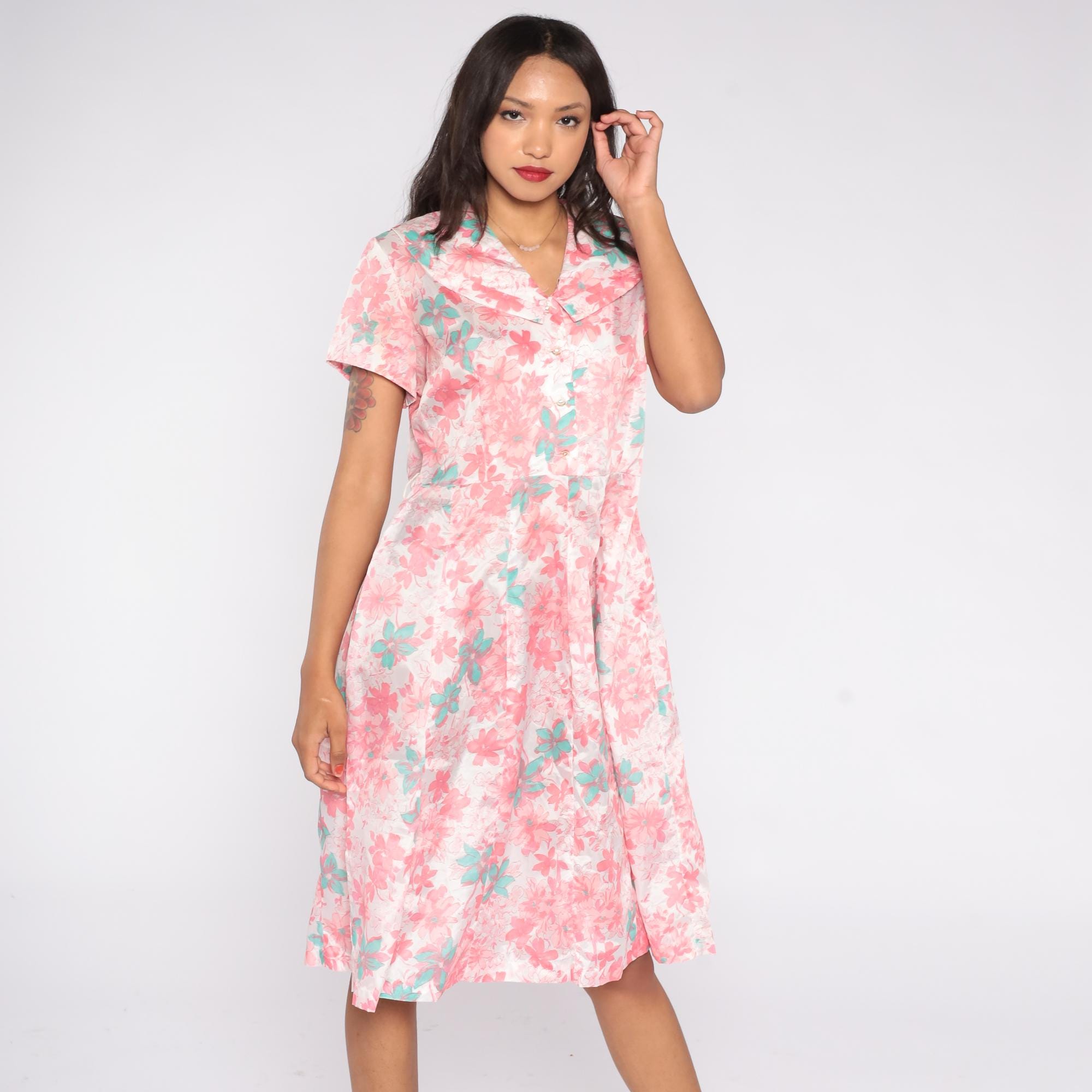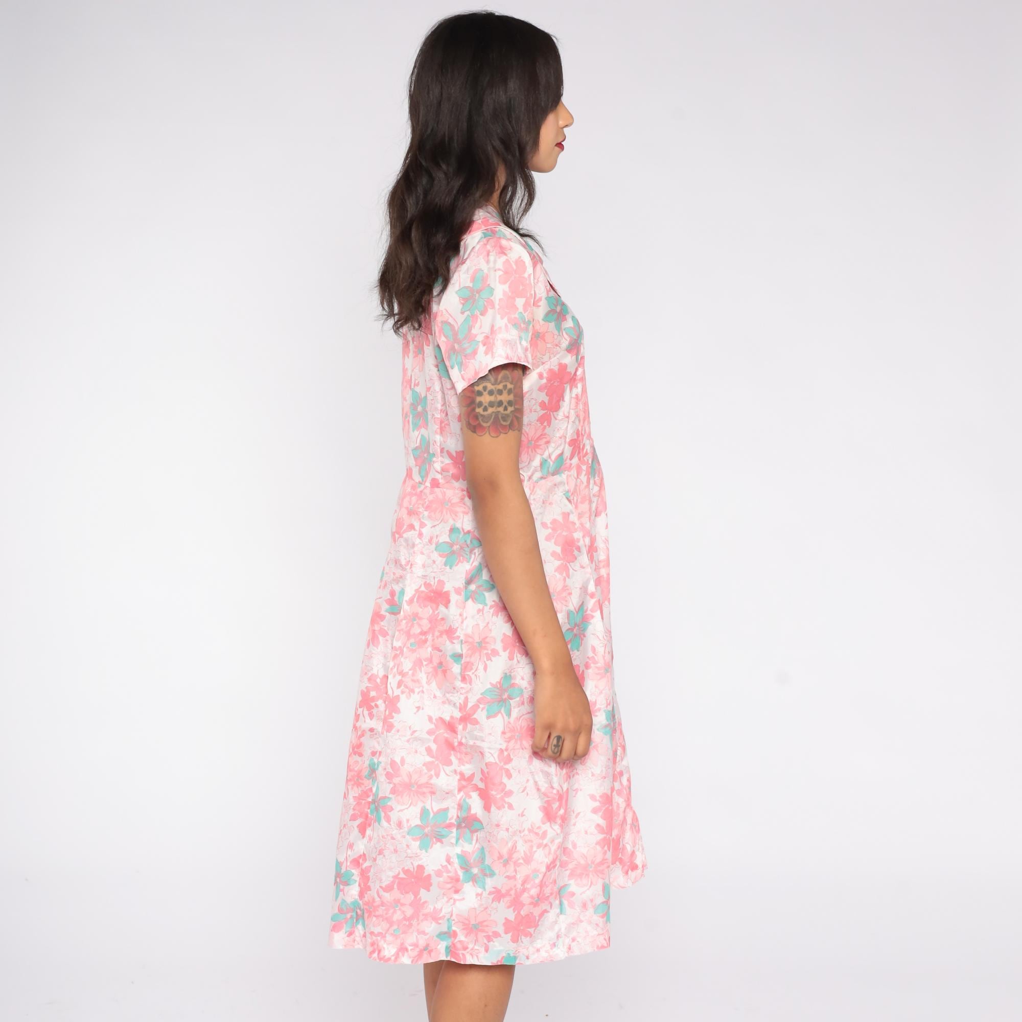 60s shirt dress with a beautiful floral print in pink and mint turquoise against a crisp white background. Made by the classic California brand Mode O'Day, this dress features an elegant wide collar with a flattering shawl neckline. The button-front design is accented with pearlescent buttons that add a feminine touch. The bodice is fitted at the natural waistline then flows into a gently gathered full skirt that hits at a versatile midi length.