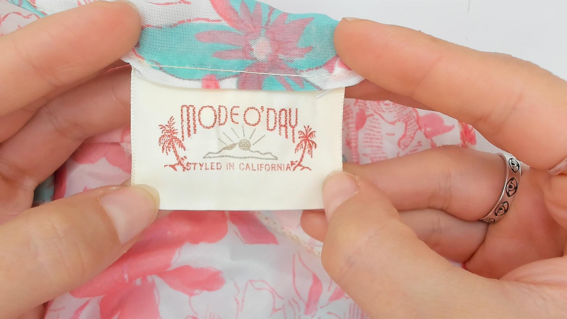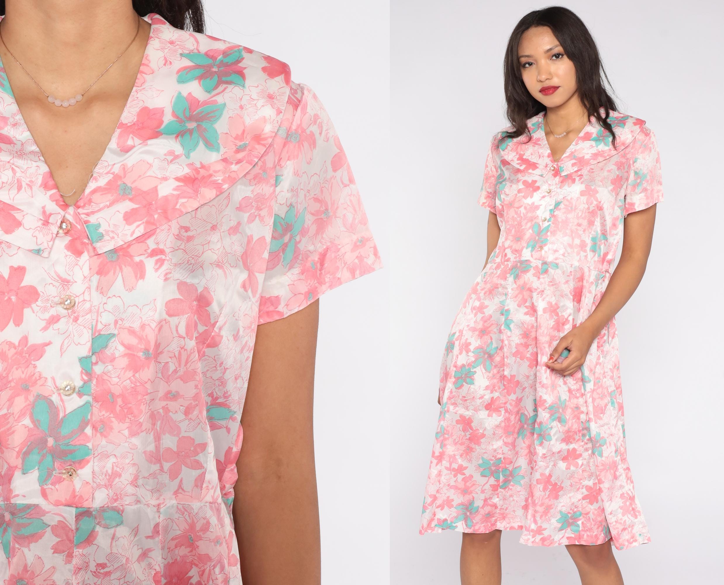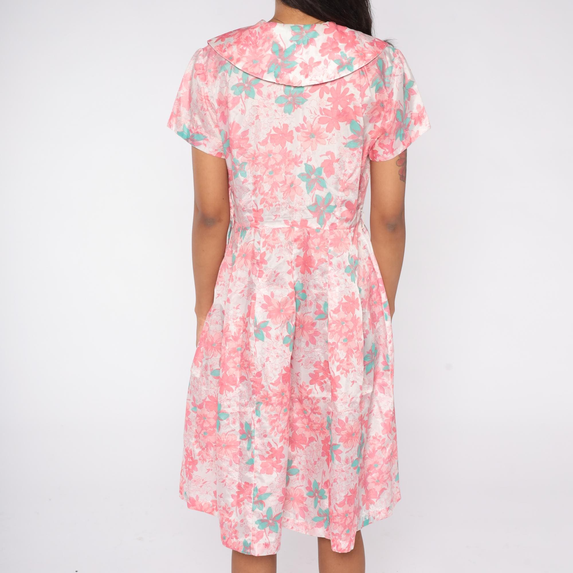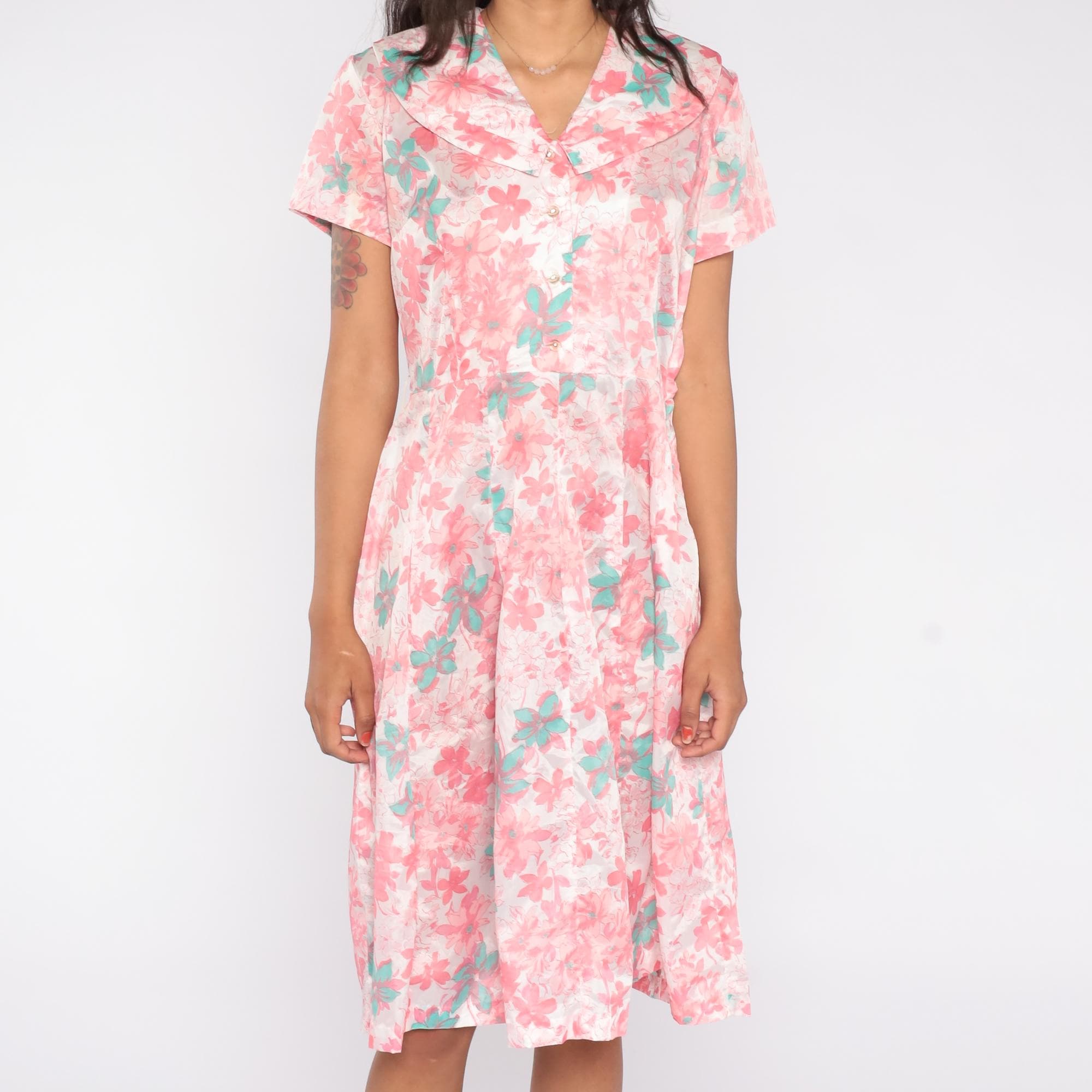 60s shirt dress with a beautiful floral print in pink and mint turquoise against a crisp white background. Made by the classic California brand Mode O'Day, this dress features an elegant wide collar with a flattering shawl neckline. The button-front design is accented with pearlescent buttons that add a feminine touch. The bodice is fitted at the natural waistline then flows into a gently gathered full skirt that hits at a versatile midi length.