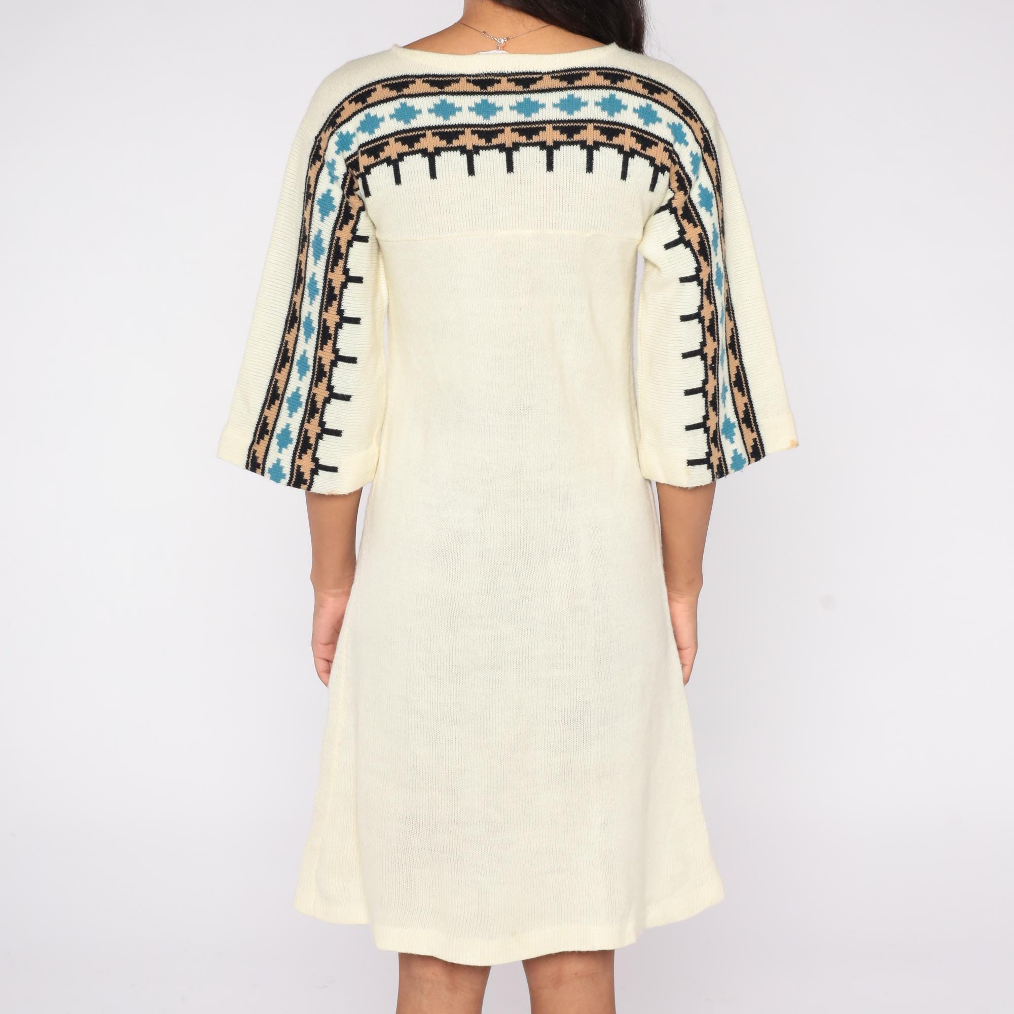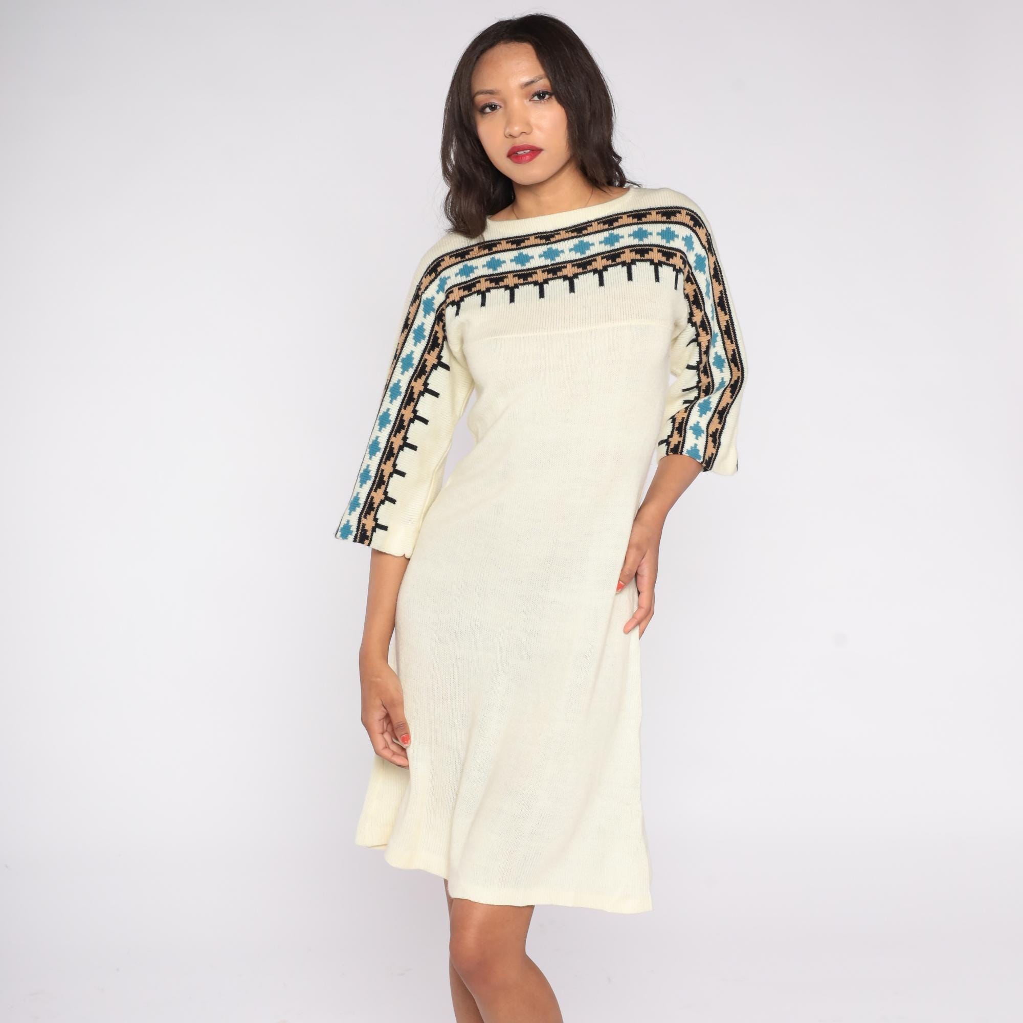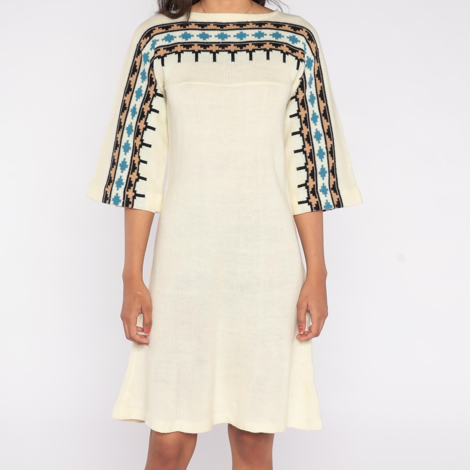 1970s cream knit sweater dress featuring a geometric patterned yoke in black, tan, and teal. The dress has flared three-quarter sleeves, a pullover fit, and a softly draped midi length.