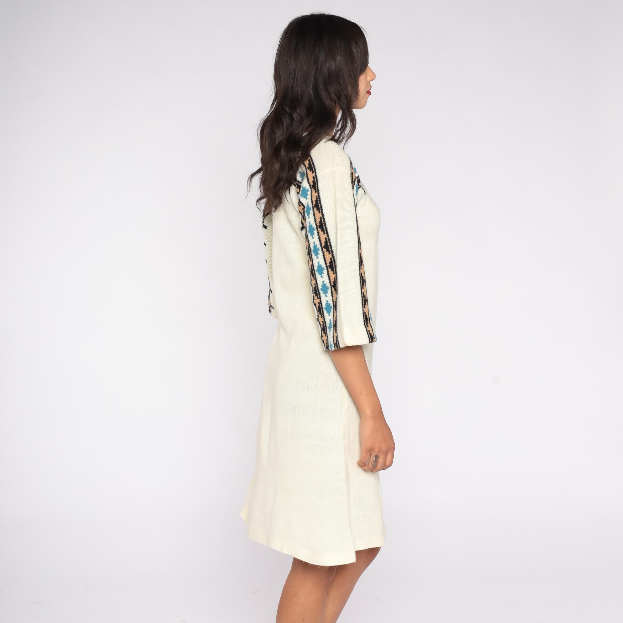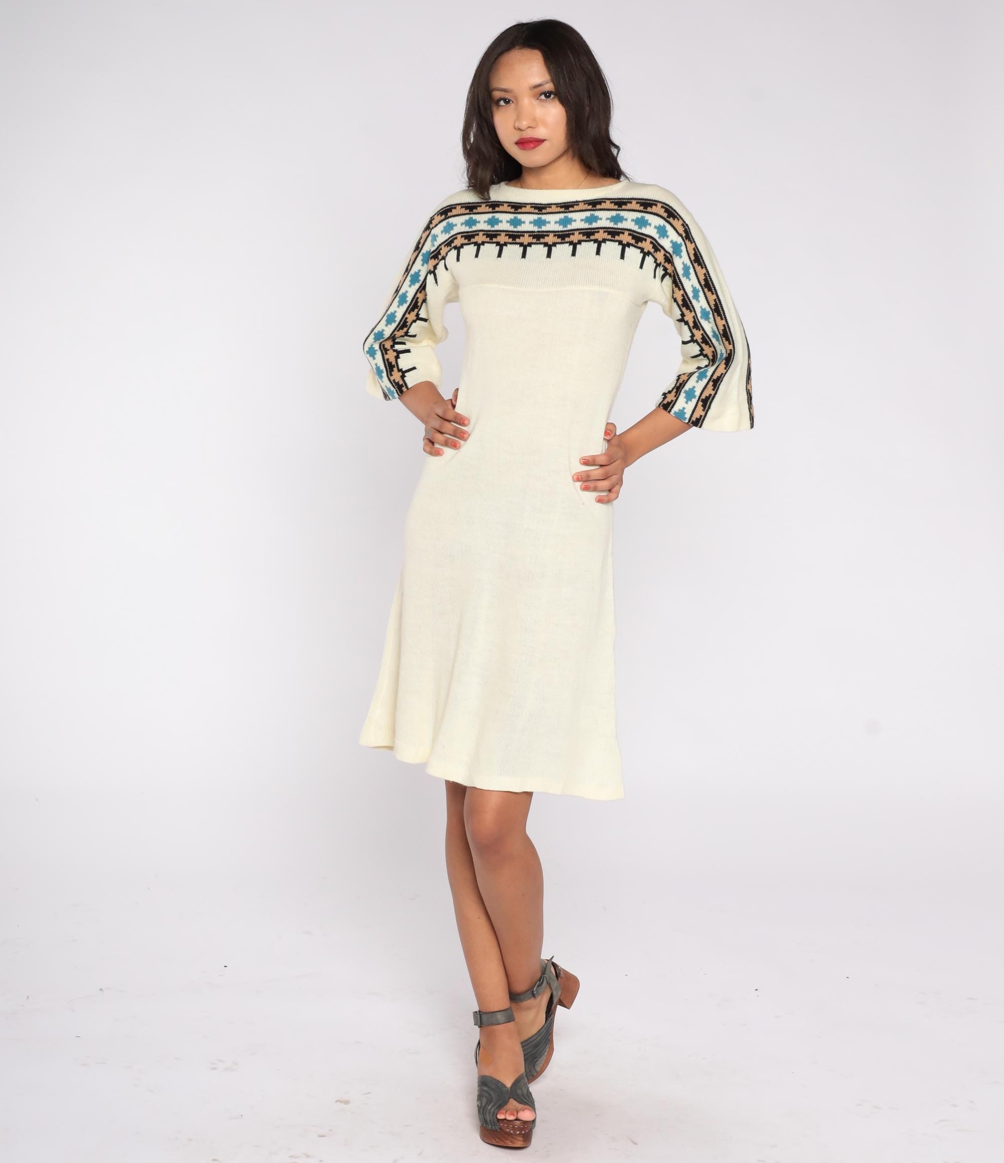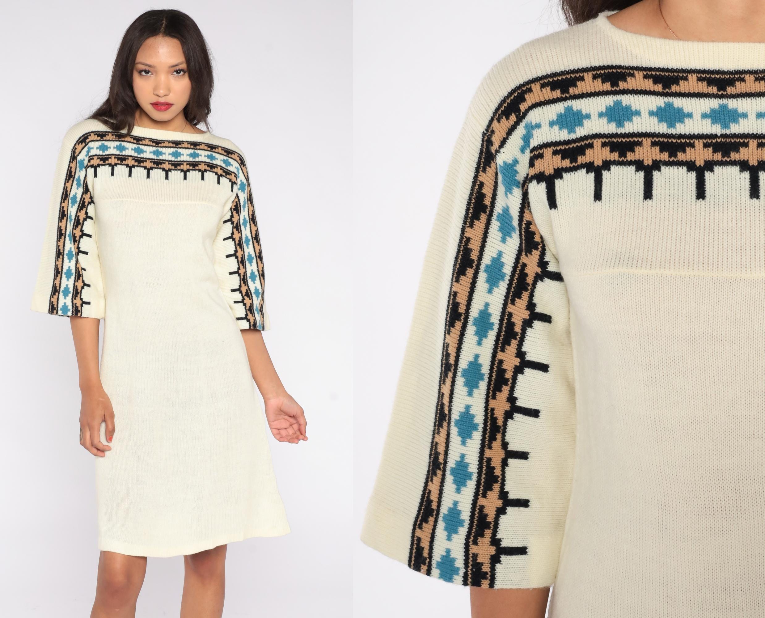 1970s cream knit sweater dress featuring a geometric patterned yoke in black, tan, and teal. The dress has flared three-quarter sleeves, a pullover fit, and a softly draped midi length.