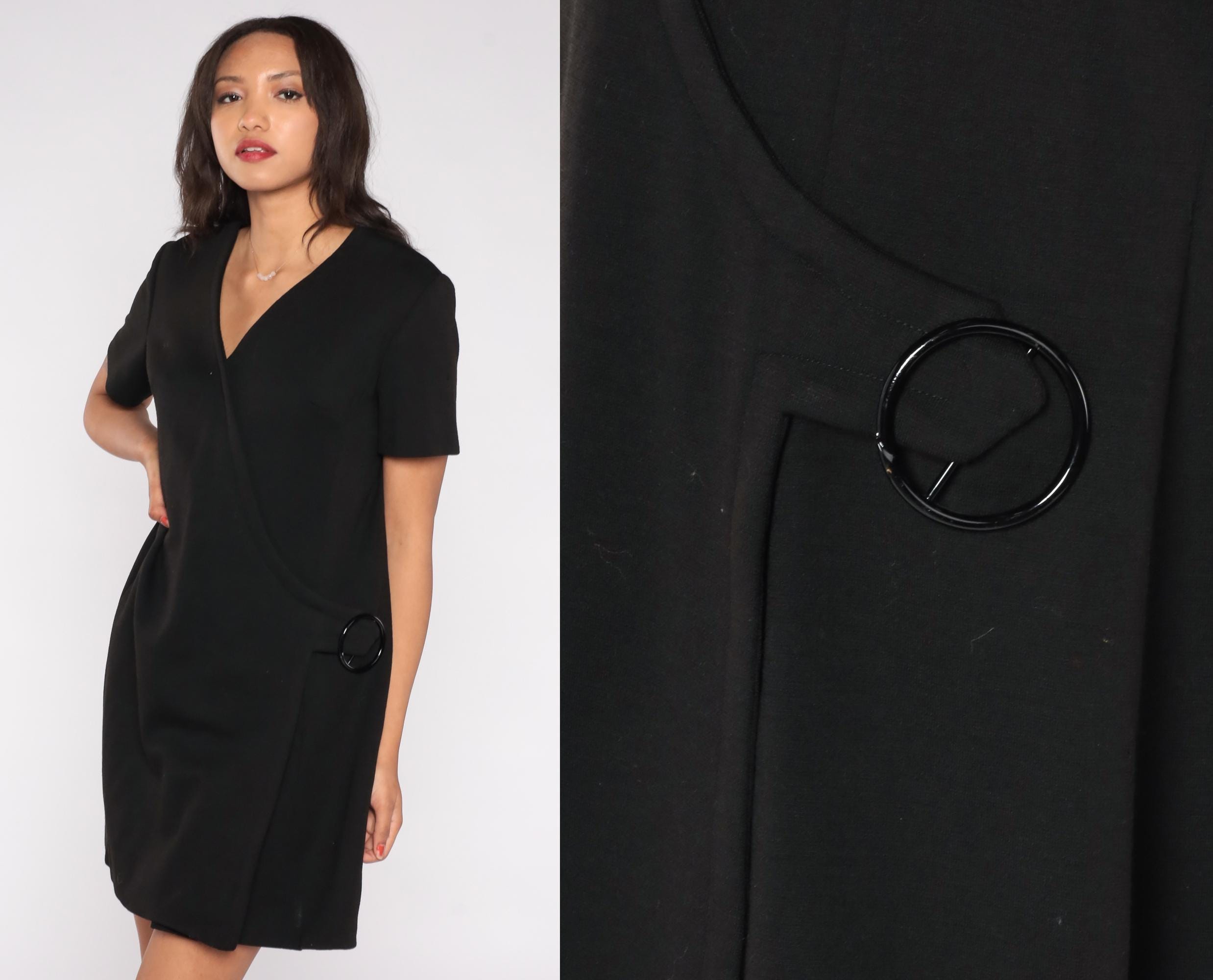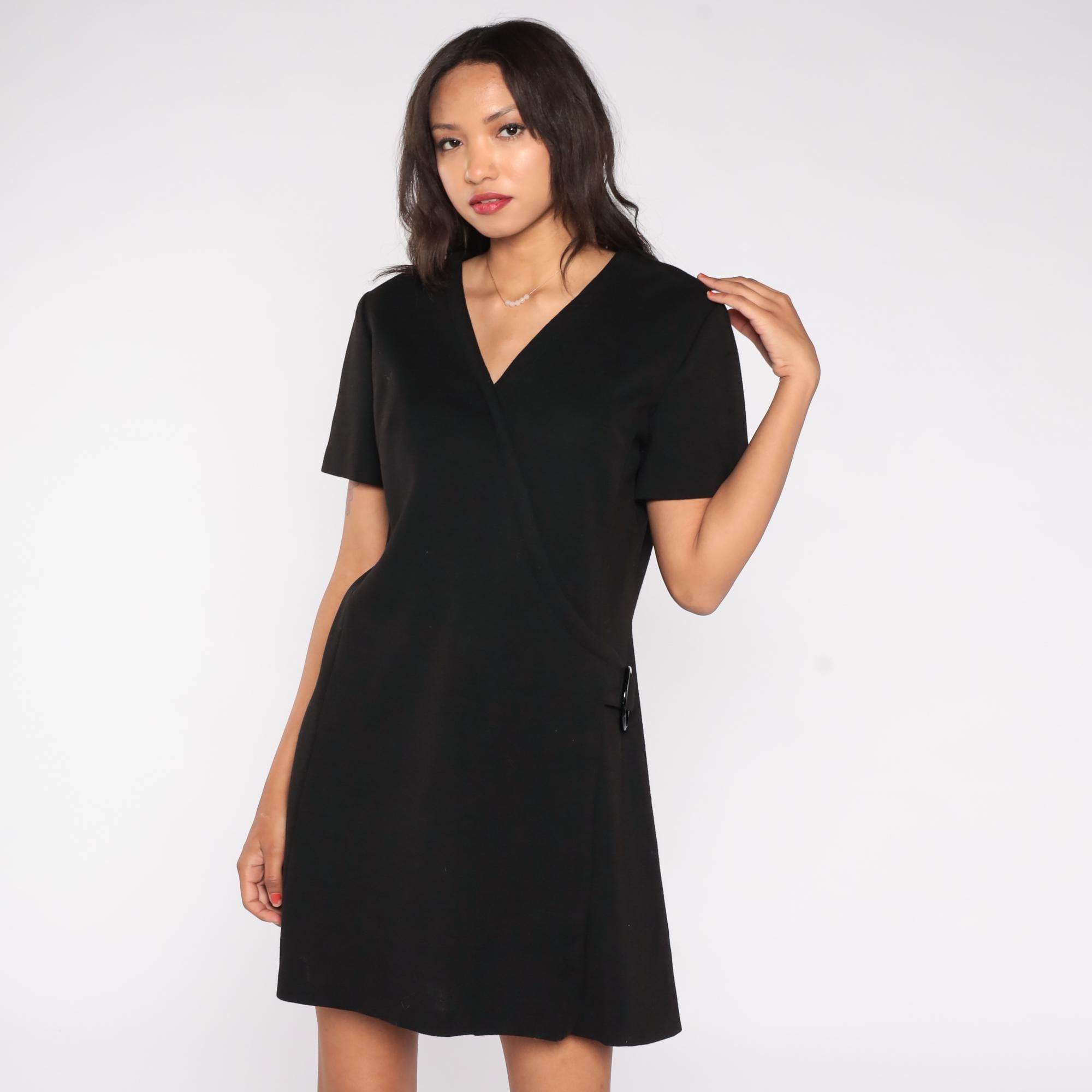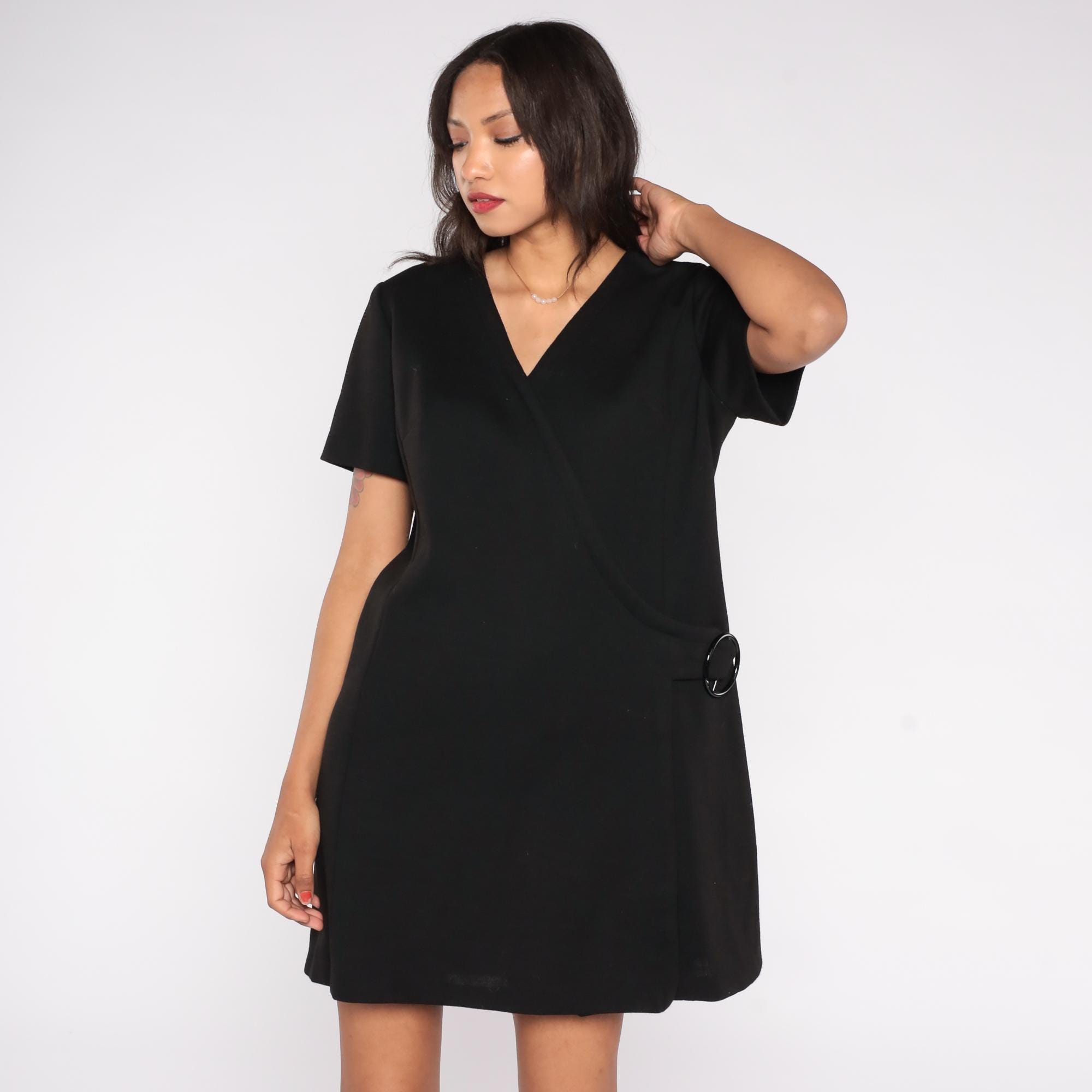 1960s black wool shift dress with a clean minimalist wrap-style front. Features a short sleeve design, V-neckline, and side belt with a circular black buckle detail. Constructed from pure wool fabric with a structured yet fluid drape. Finished with a back zipper closure and mid-thigh length hem.