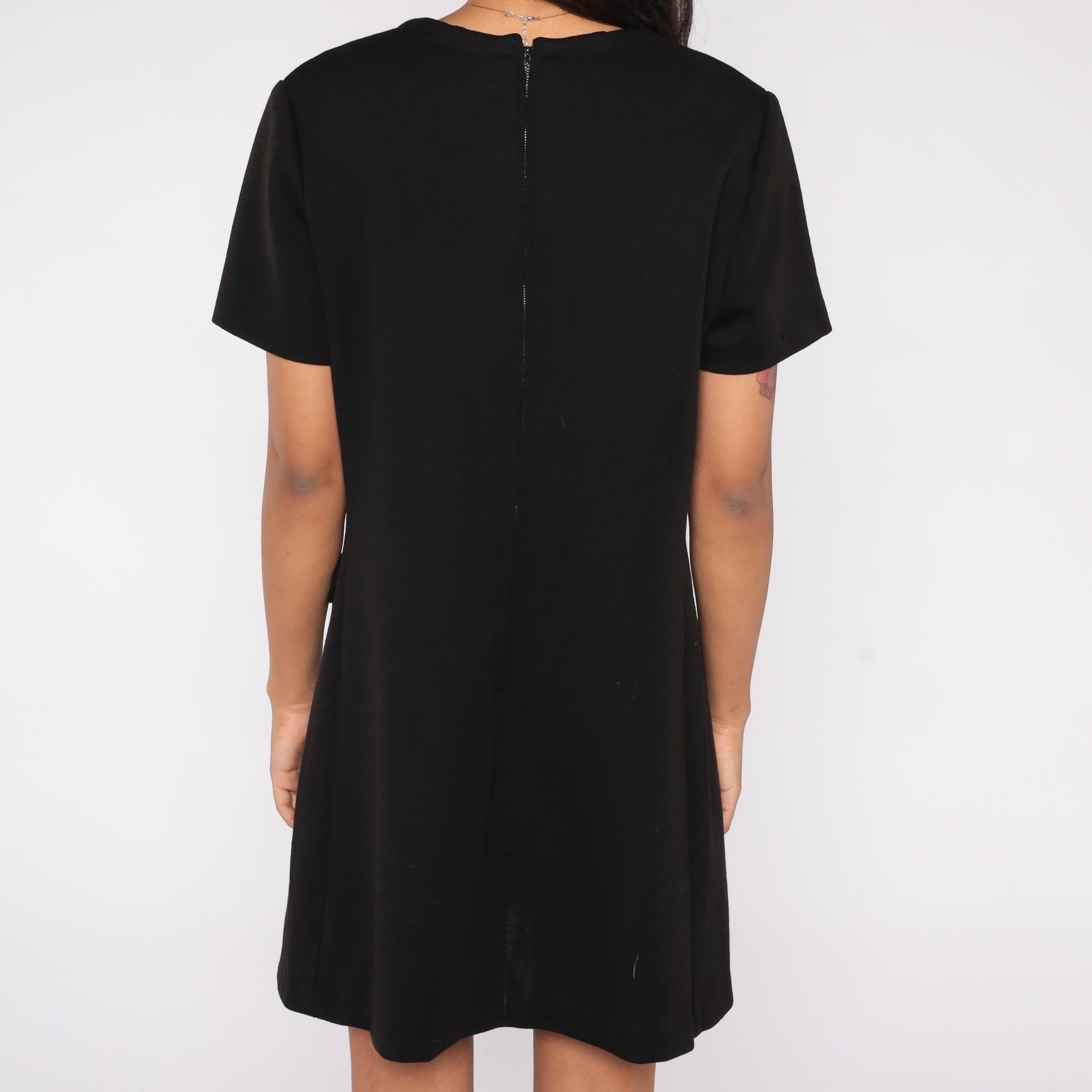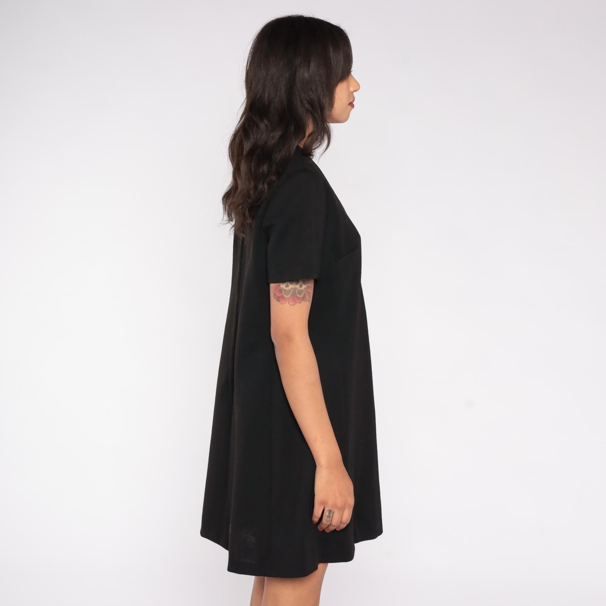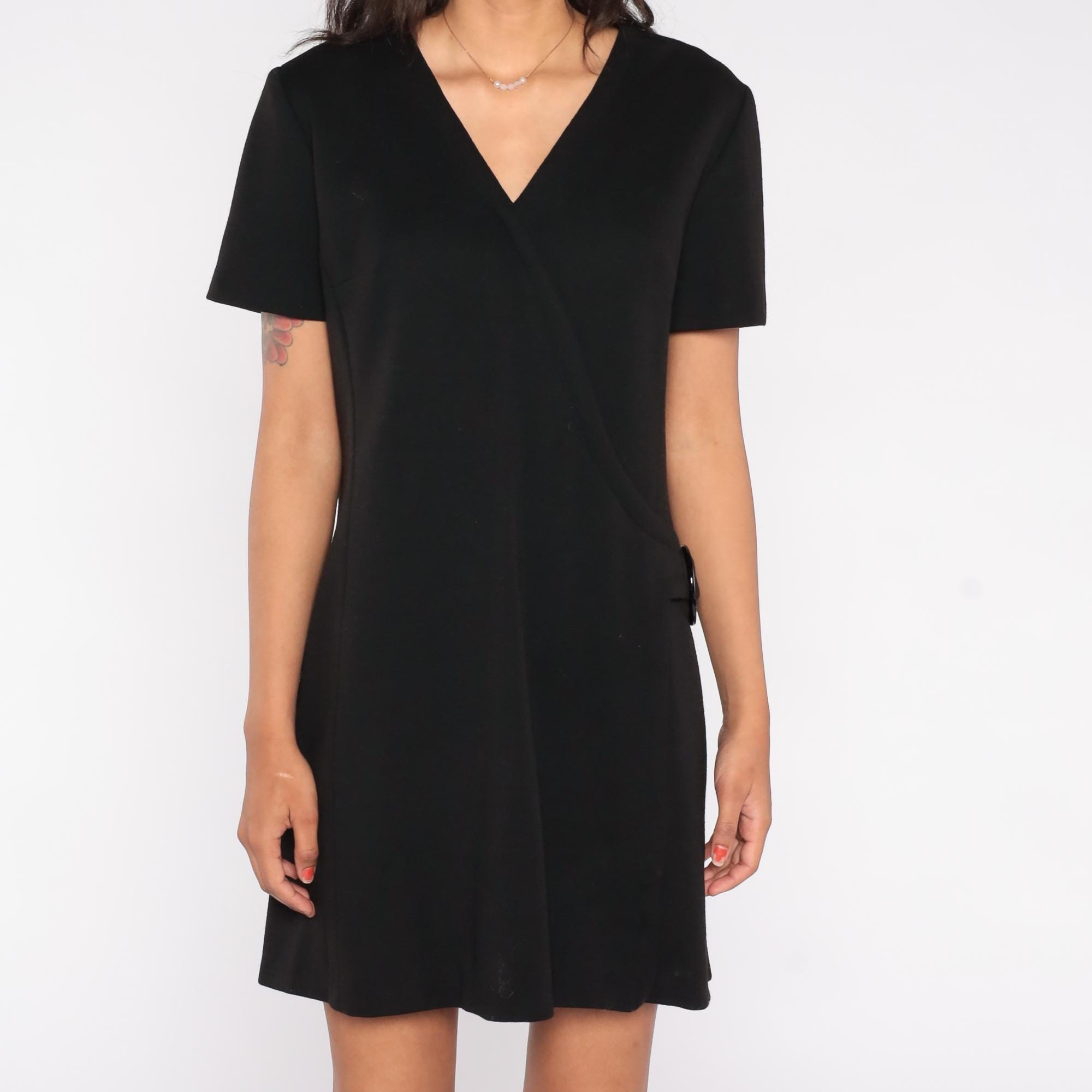 1960s black wool shift dress with a clean minimalist wrap-style front. Features a short sleeve design, V-neckline, and side belt with a circular black buckle detail. Constructed from pure wool fabric with a structured yet fluid drape. Finished with a back zipper closure and mid-thigh length hem.
