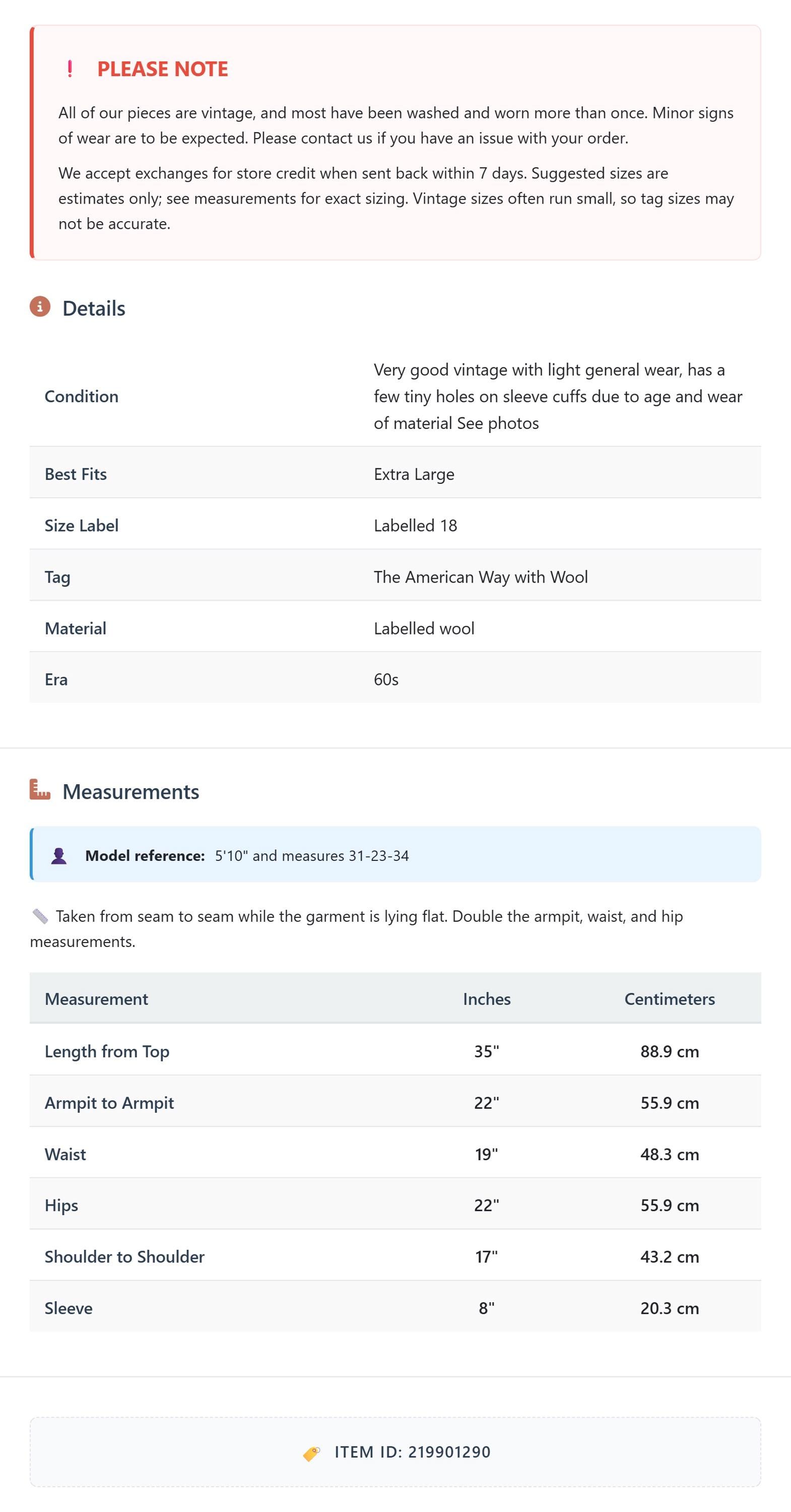 Condition: Very good vintage with light general wear, has a few tiny holes on sleeve cuffs due to age and wear of material See photos