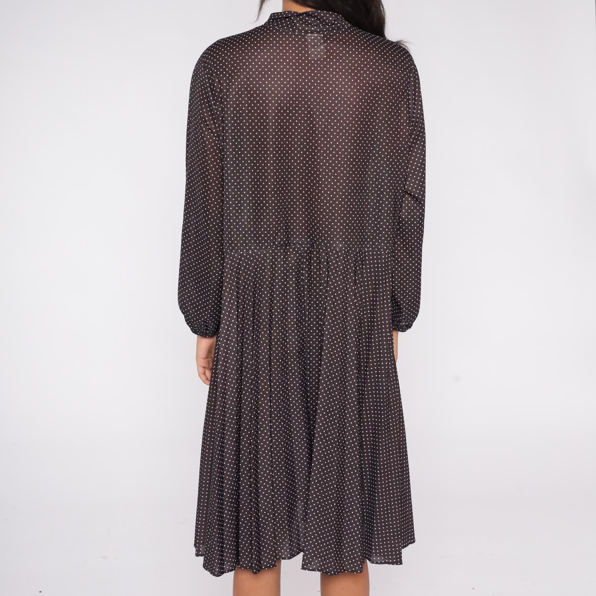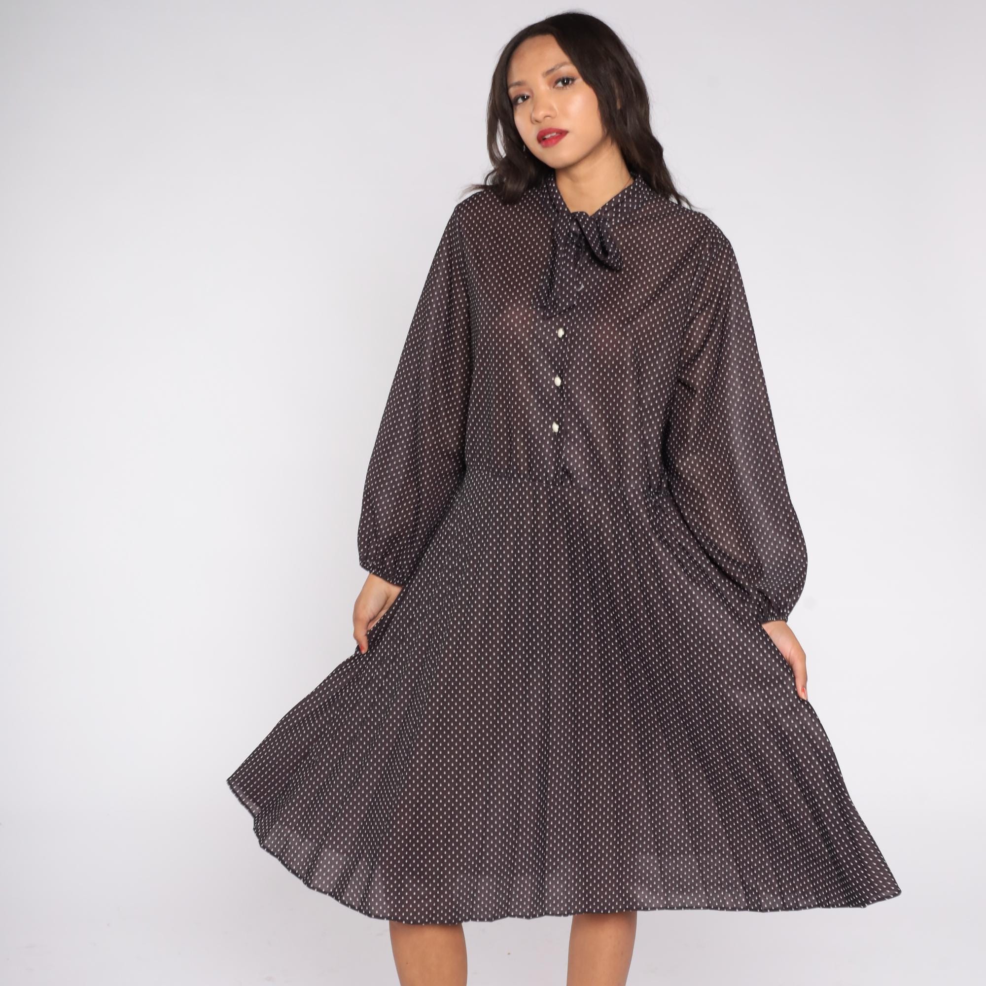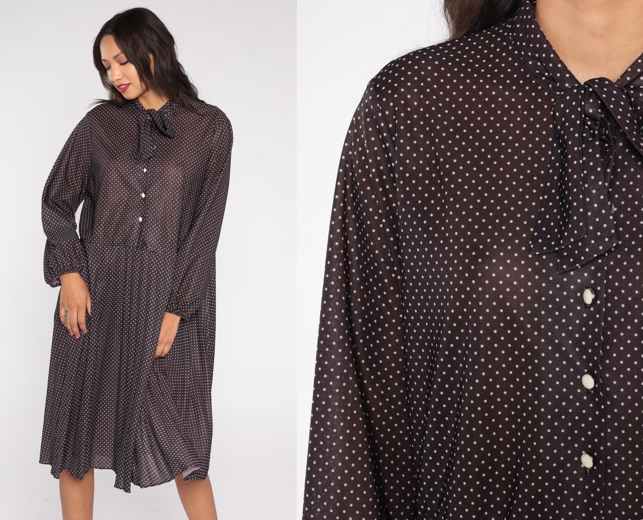 1970s brown polka dot midi dress featuring a classic pussy bow neckline and long sleeves with button cuffs. The dress has a partial button front closure and softly pleated skirt for an easy drape.