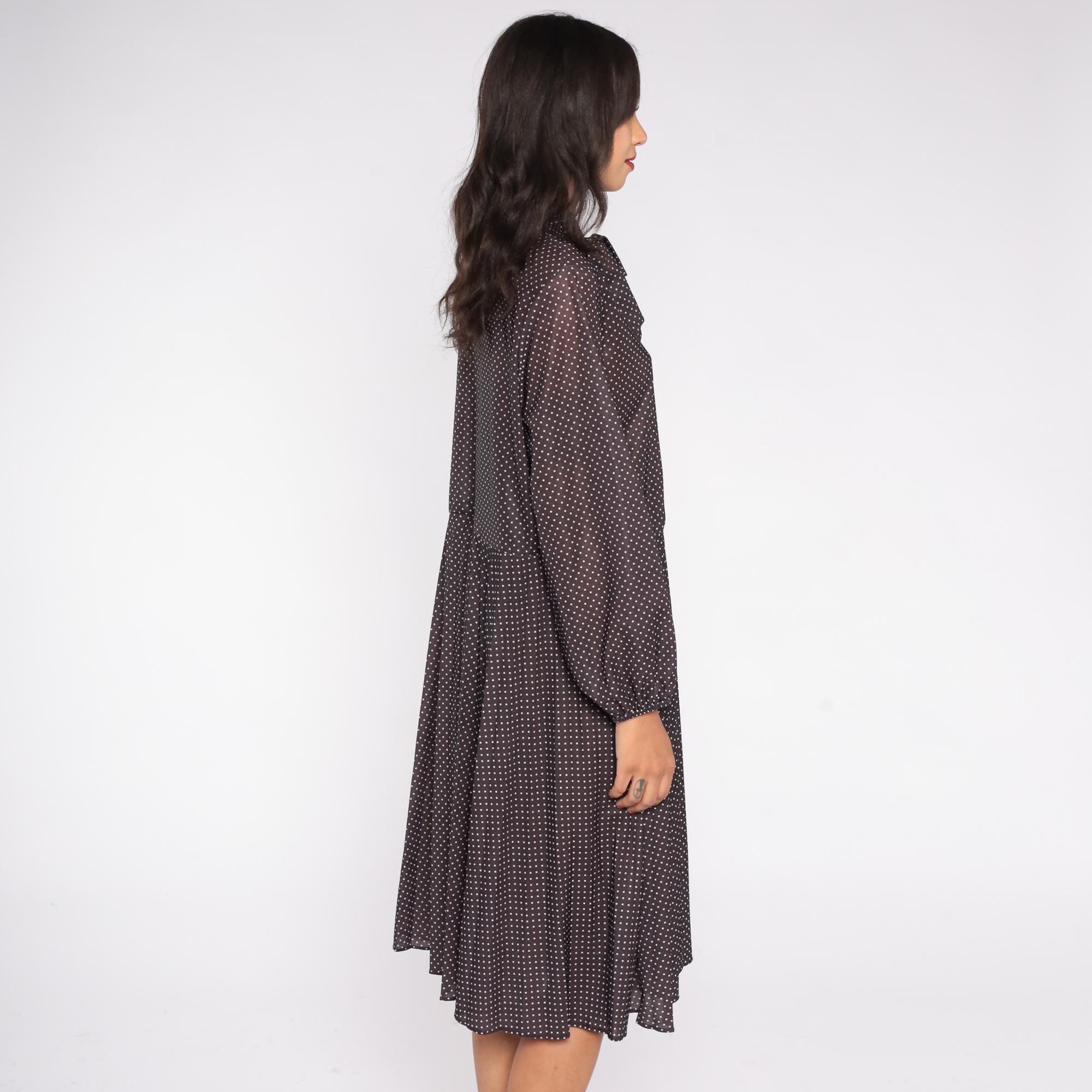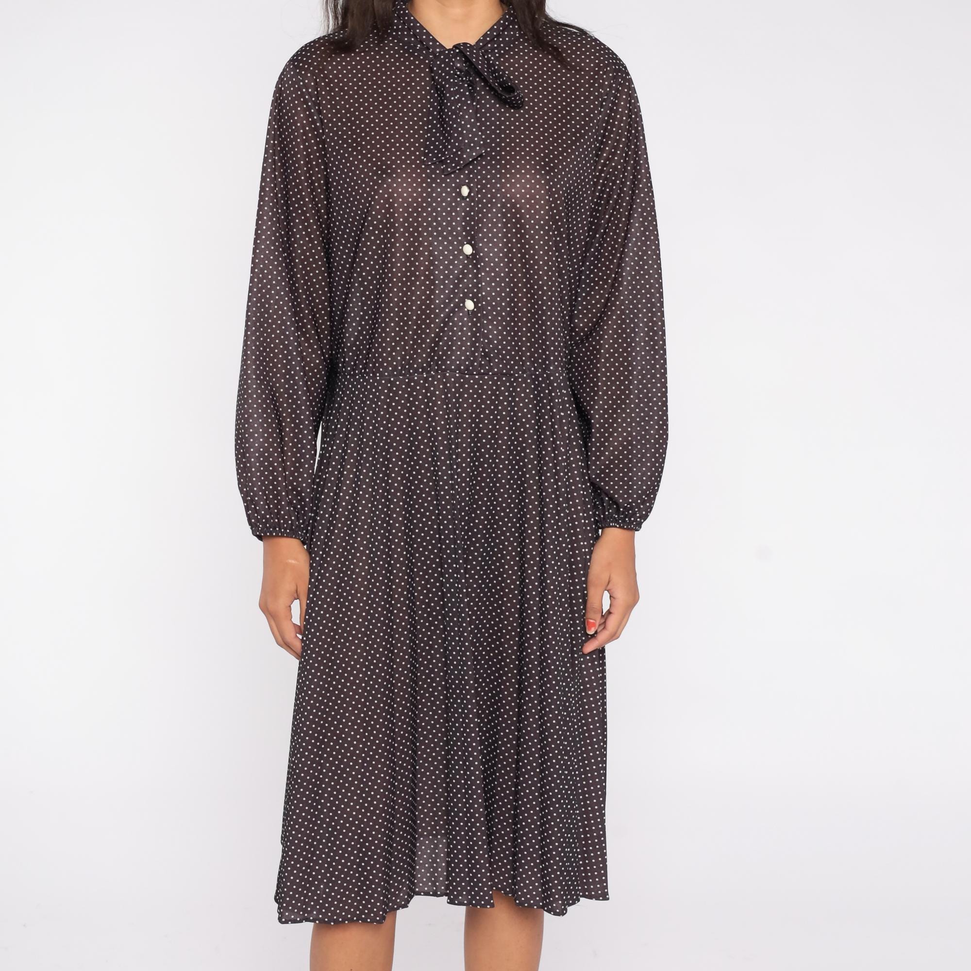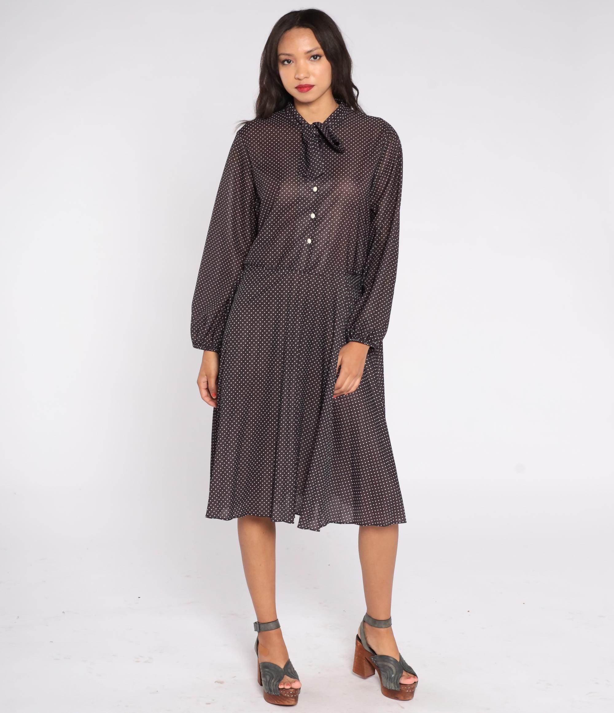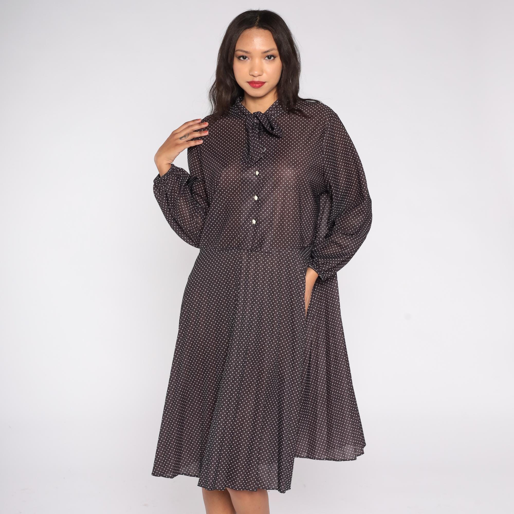 1970s brown polka dot midi dress featuring a classic pussy bow neckline and long sleeves with button cuffs. The dress has a partial button front closure and softly pleated skirt for an easy drape.