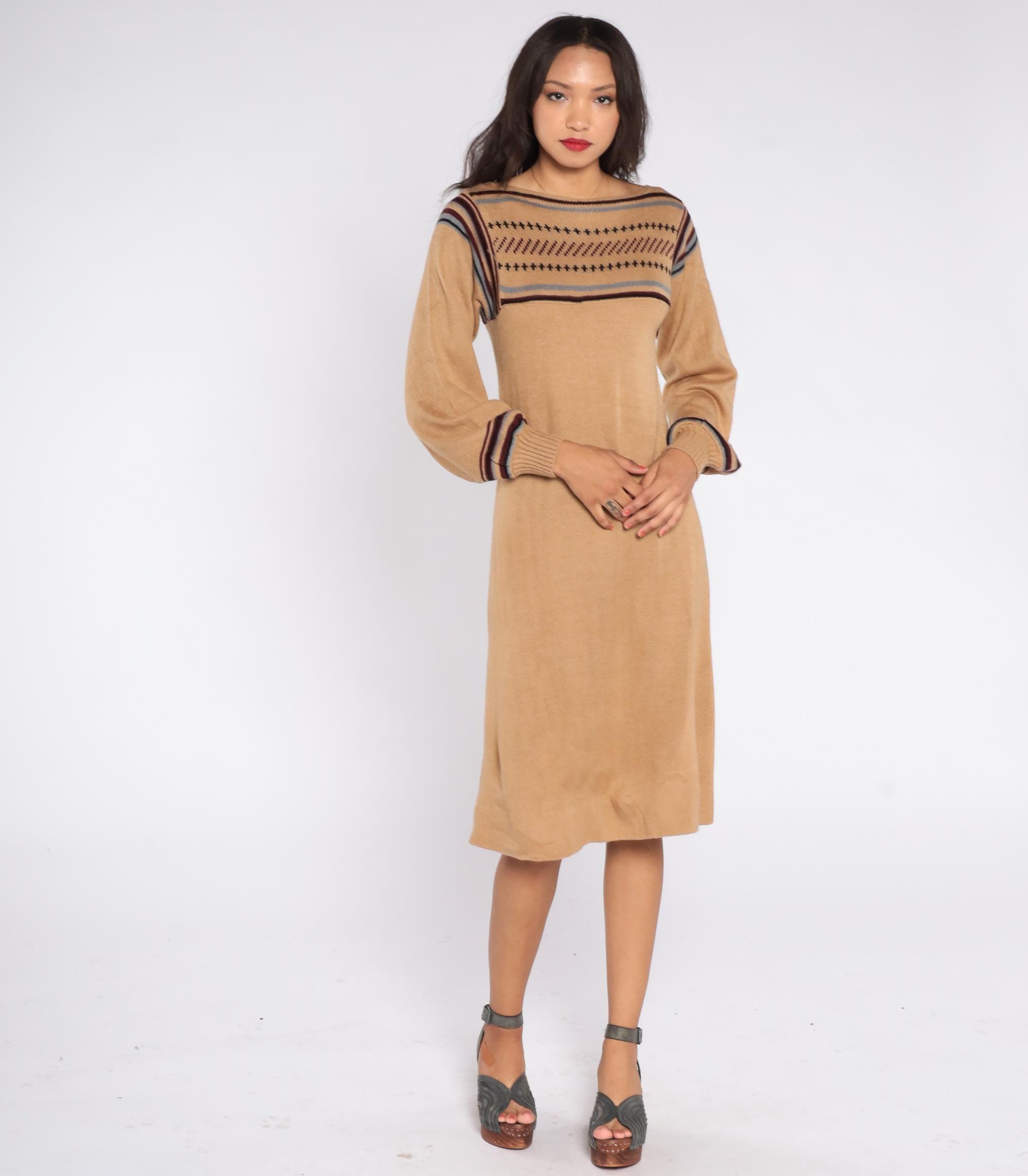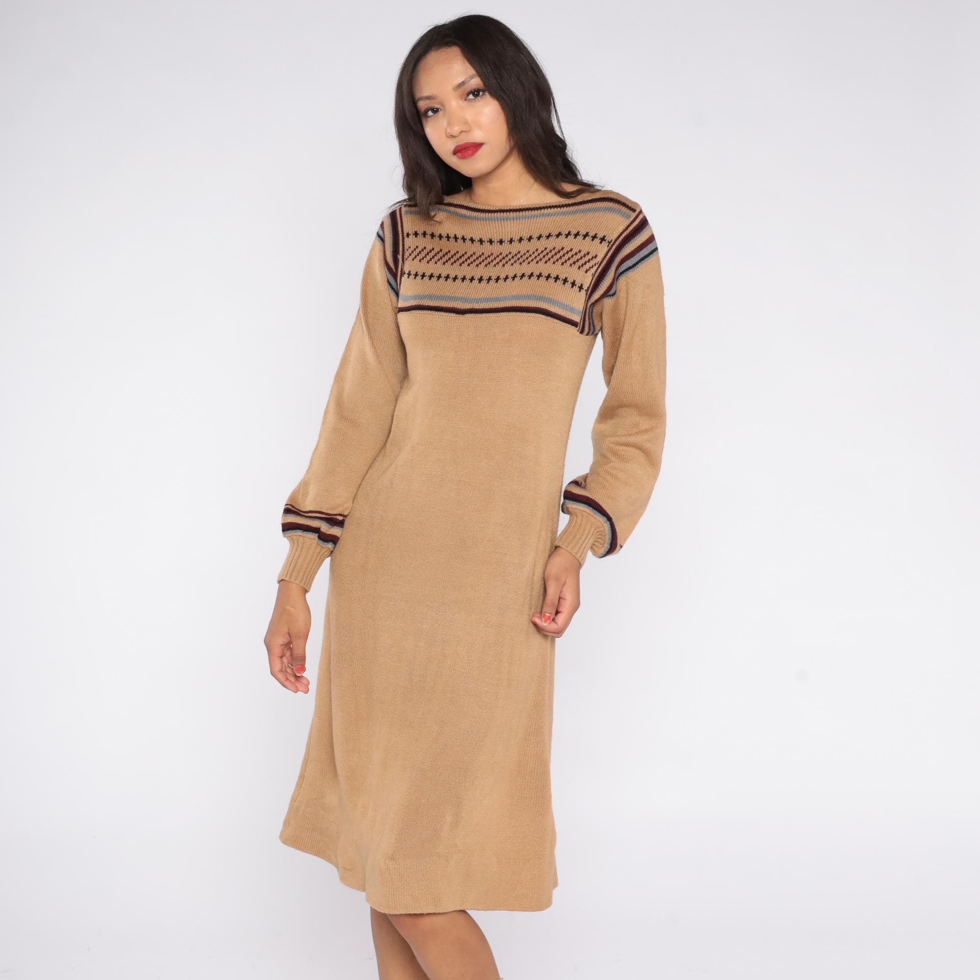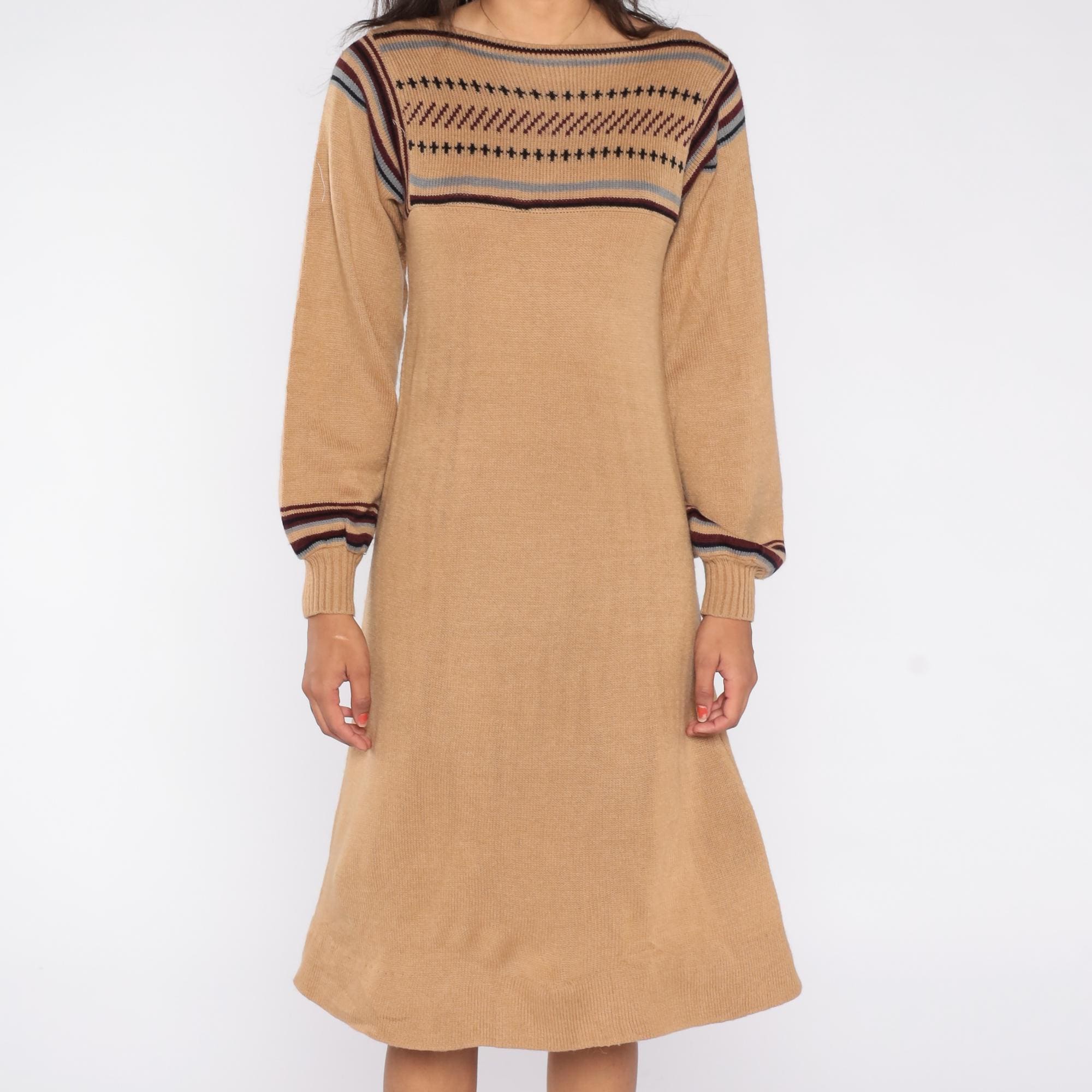 1970s tan knit sweater dress featuring a Fair Isle patterned yoke with maroon, black, and gray striping. Designed with balloon sleeves, ribbed cuffs, and a soft pullover fit that falls to a midi length.