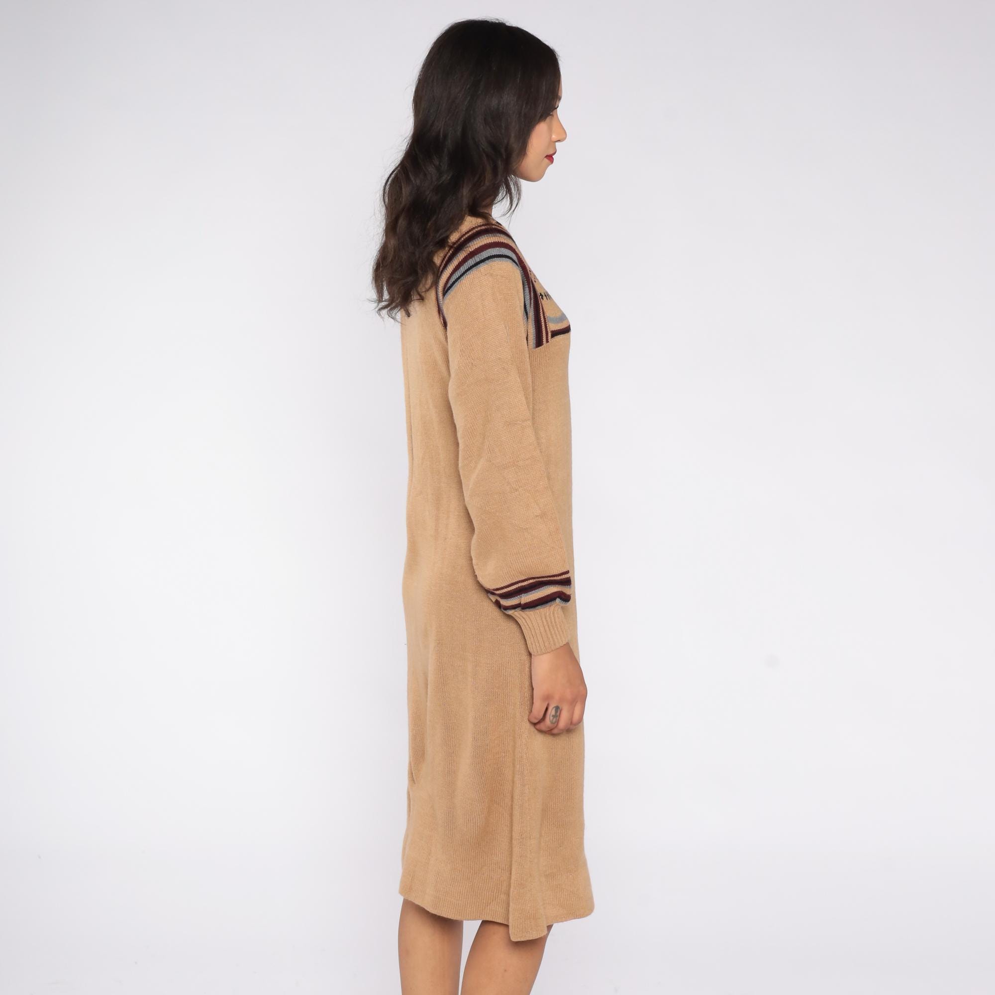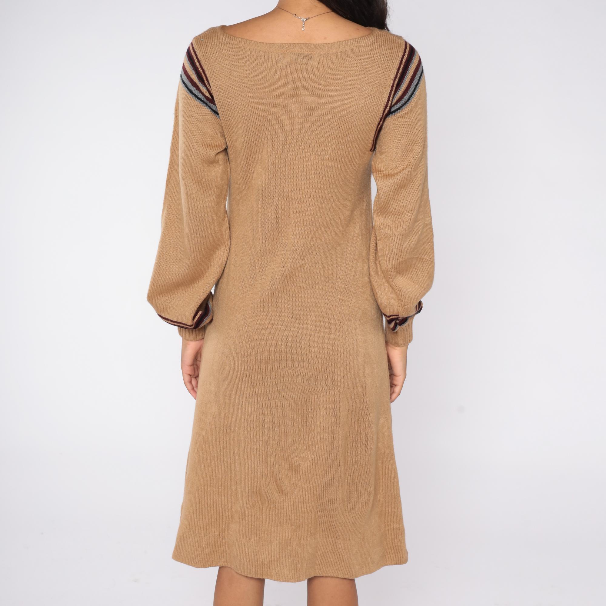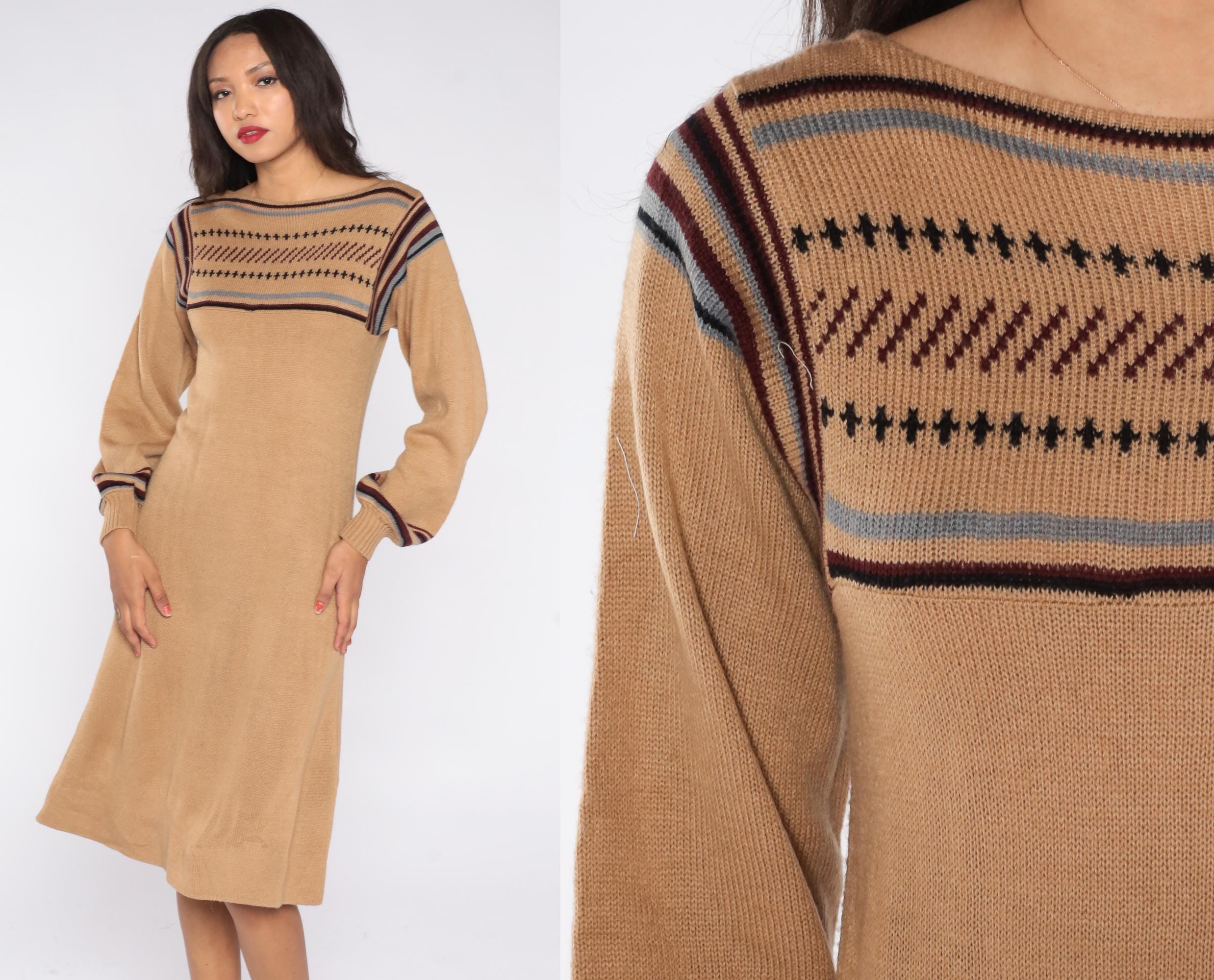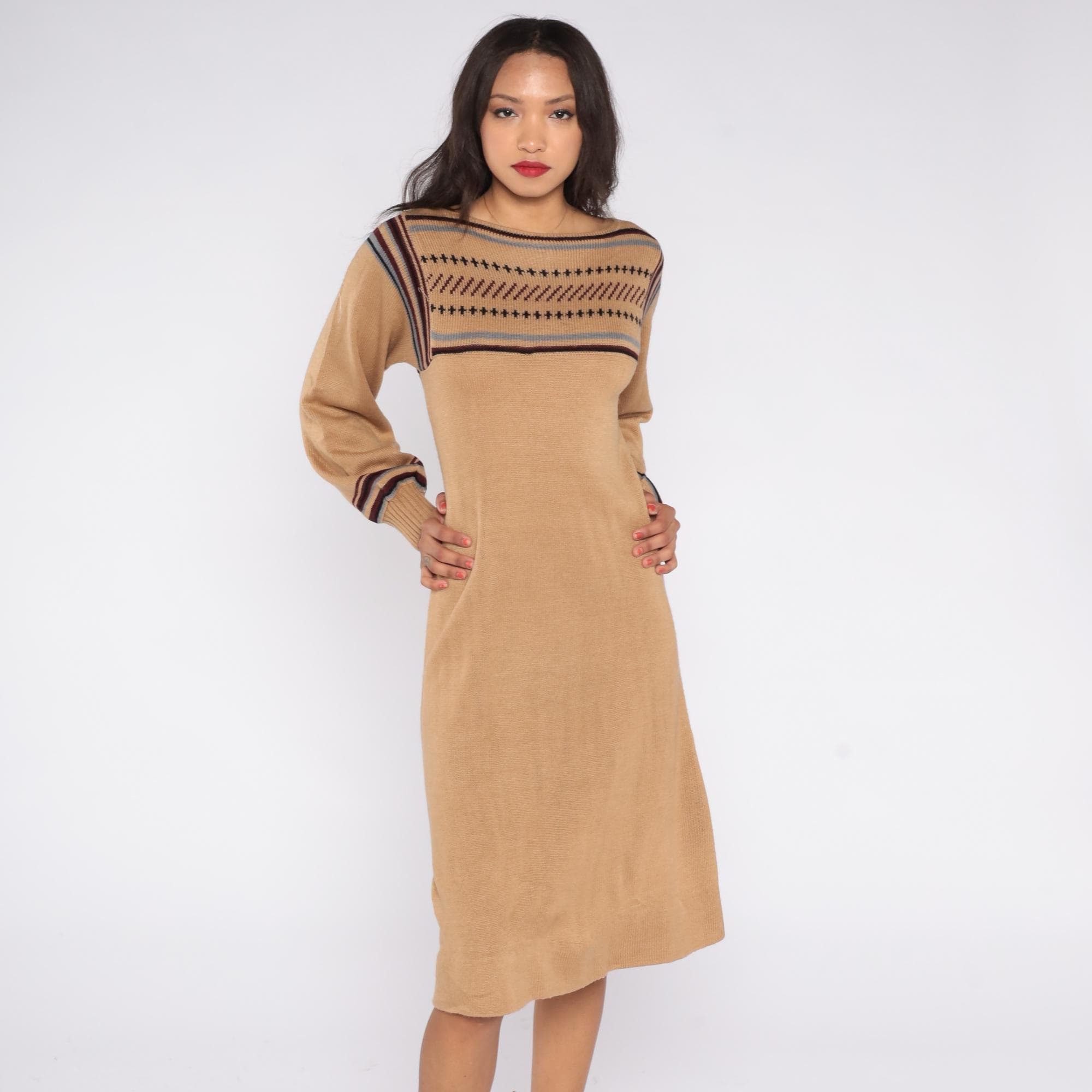1970s tan knit sweater dress featuring a Fair Isle patterned yoke with maroon, black, and gray striping. Designed with balloon sleeves, ribbed cuffs, and a soft pullover fit that falls to a midi length.