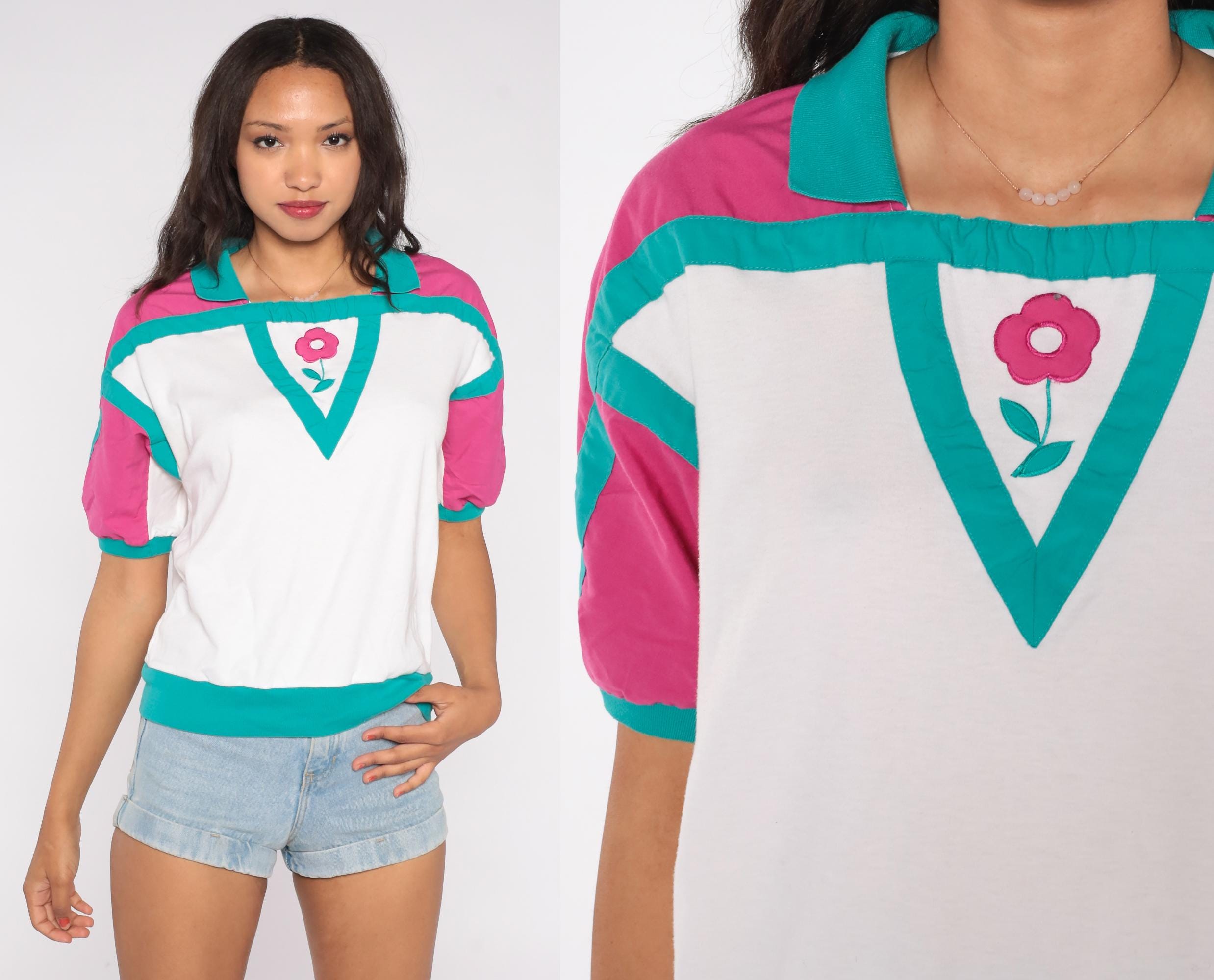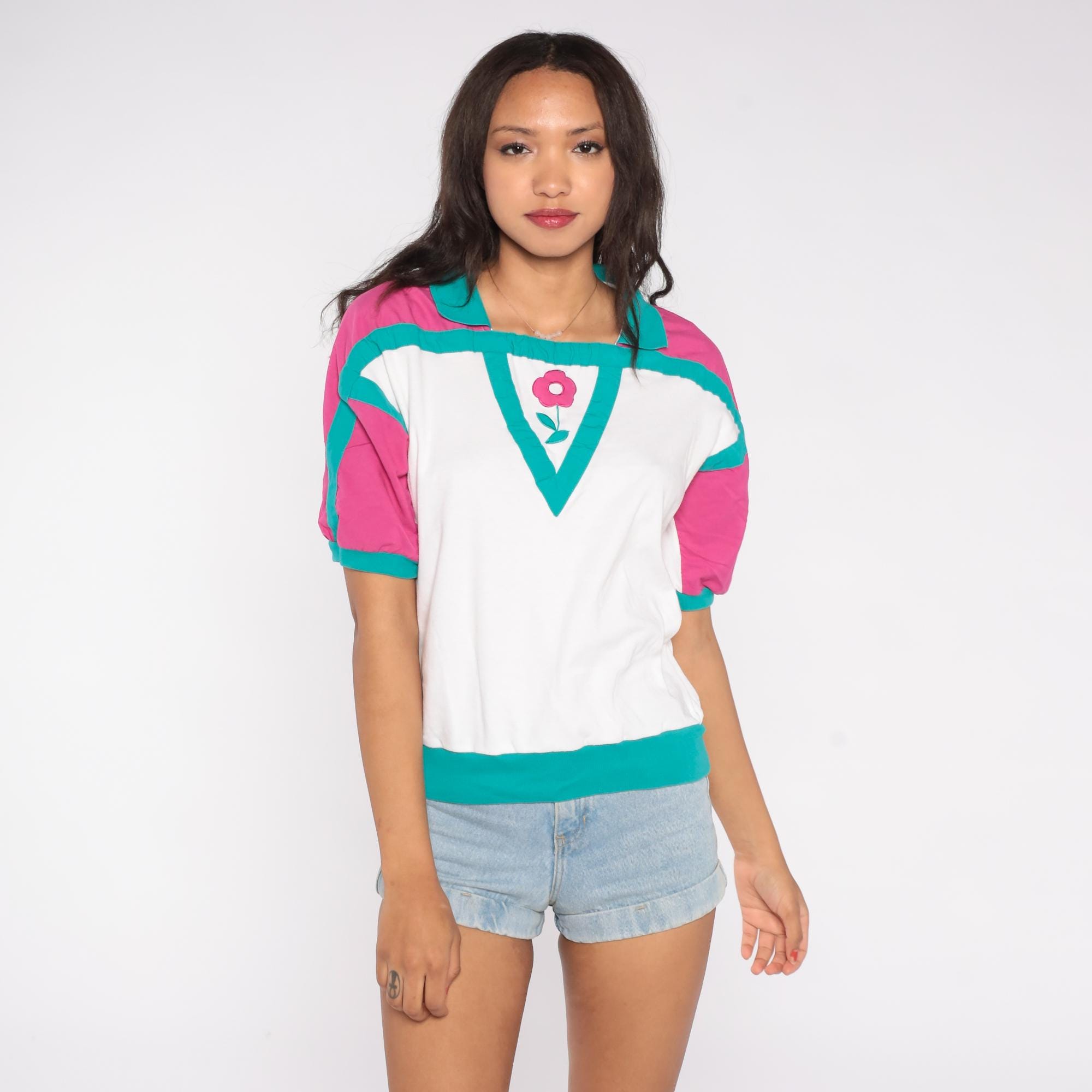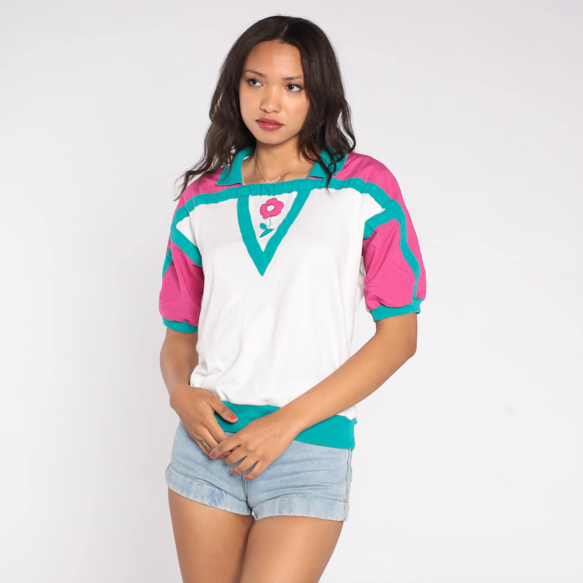 80s top from Pykettes showcases the bold color blocking that defined the era's aesthetic. The vibrant hot pink sleeves and collar contrast beautifully with white body and jade teal trim. The standout feature is the sweet pink flower appliqué centered in a teal triangular panel on the front - a charming feminine detail that softens the athletic design. Features include a comfortable polo-style collar, short sleeves with teal cuffs, and a matching teal banded hem that creates a slightly blouson effect.