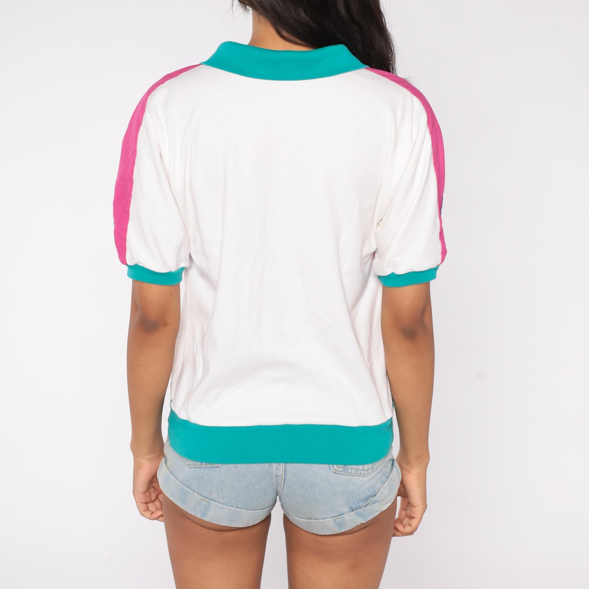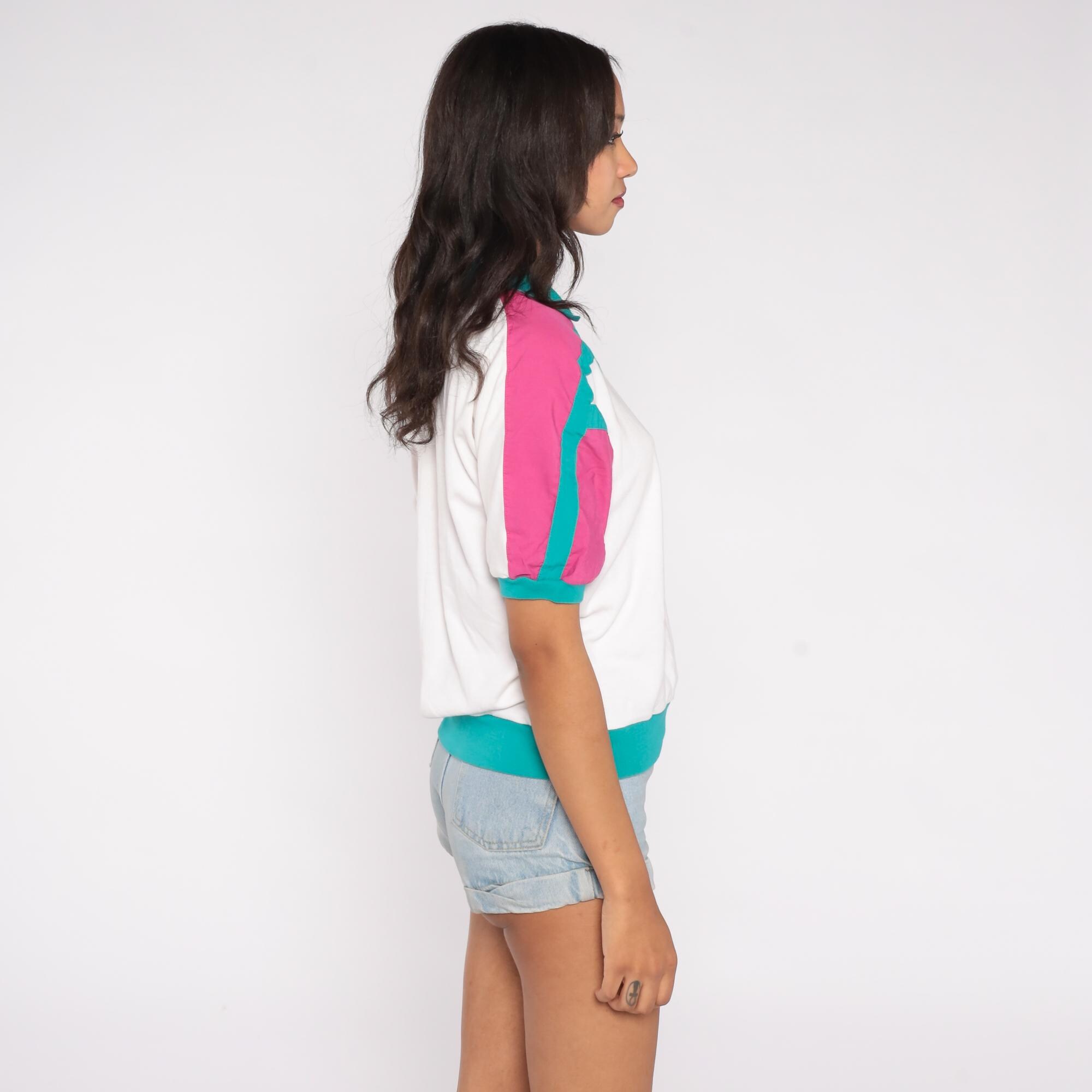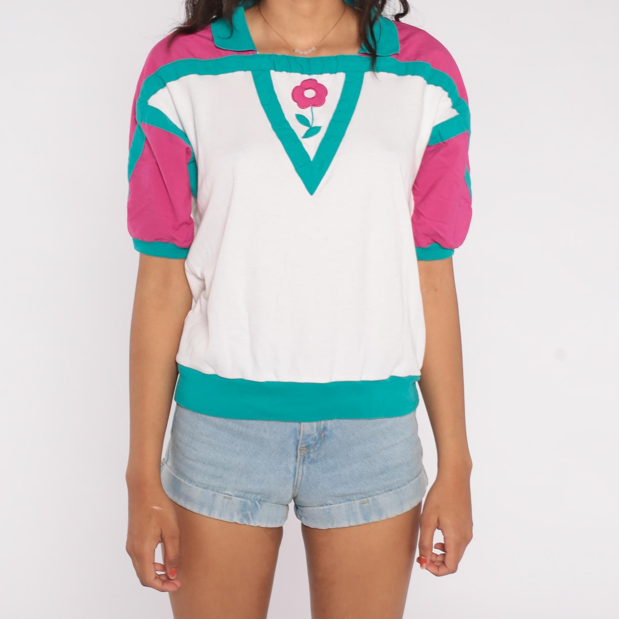 80s top from Pykettes showcases the bold color blocking that defined the era's aesthetic. The vibrant hot pink sleeves and collar contrast beautifully with white body and jade teal trim. The standout feature is the sweet pink flower appliqué centered in a teal triangular panel on the front - a charming feminine detail that softens the athletic design. Features include a comfortable polo-style collar, short sleeves with teal cuffs, and a matching teal banded hem that creates a slightly blouson effect.
