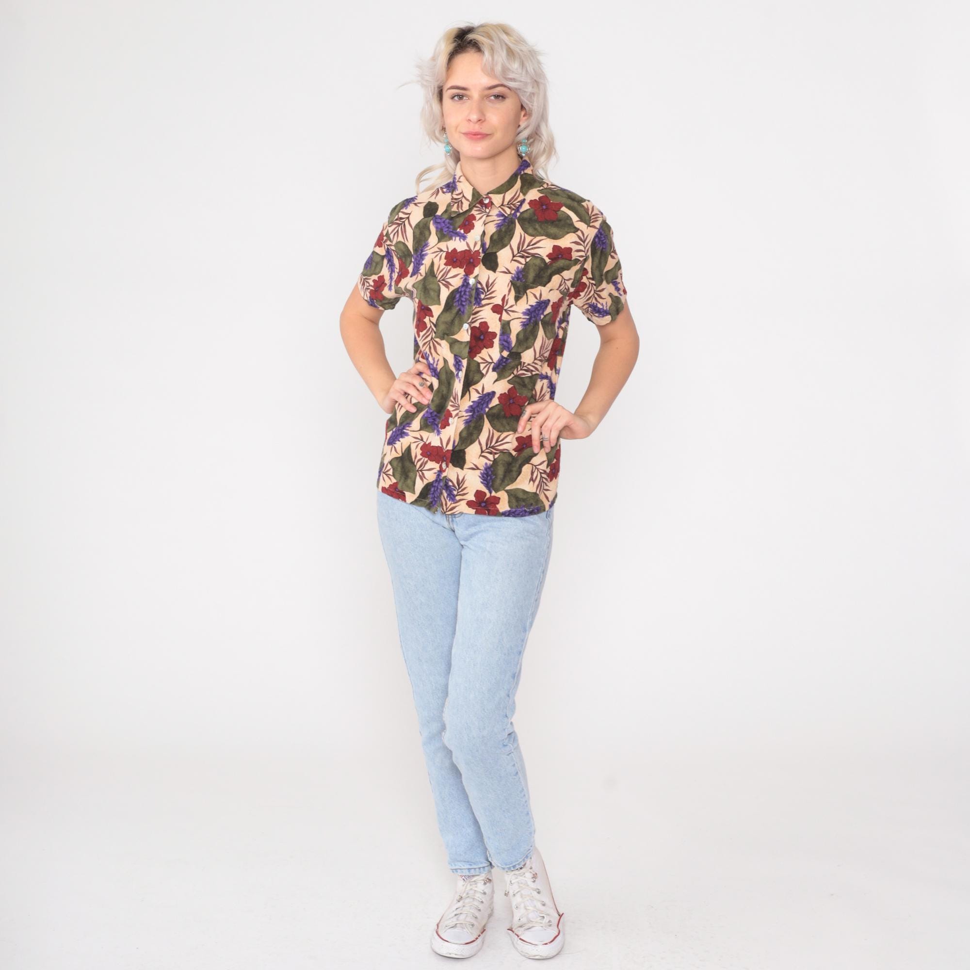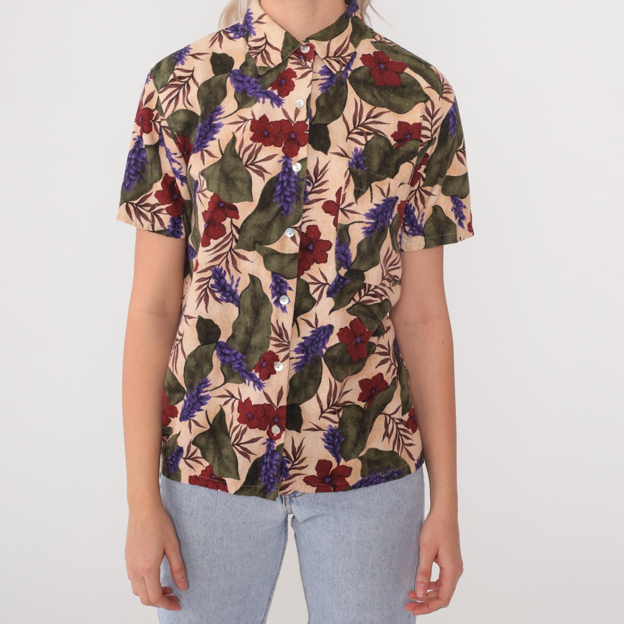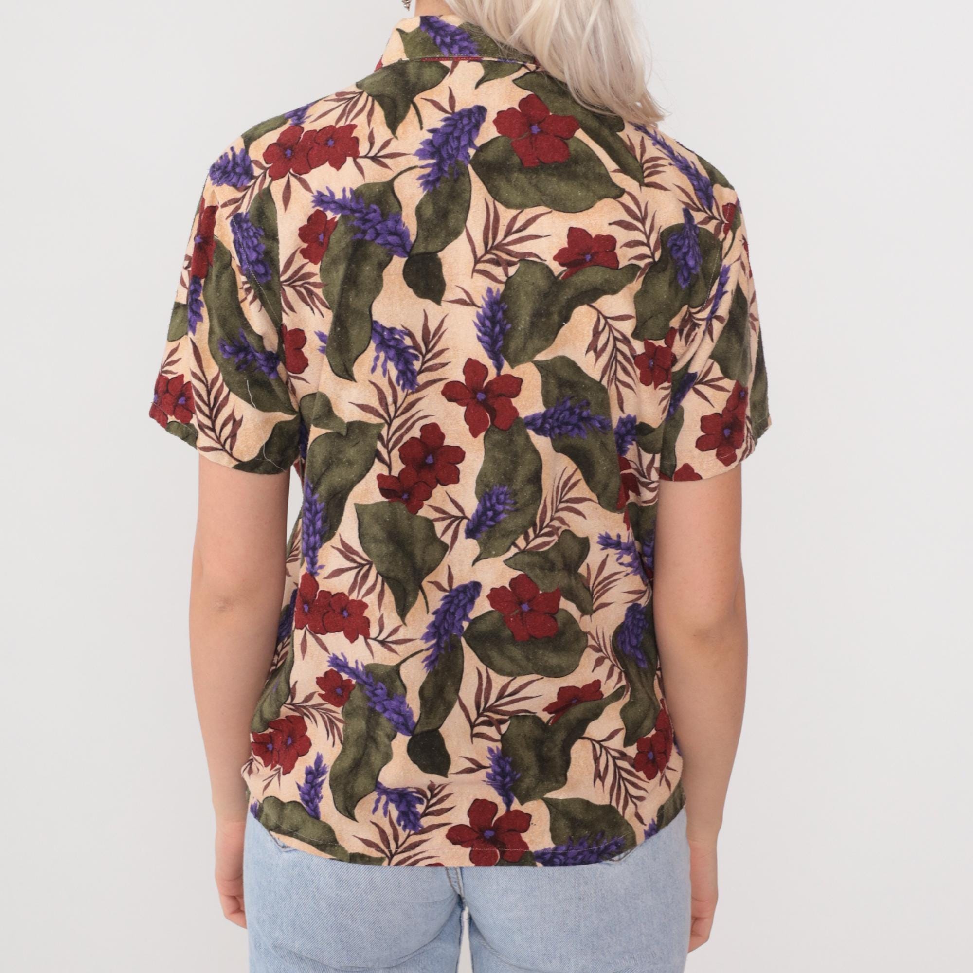 90s silk button-down shirt with a botanical floral print featuring red hibiscus flowers, purple lavender, and green leaves on a beige background. Features a classic collar, front button closure, and short sleeves.