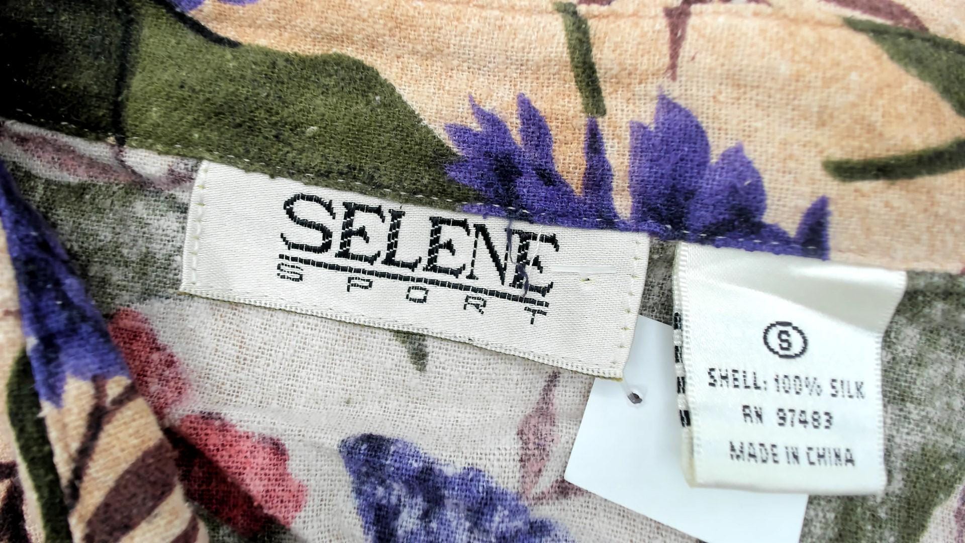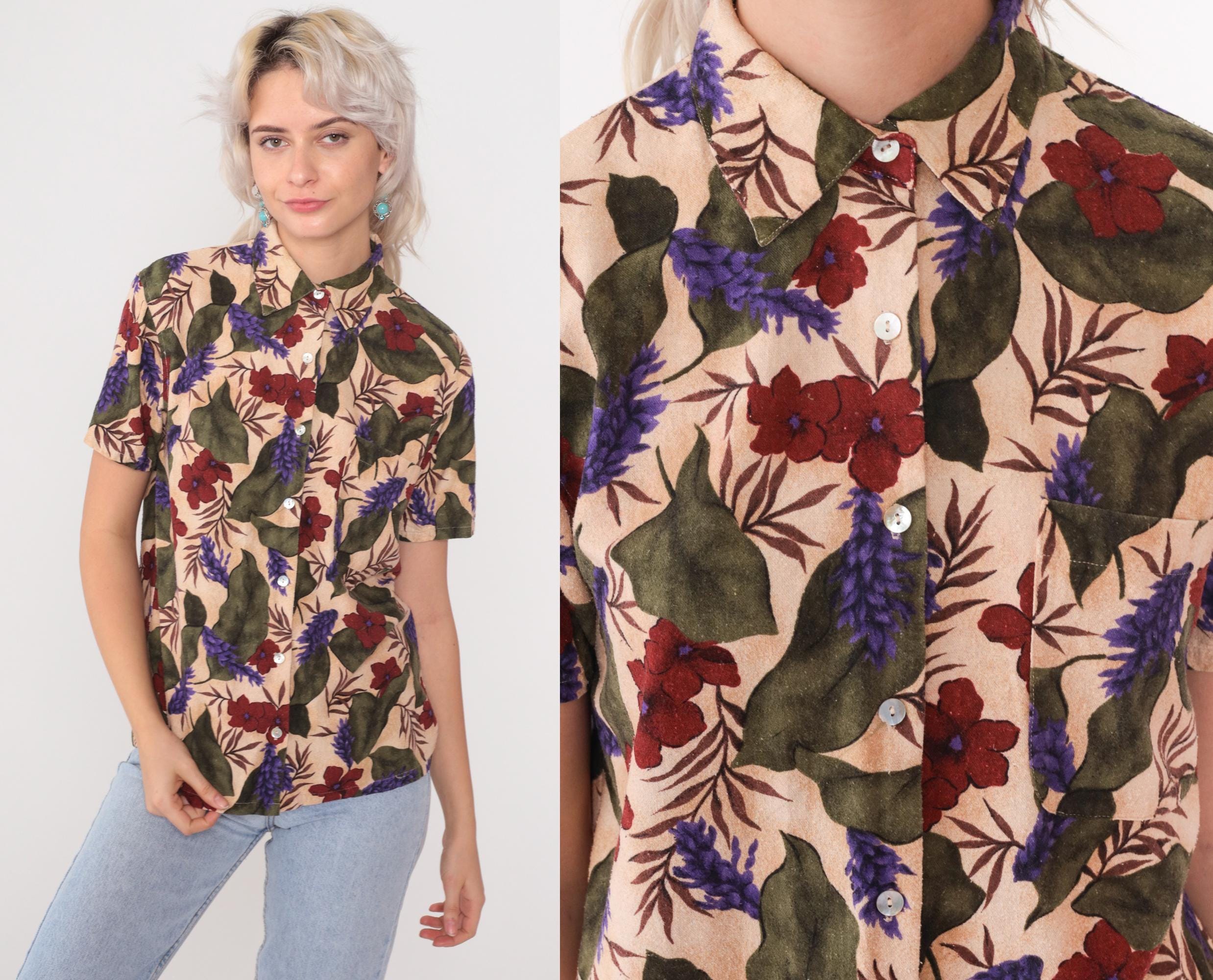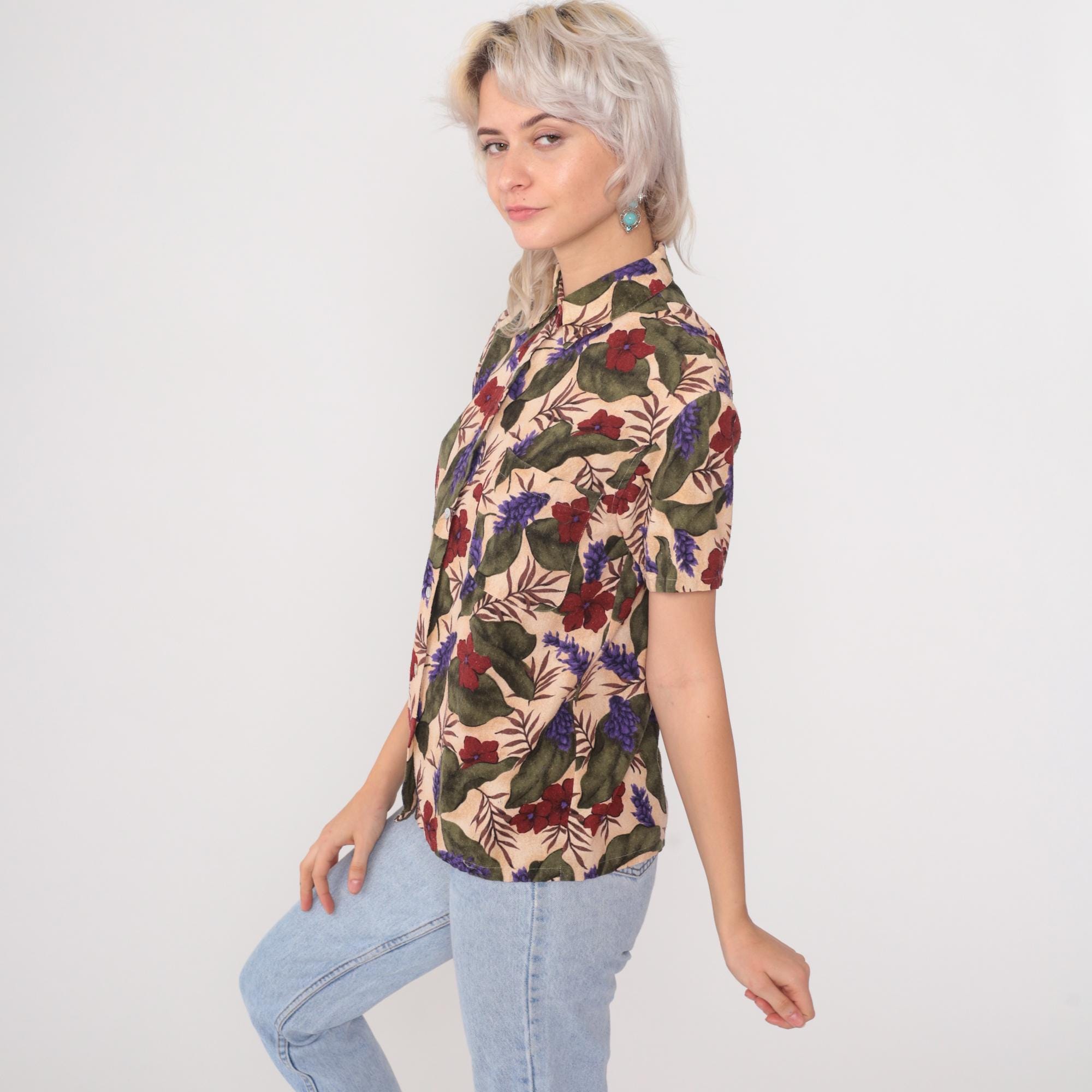 90s silk button-down shirt with a botanical floral print featuring red hibiscus flowers, purple lavender, and green leaves on a beige background. Features a classic collar, front button closure, and short sleeves.