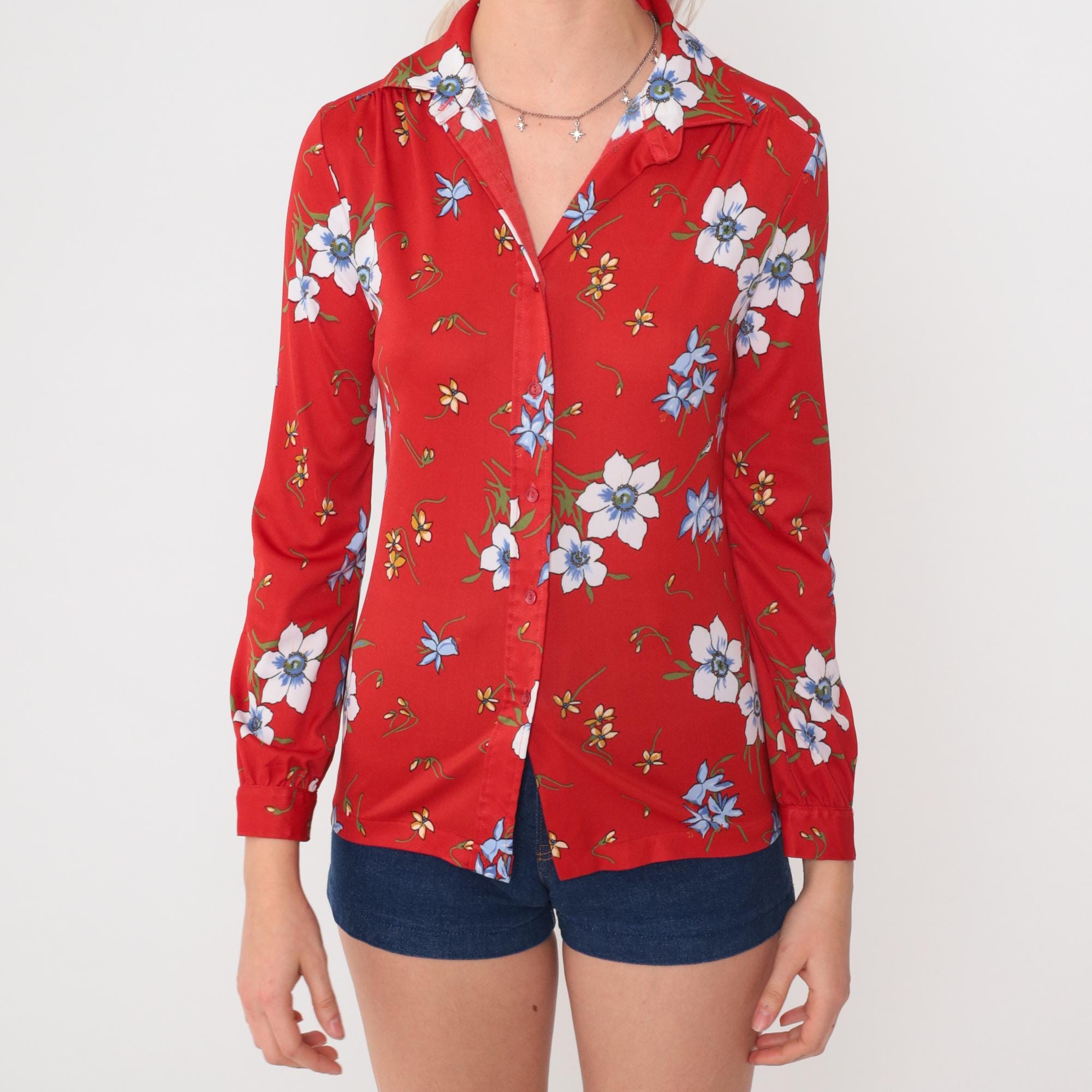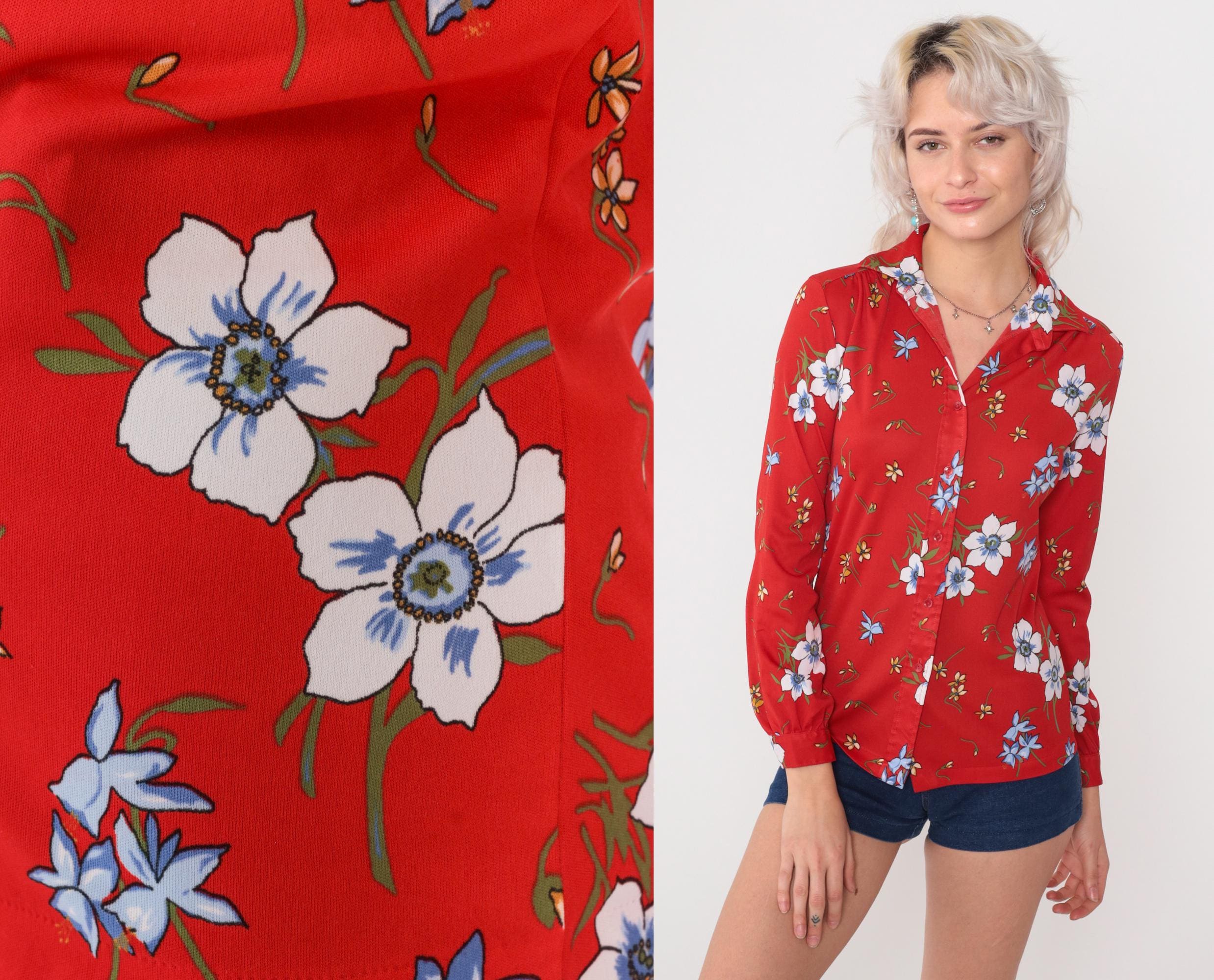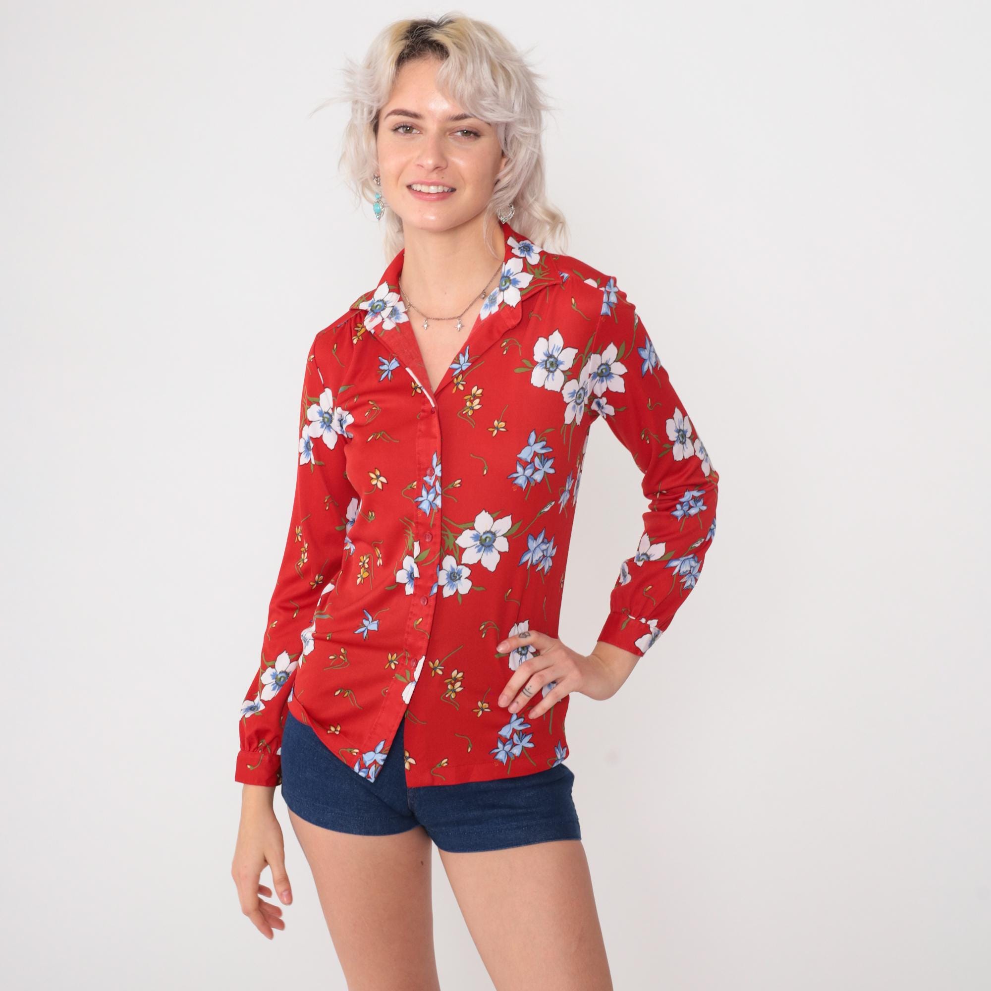 70s bright red polyester button-up blouse with white and blue floral print. Features a pointed collar, front button closure, and long sleeves.