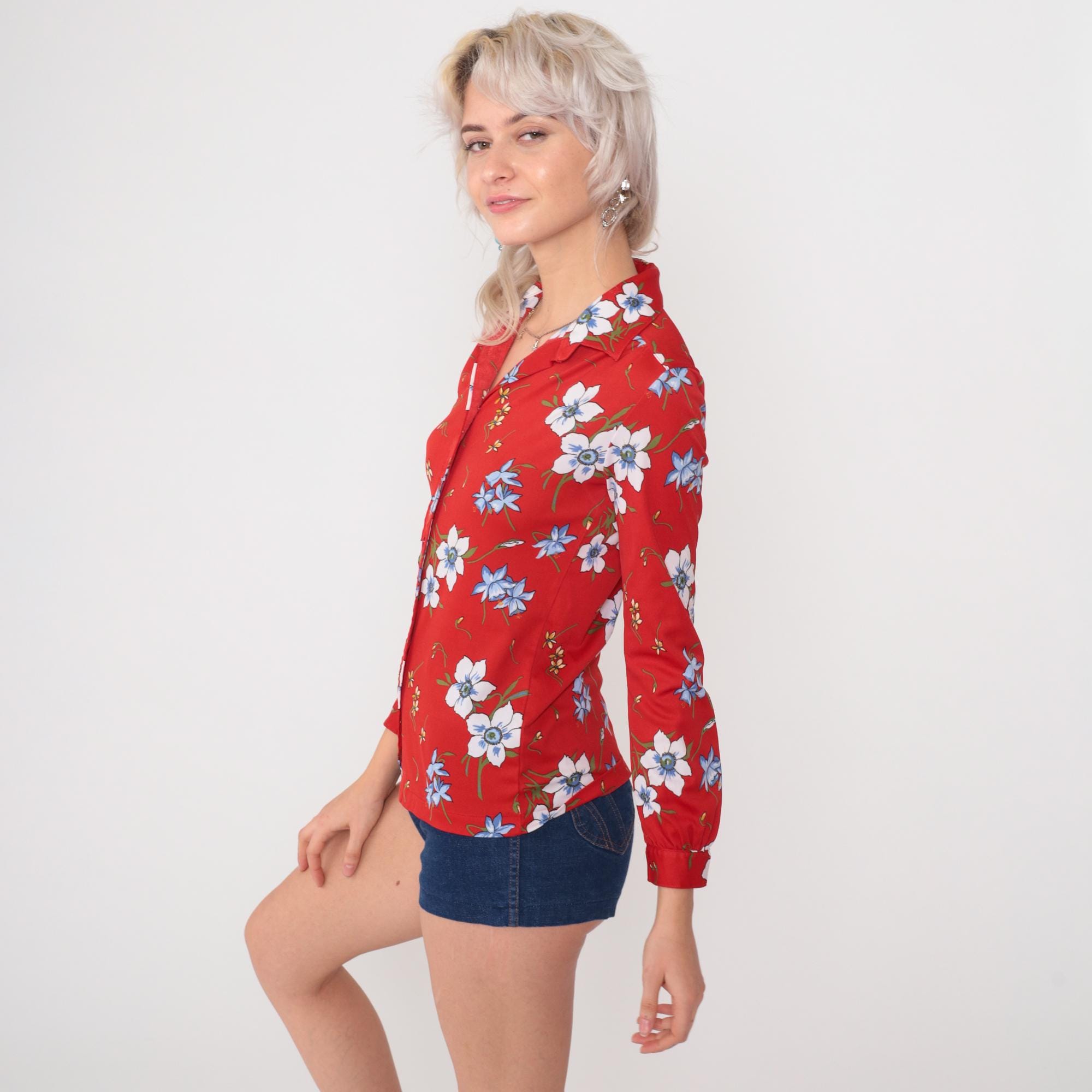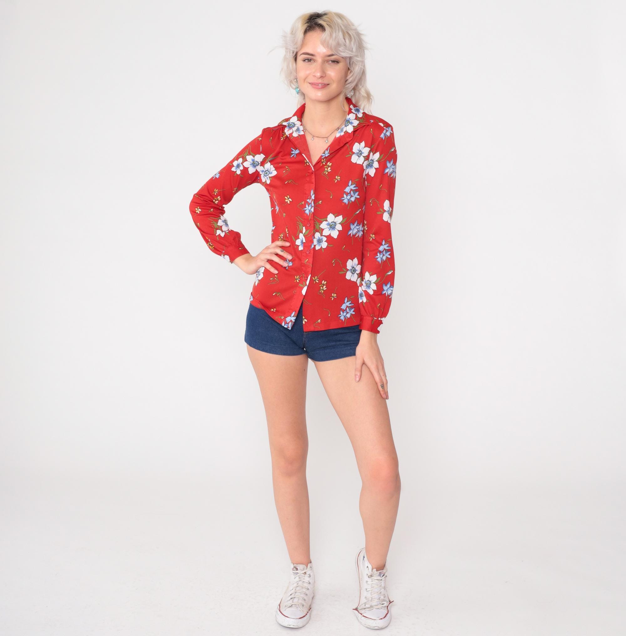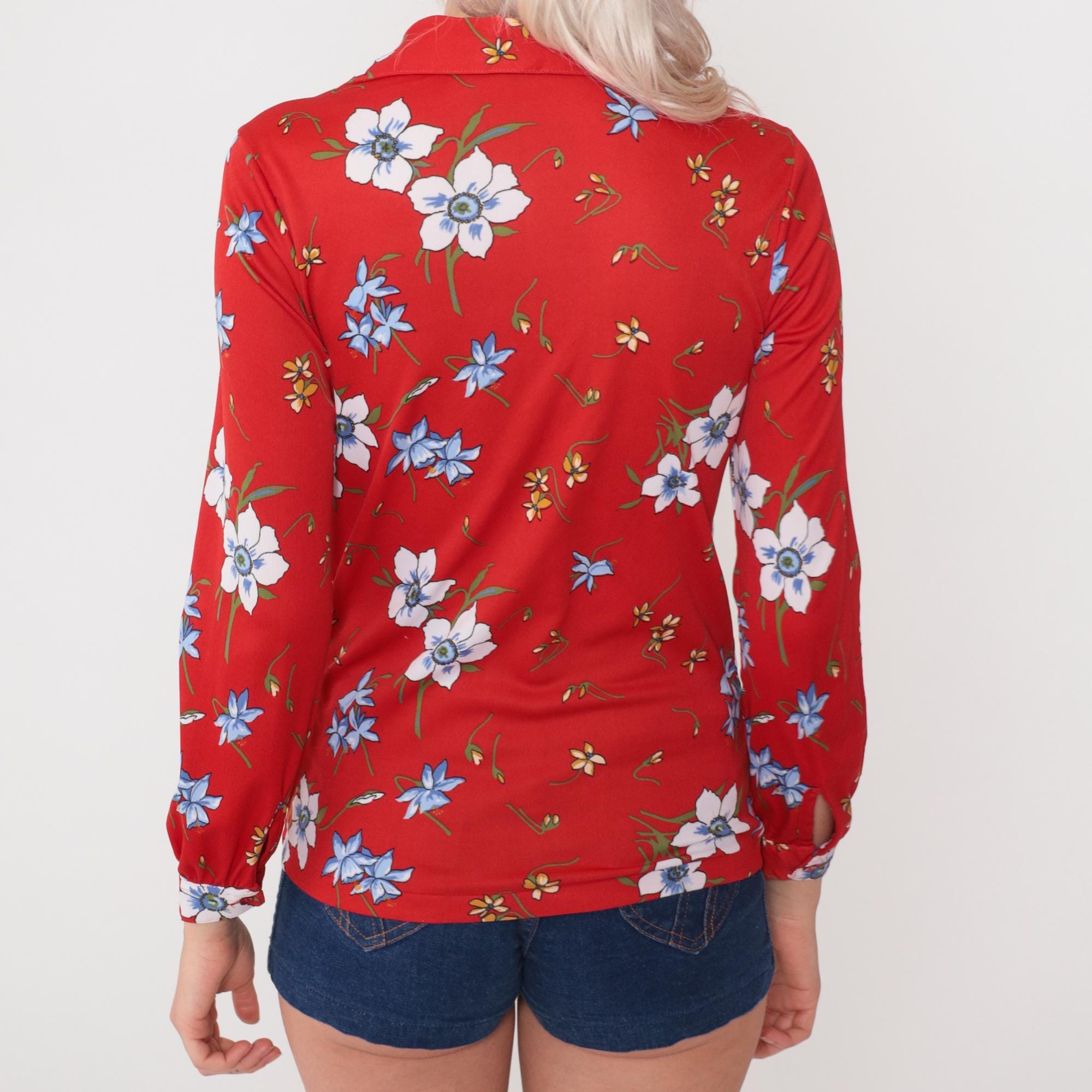 70s bright red polyester button-up blouse with white and blue floral print. Features a pointed collar, front button closure, and long sleeves.