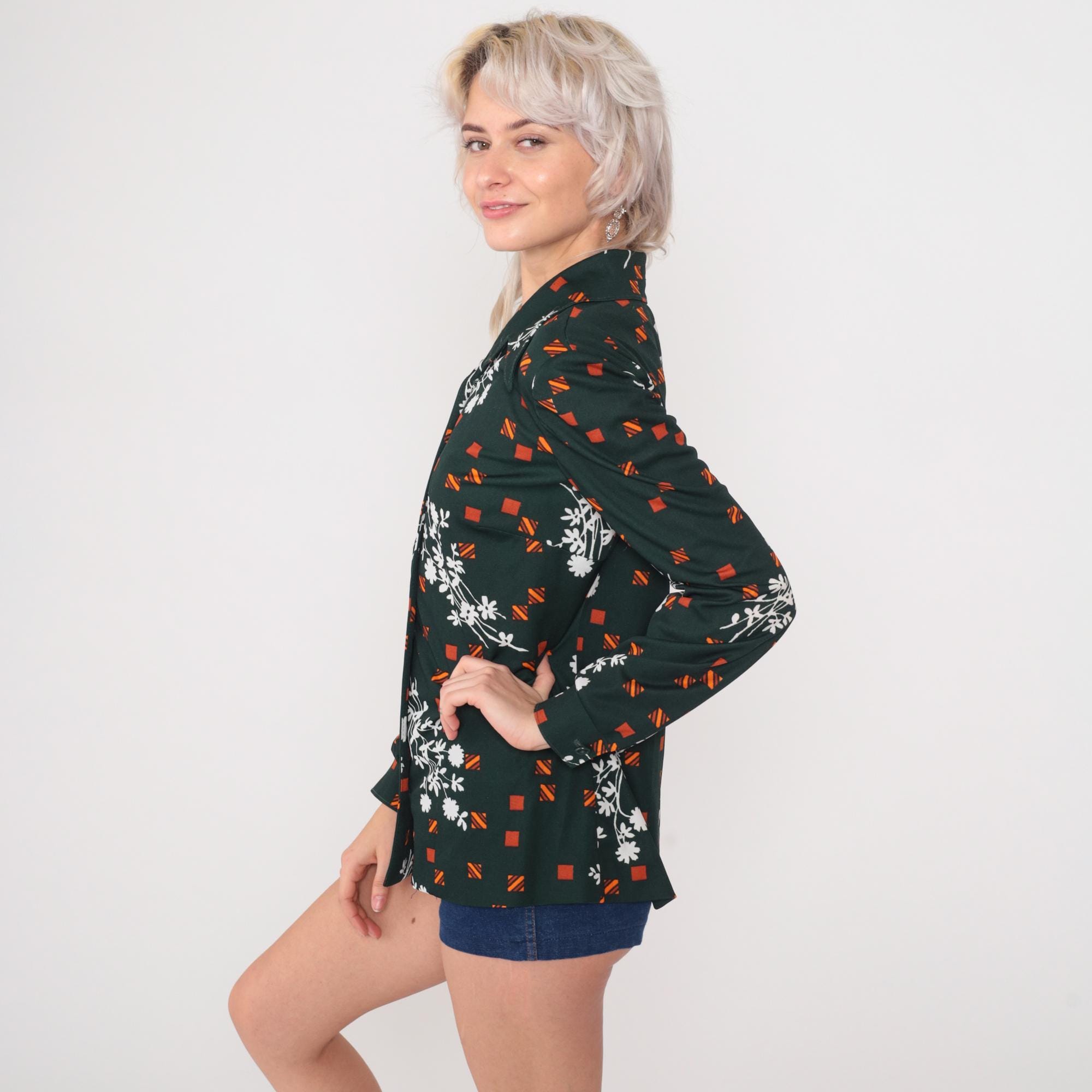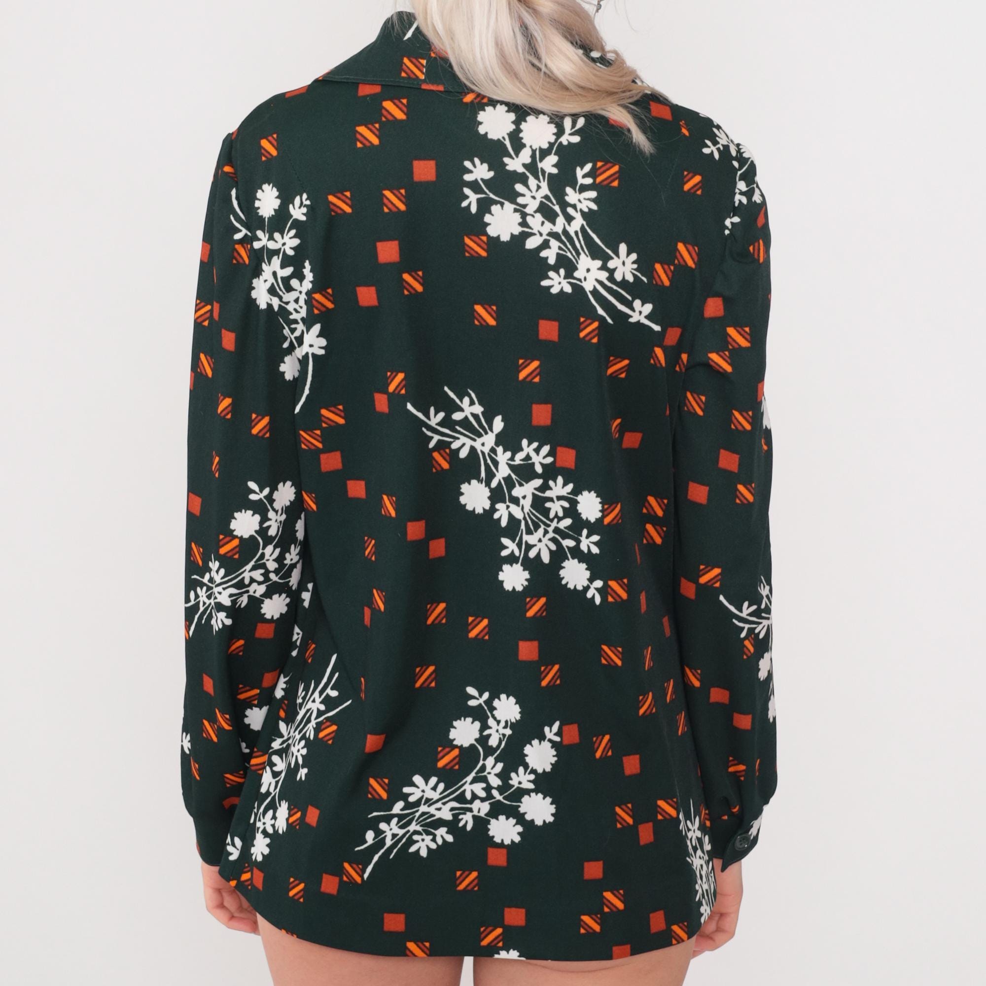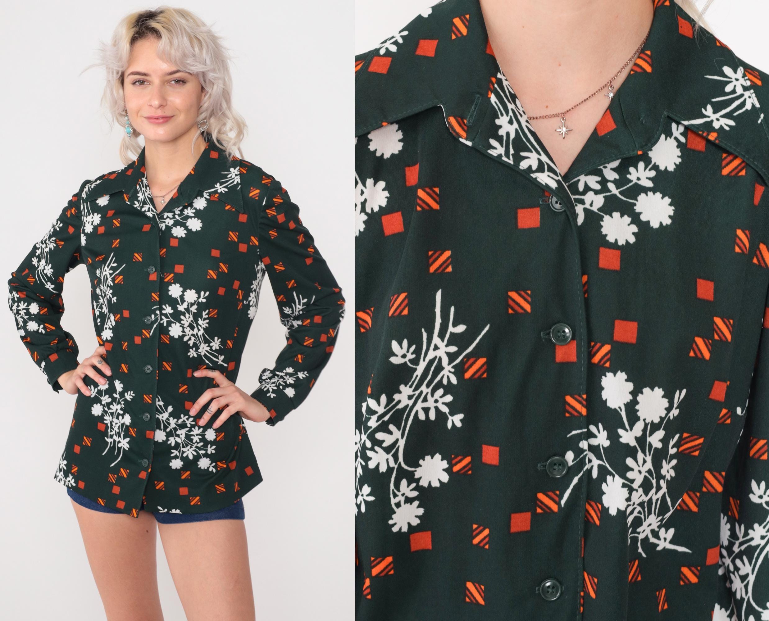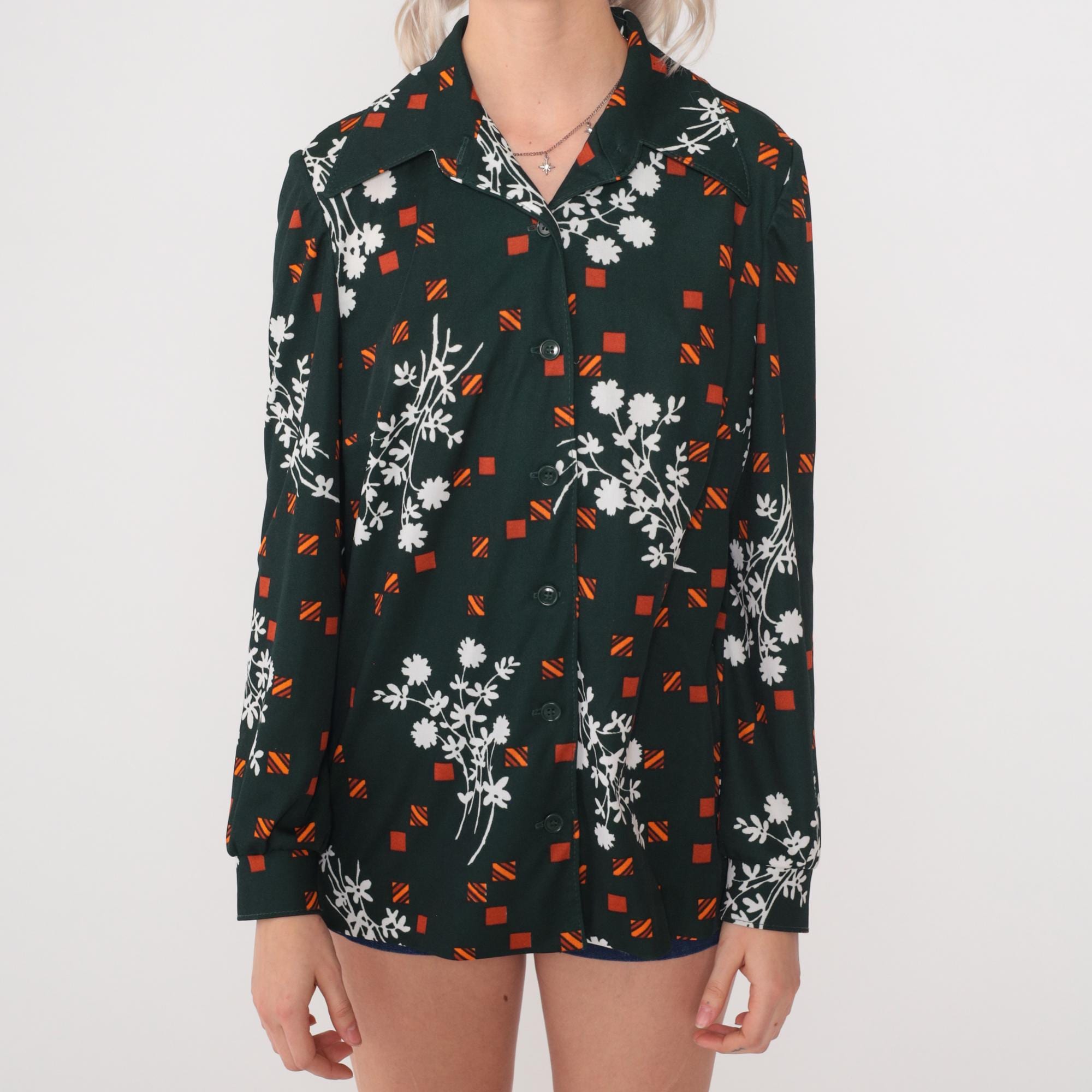 70s dark green polyester button-up shirt featuring white daisy floral sprays and orange geometric squares. Features a pointed collar, front button closure, and long sleeves.