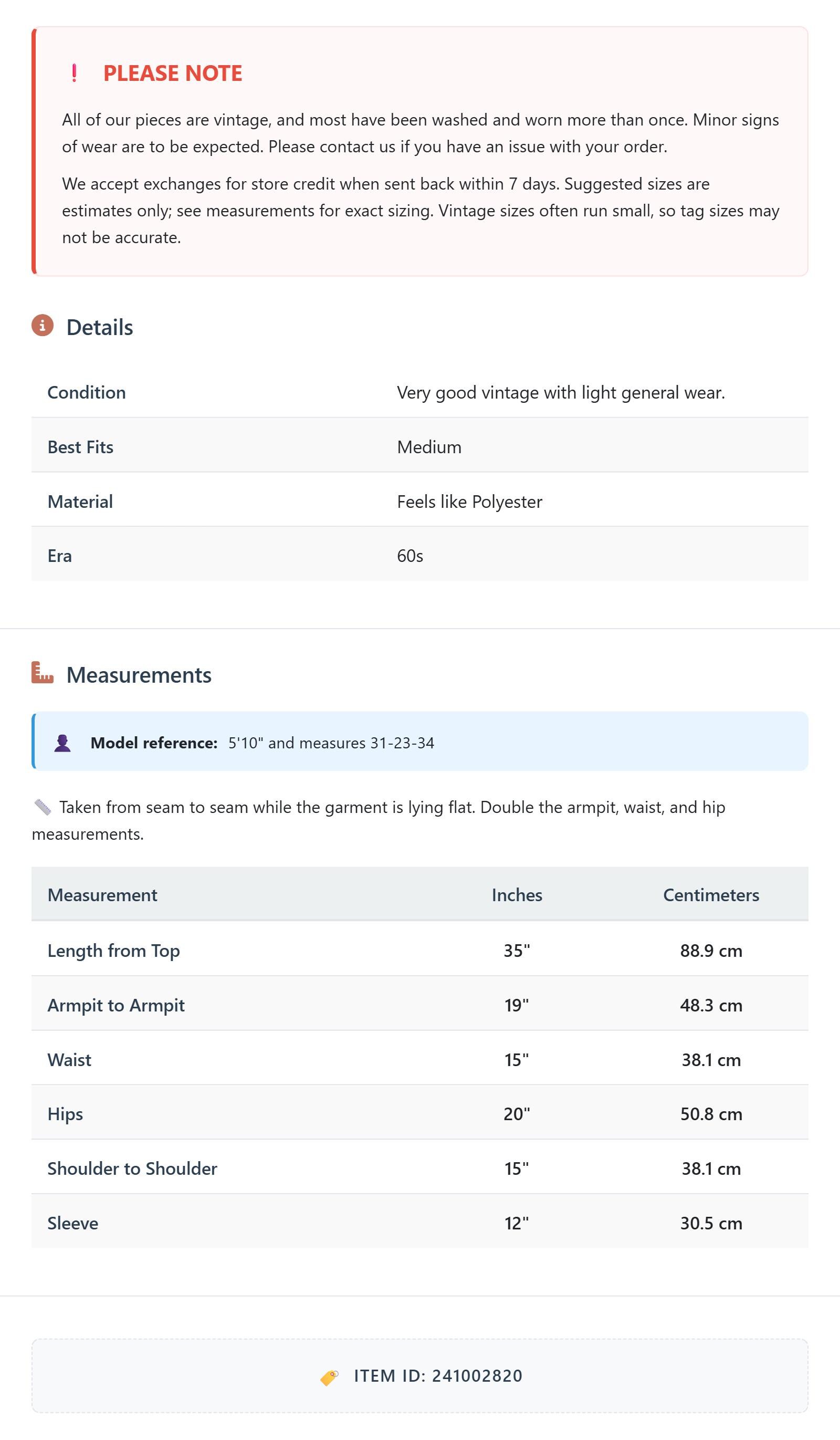 Suggested sizes are estimates only; see measurements for exact sizing. Vintage sizes often run small, so tag sizes may not be accurate.